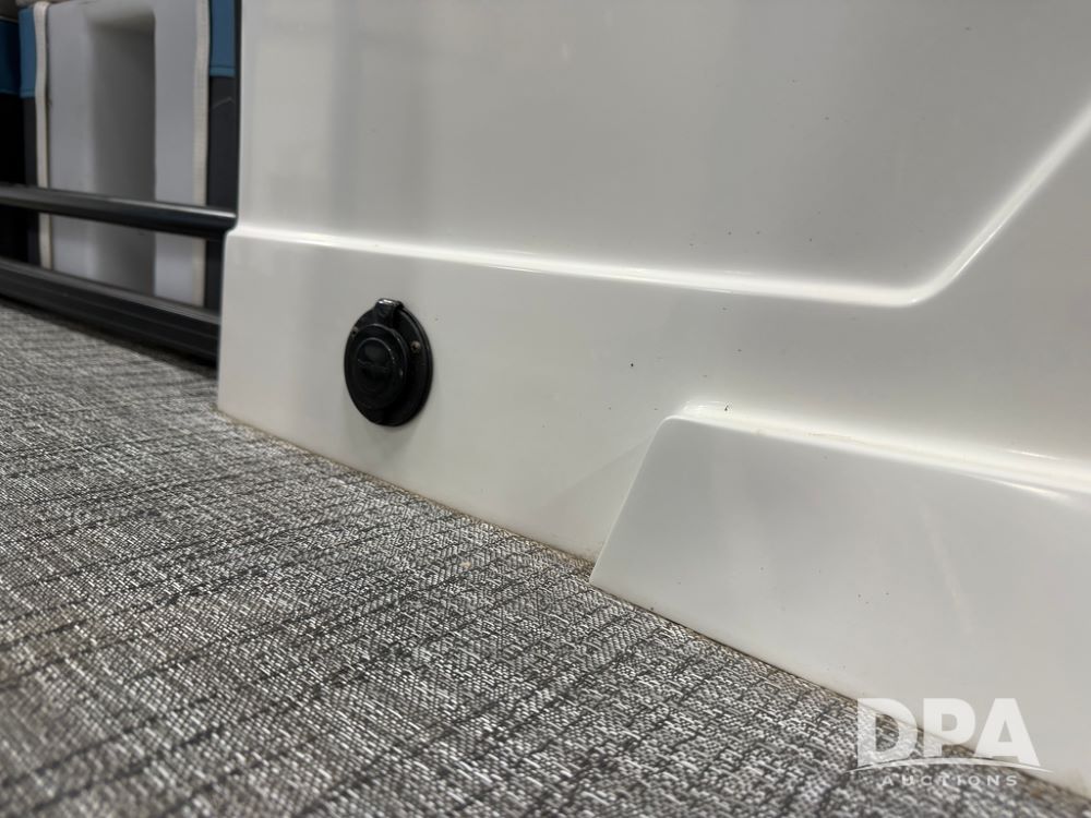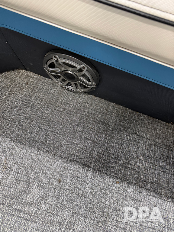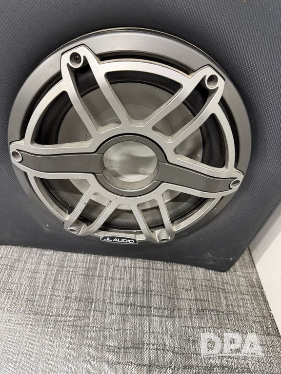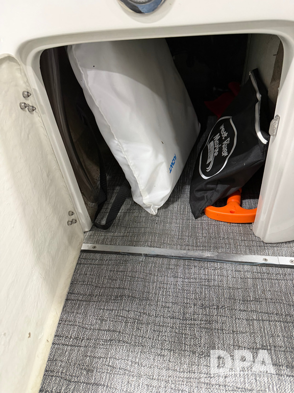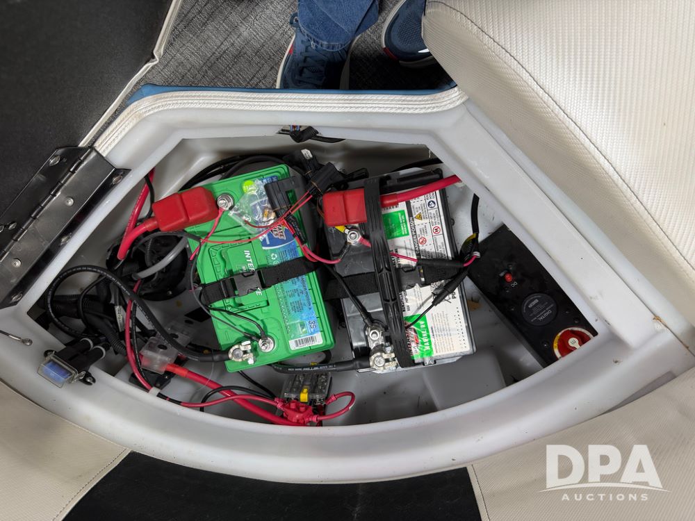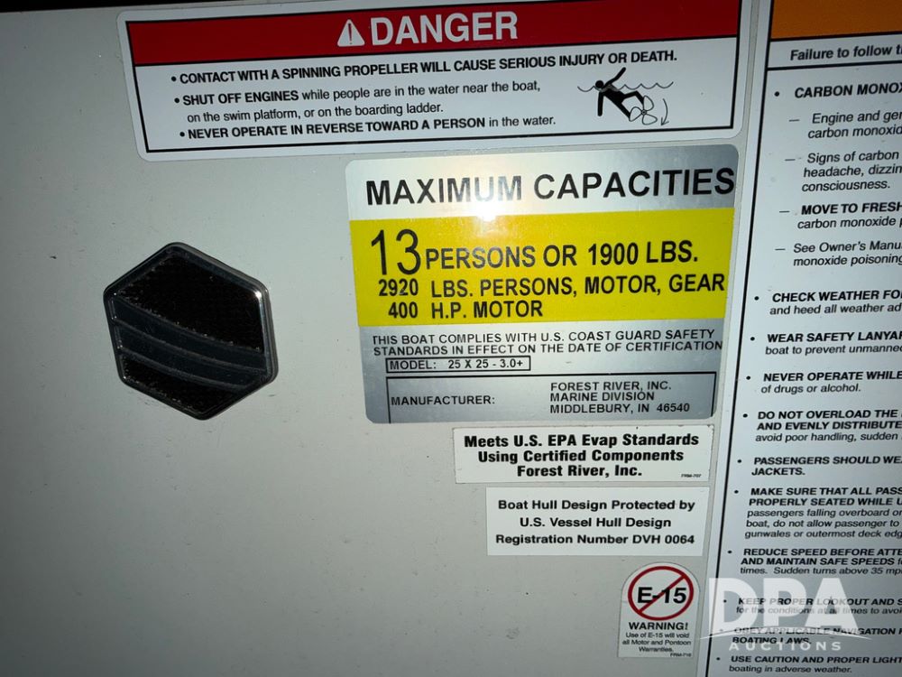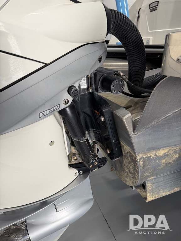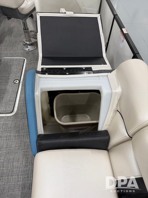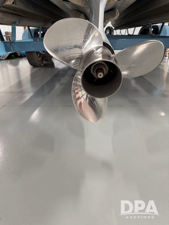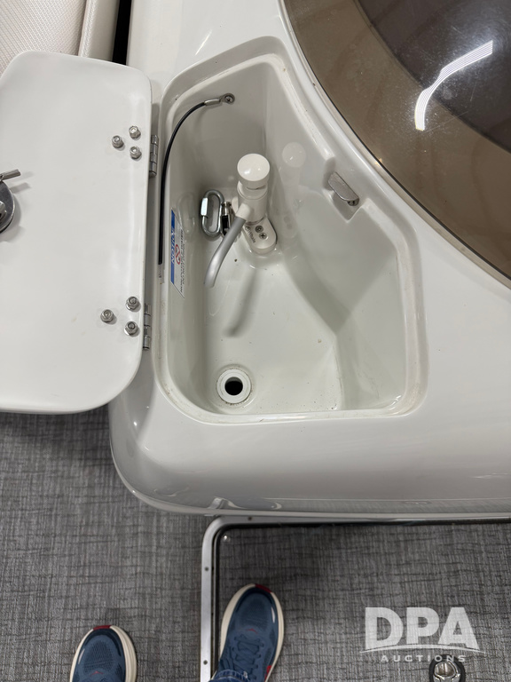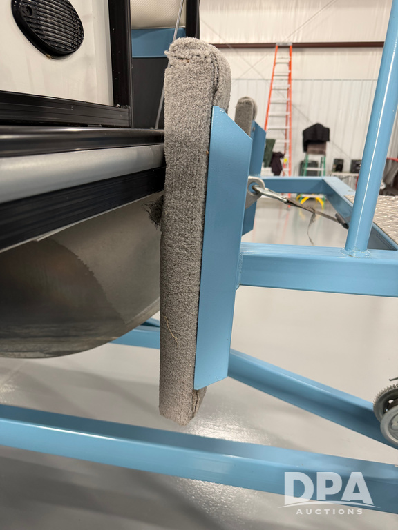 2019 South Bay 525E Arch Series 500 3.0+ Tri-Toon Pontoon (NP6559), loungers in front and rear, storage in floor, under dash and table, covered sink, overhead fiberglass canopy w/ extending Bimini sun shade, LED lights throughout and under water, Simrad LED display dash, JL Audio system and speakers, hidden trash area, double battery w/ shut off, rear 110V plug in, rear fuel cap, speed and depth finder alarms, tow frame, retractable ladder, 2019 Mercury Verado 350HP motor (S/N 2B603720), stainless steel prop, electric engine lift, 2018 Heritage tandem axle tri-toon trailer, LED lights, front ladder, rear retractable straps, spare tire, ONLY 144 hours.