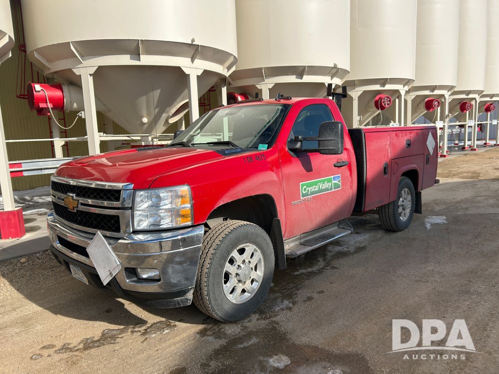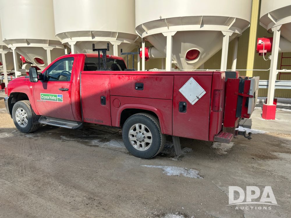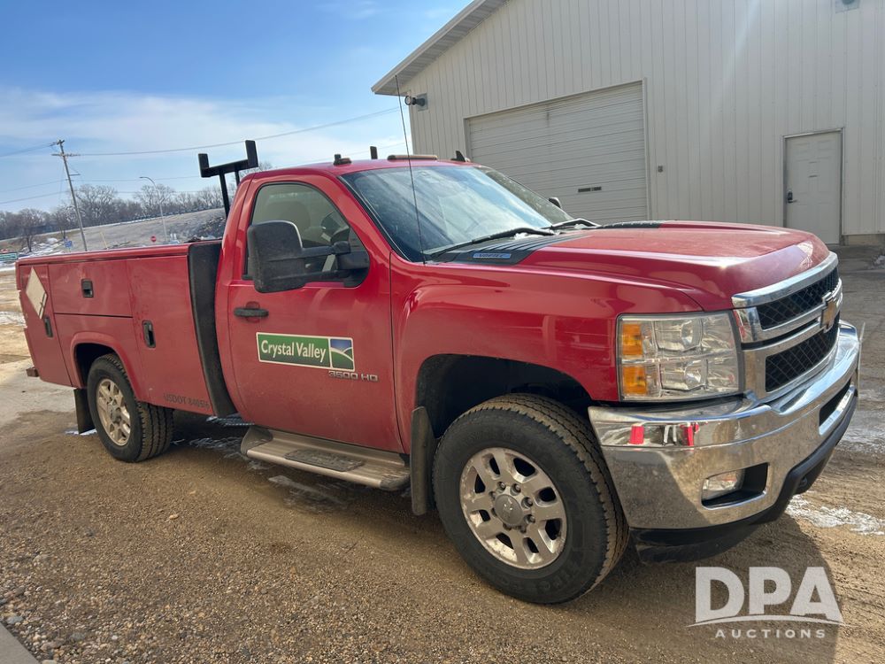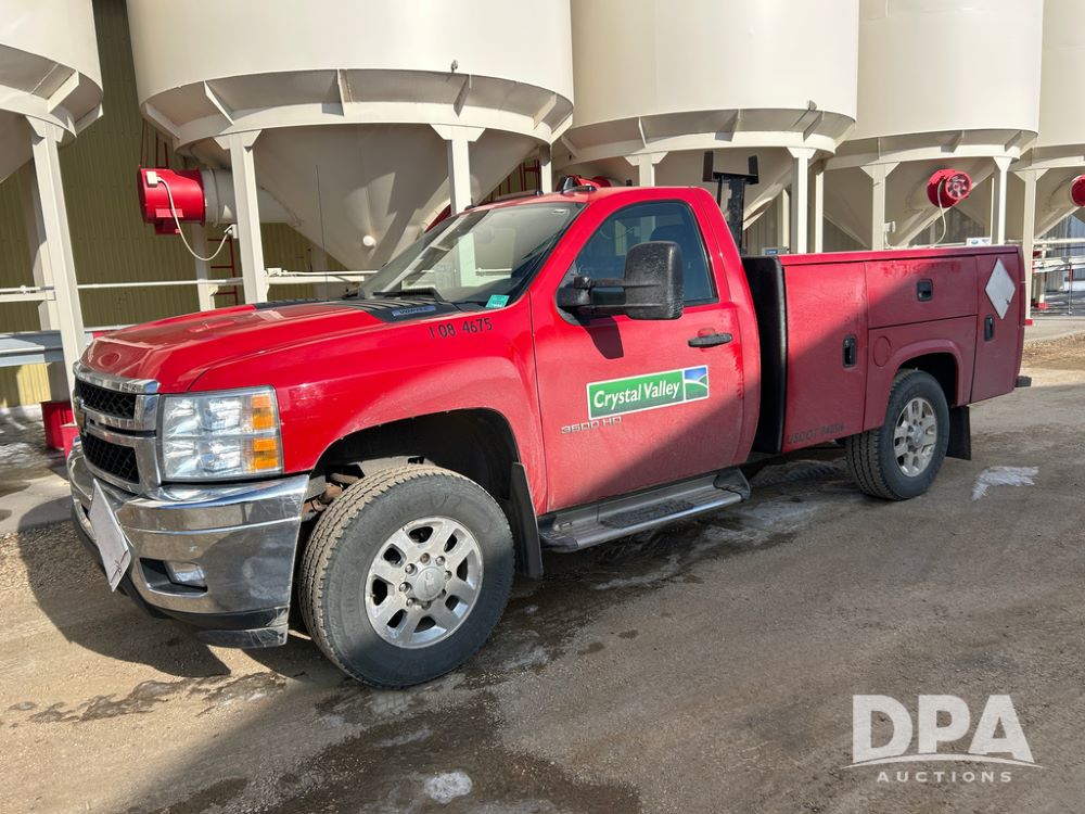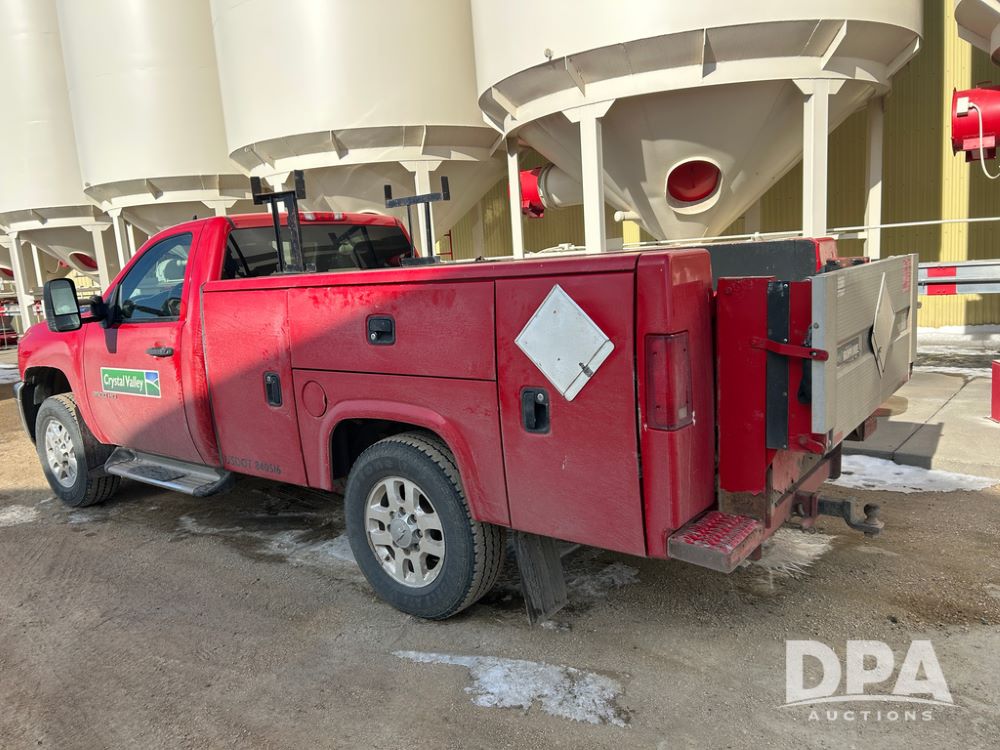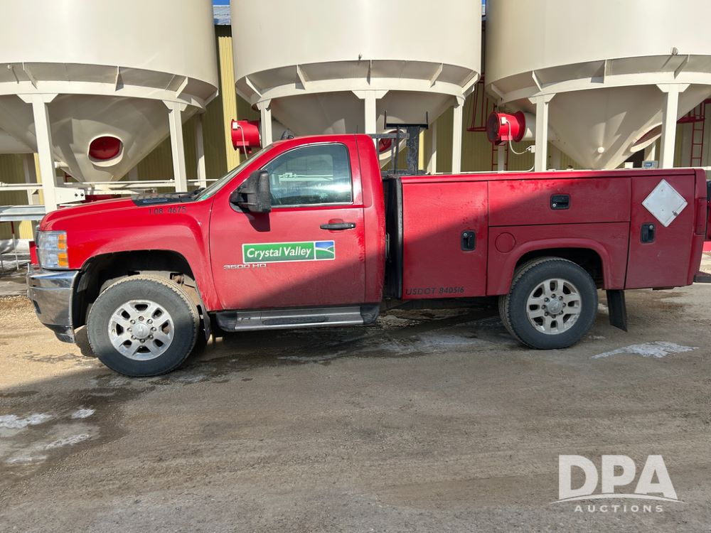 2014 Chevy 3500HD Service Truck (CP1736 Unit 4675), LP gas engine, automatic transmission, 4X4, 6 door steel service box, Tommy Lift electric tailgate, running boards, rear receiver hitch, power windows, locks and doors, cruise control, odometer reads 154,680 miles.