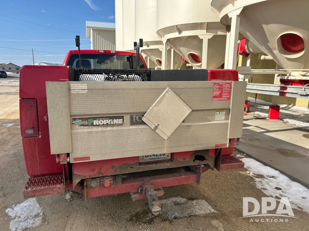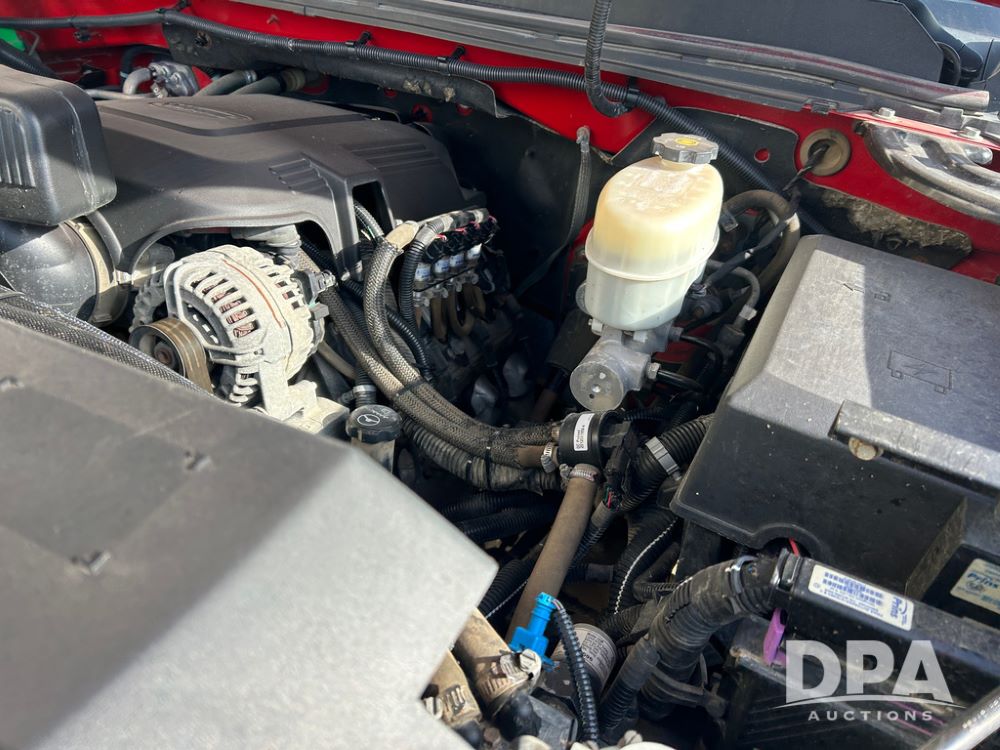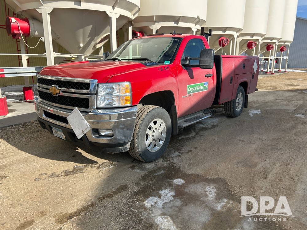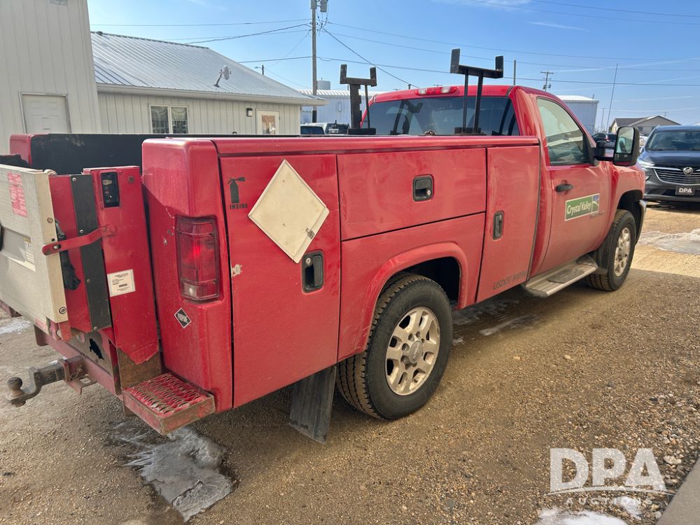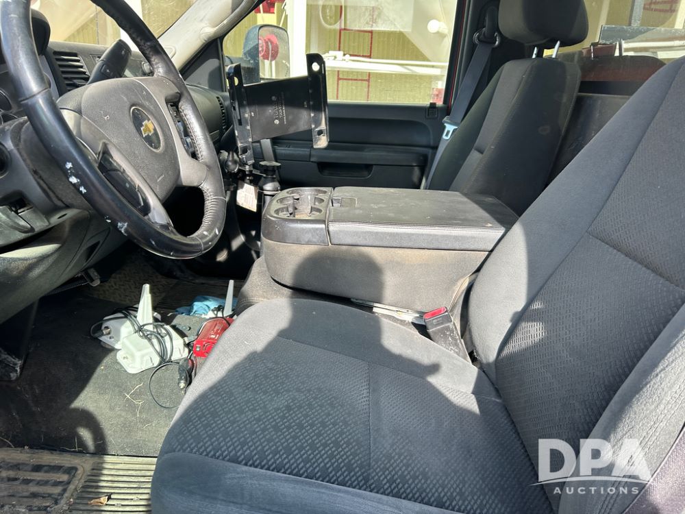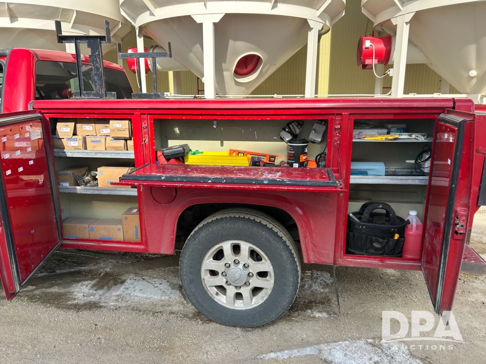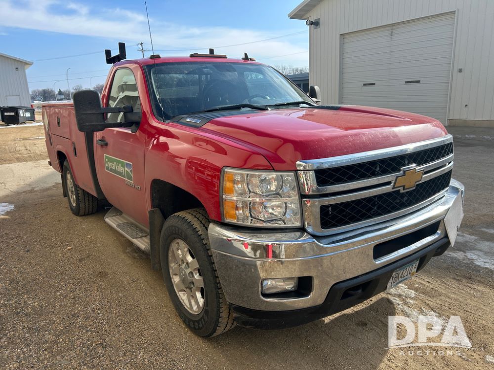 2014 Chevy 3500HD Service Truck (CP1736 Unit 4675), LP gas engine, automatic transmission, 4X4, 6 door steel service box, Tommy Lift electric tailgate, running boards, rear receiver hitch, power windows, locks and doors, cruise control, odometer reads 154,680 miles.