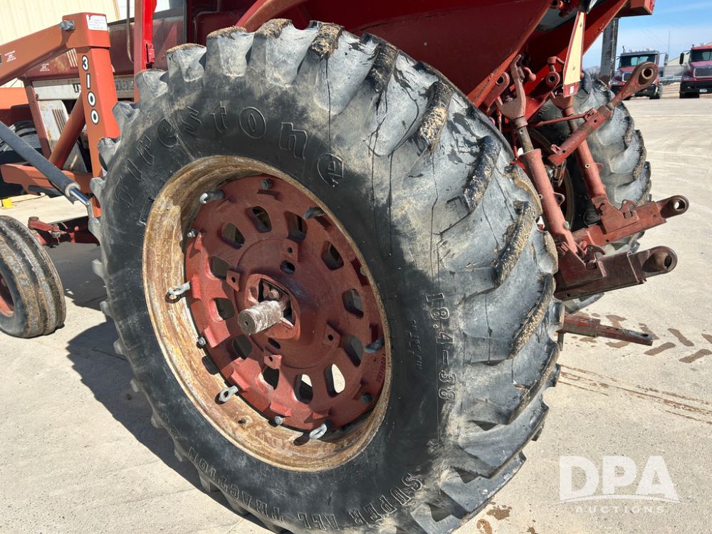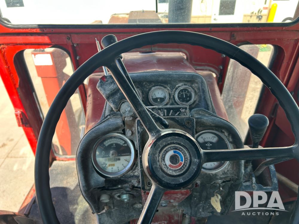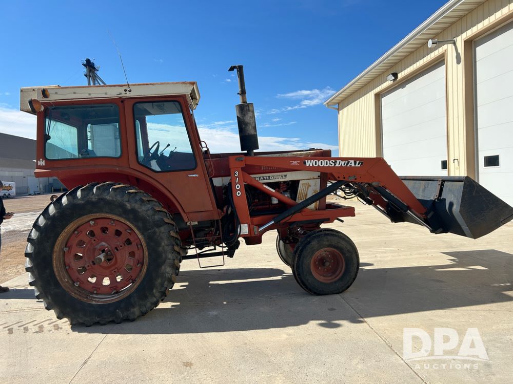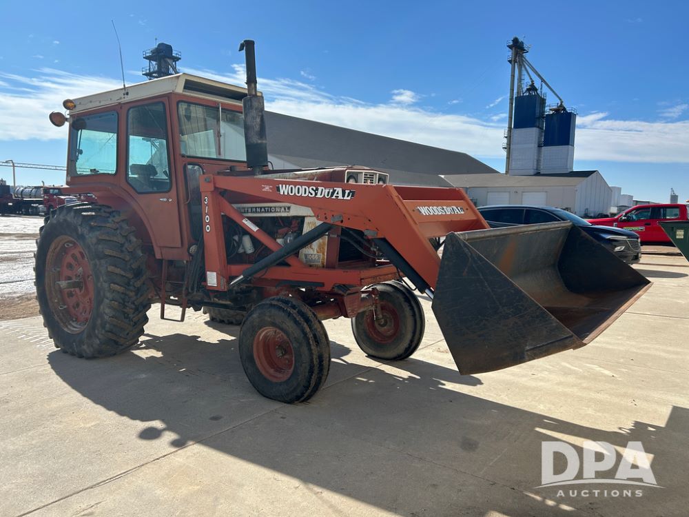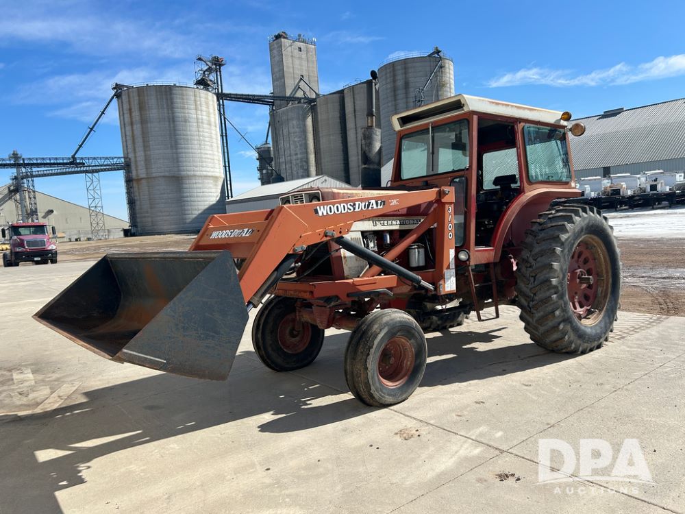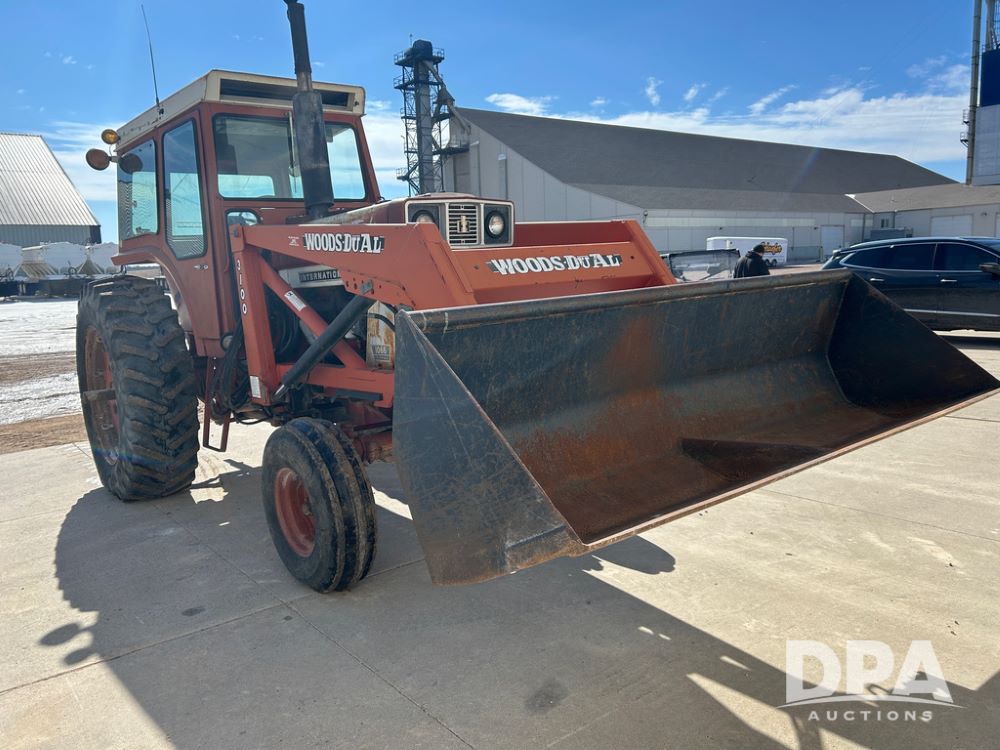 International 1066 Tractor (CP1752), diesel engine, 4 speed hi/lo transmission, torque amplifier, Woods Dual 3100 hydraulic front loader, 96'' front bucket, joy stick cab controls, enclosed cab, dual rear PTO's, dual remote hydraulic outlets, 3 point rear hitch, wide front end, 18.4-38 rear tires,