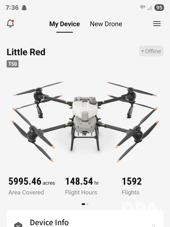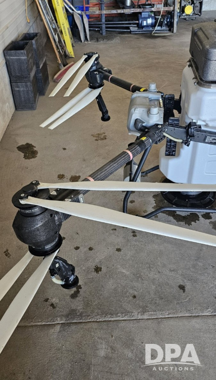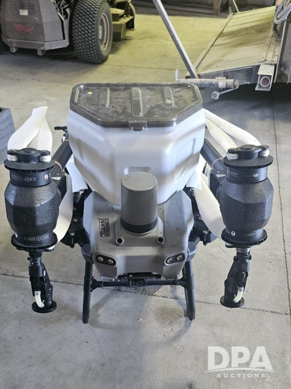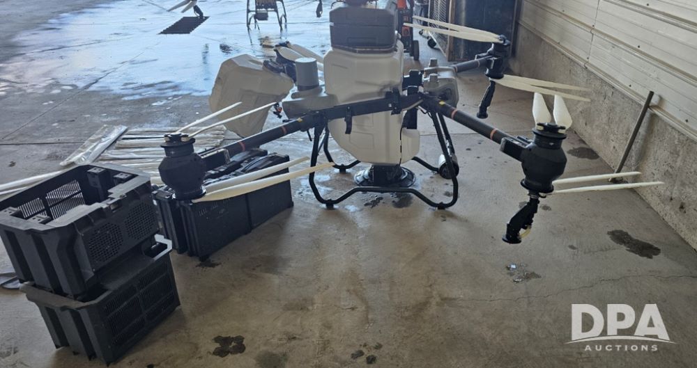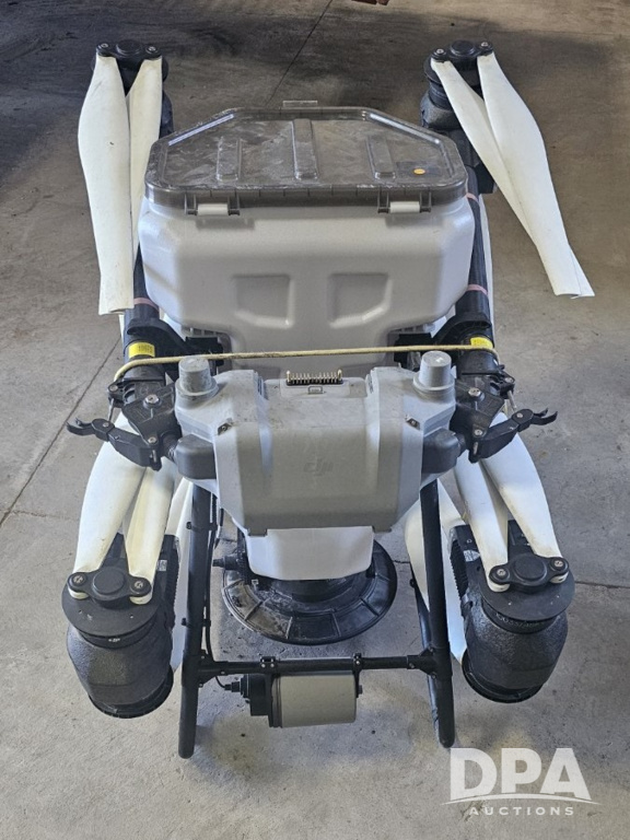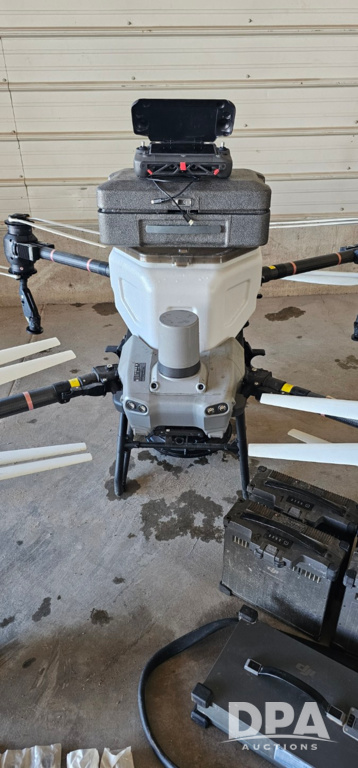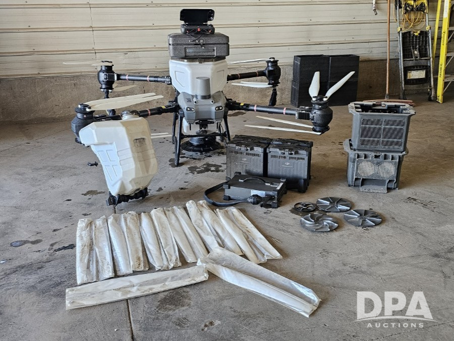 2025 DJI Agras T50 Drone (MN1257), spraying system, extended dry spreader box with spinner, (2) nozzles on back arms, (4) drone batteries, (2) cooling station, battery C10000 charger, remote with charging cord (no cube, controller has a sun shade on it), extra set of propellers (minus 1), 148.54 flight hours, 5,995.46 acres covered, 1,592 flights.
