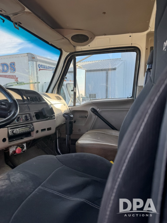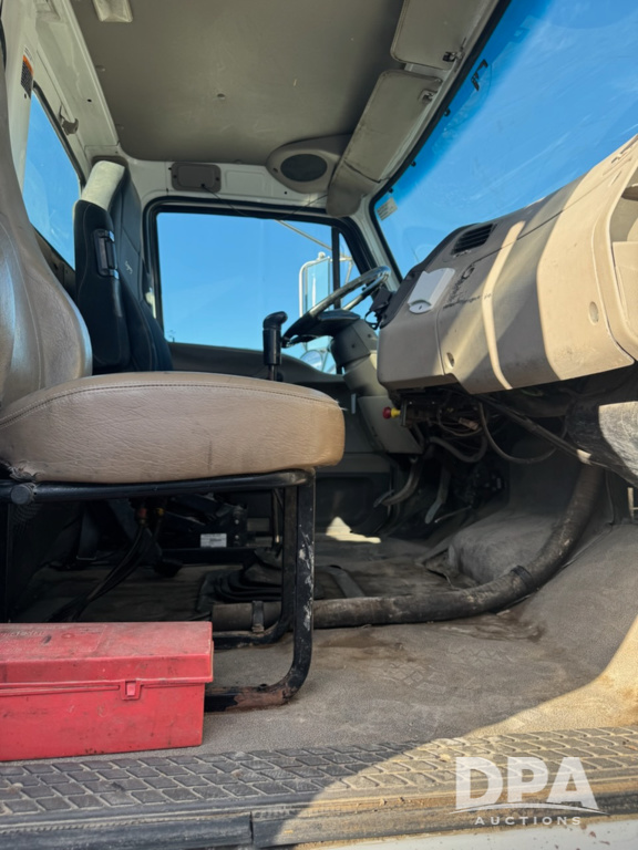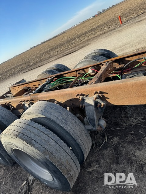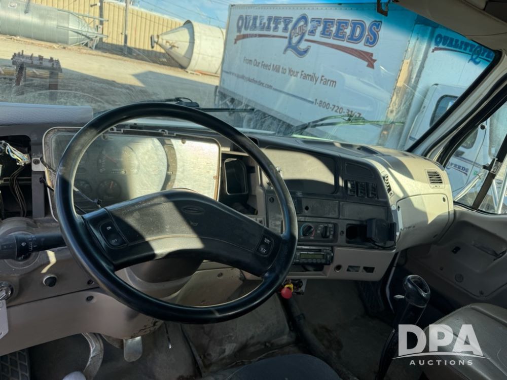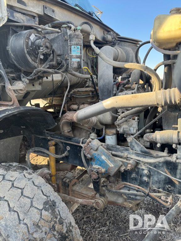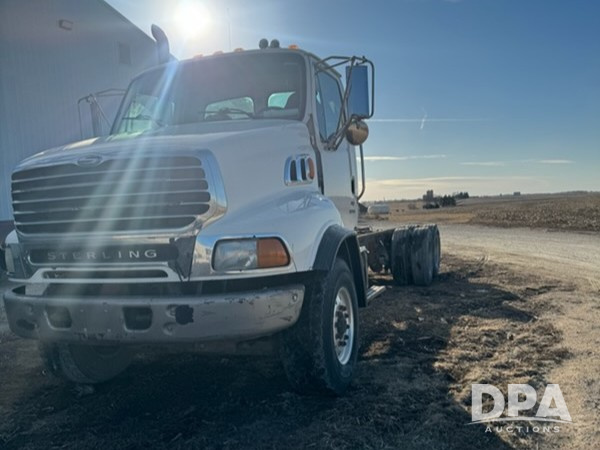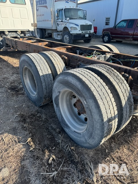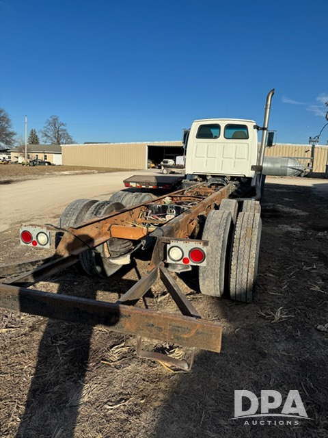 2003 Sterling LT8500 Cab/Chassis (MN1237), heavy duty truck, Caterpillar 3126B diesel engine, Eaton Fuller RT 8608L 10 speed manual transmission, PTO, heat and air conditioning, radio, Meritor MFS 20 133ANN1 steer axle (18,740lb weight), and dual Meritor 20 145 rears (40,000lb weight) with 3.90 ratios, 58,740lb GVWR, air ride suspension (FA240000), 424in rail length, 256in wheelbase, 11R22.5 tires, shows 679,491 miles.