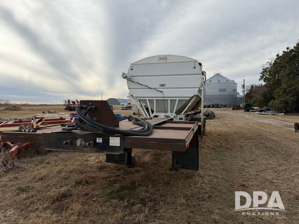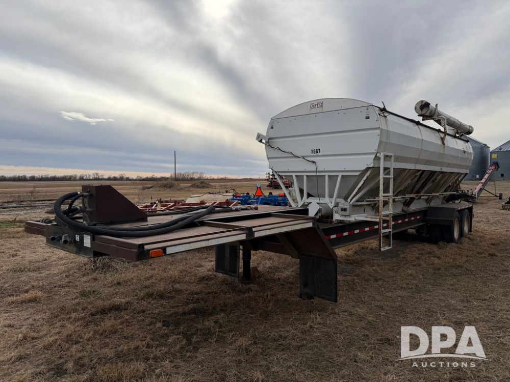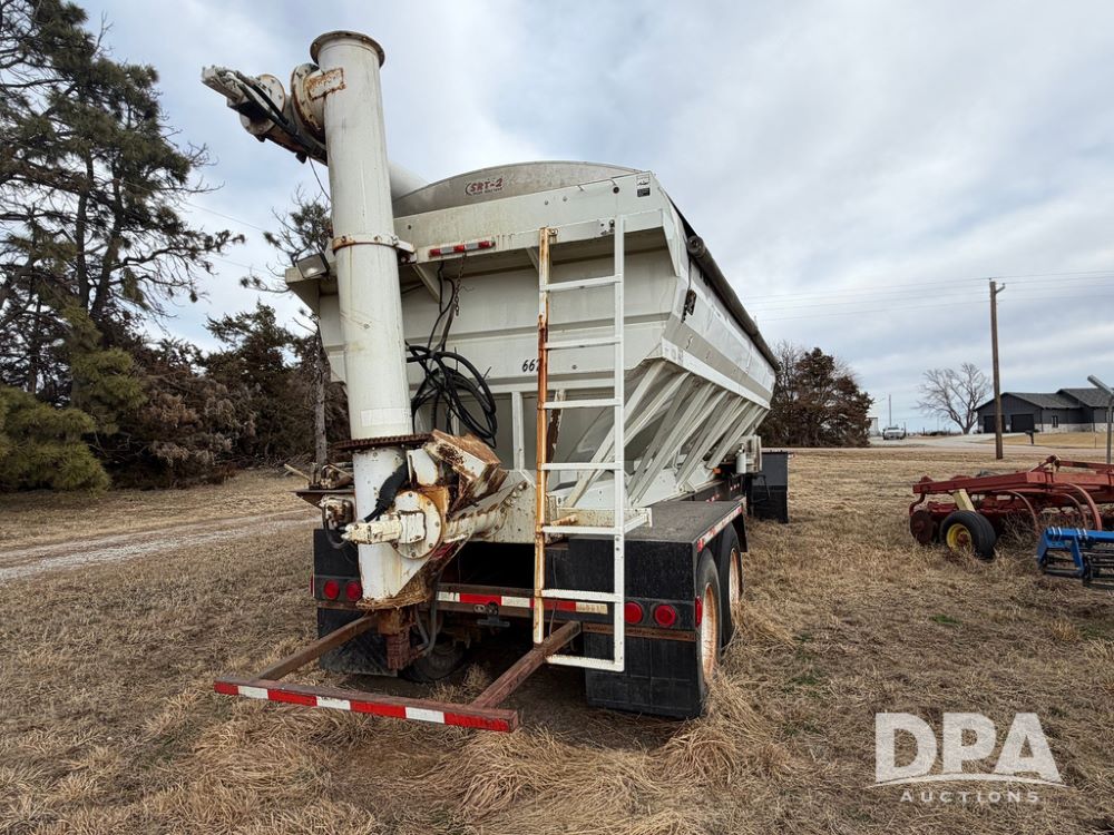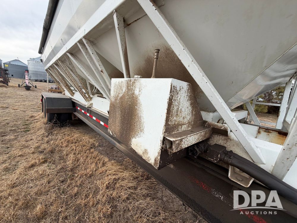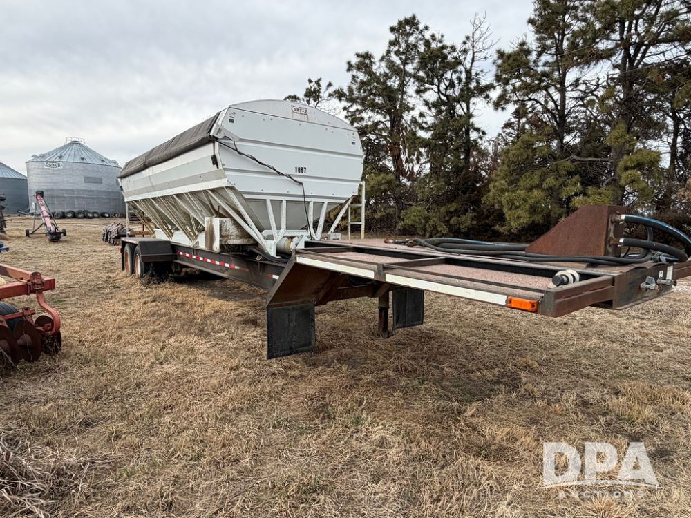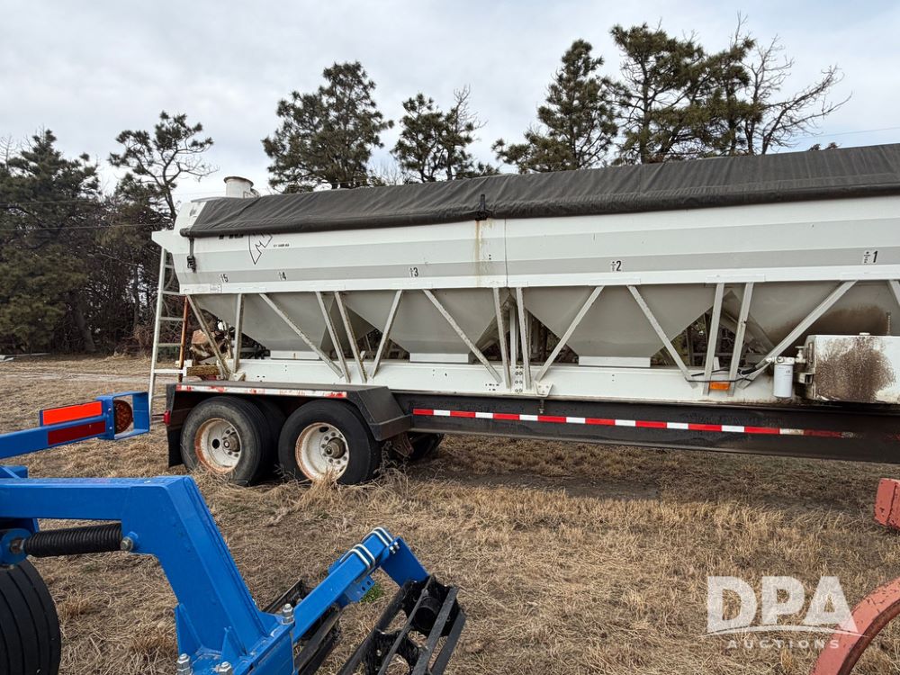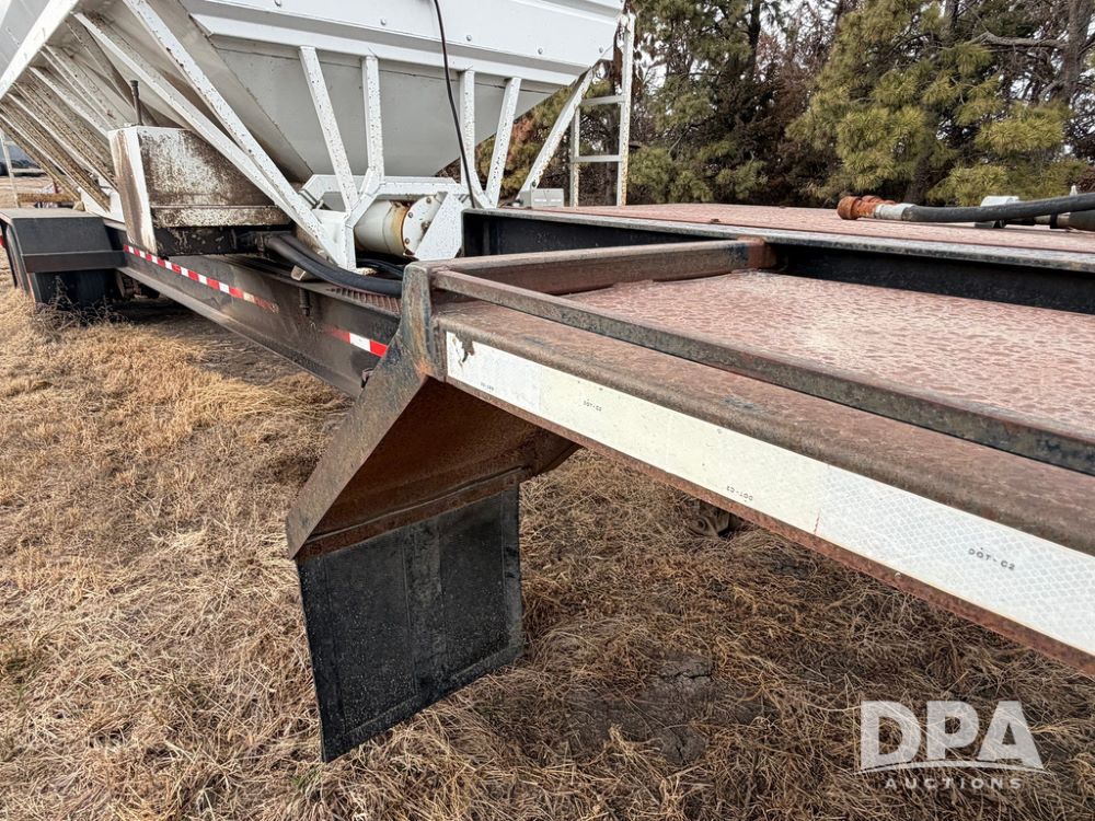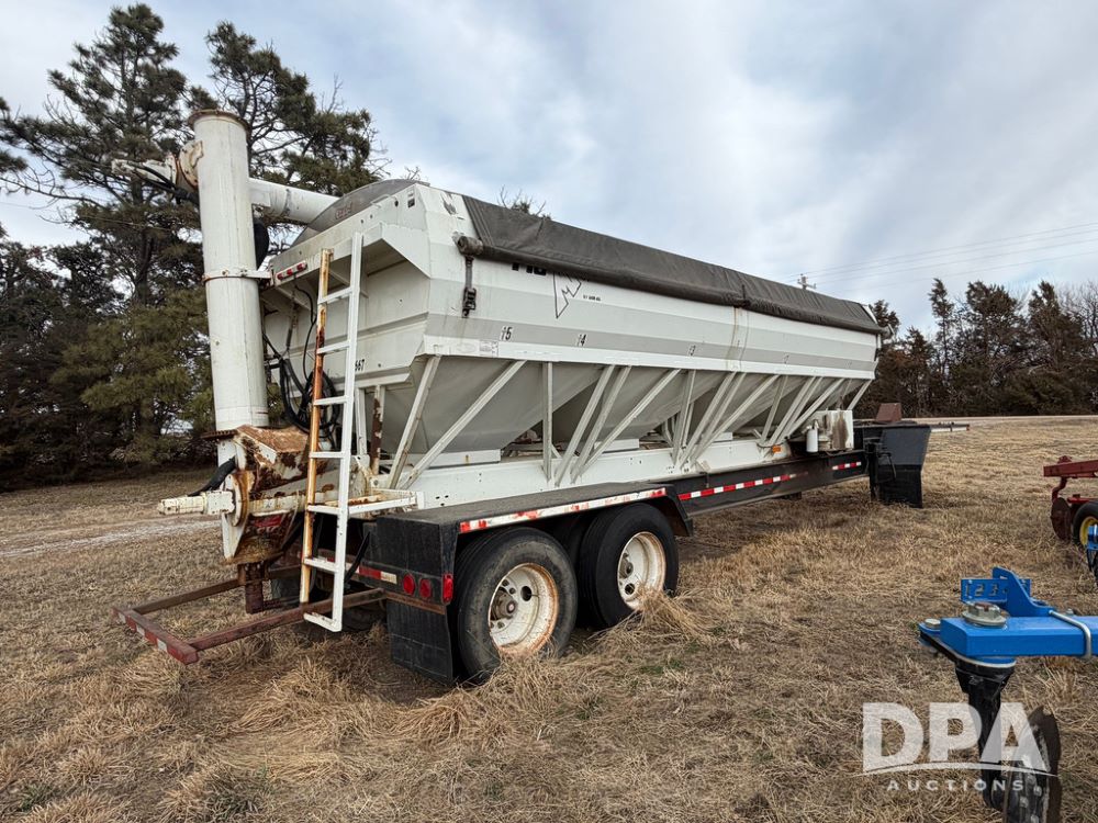 2002 Bauer Built Dry Tender Trailer (RR0613), 38-ft Bauer Built trailer, 11-ft top deck, 28-ft lower deck, air brakes, Loral Flomax compartment dry tender (SN:FM1069), 5 bins, electric SRT-2 roll over tarp, 16-ft unloading swing out top auger, rear controls, rear discharge, 11R22.5 tires.