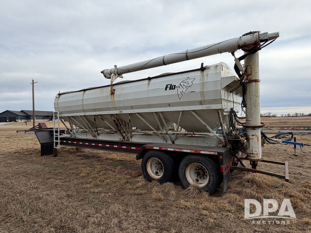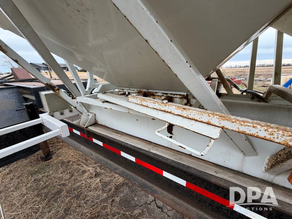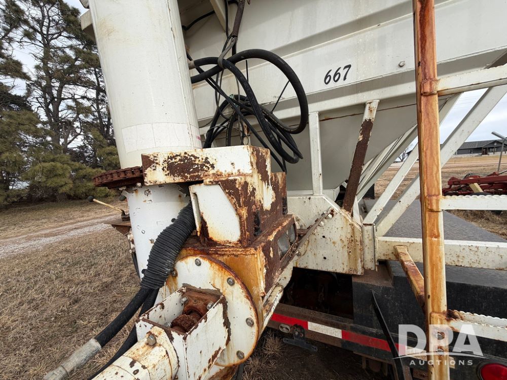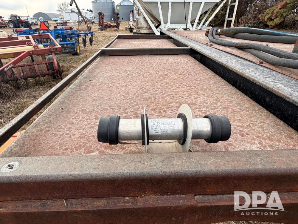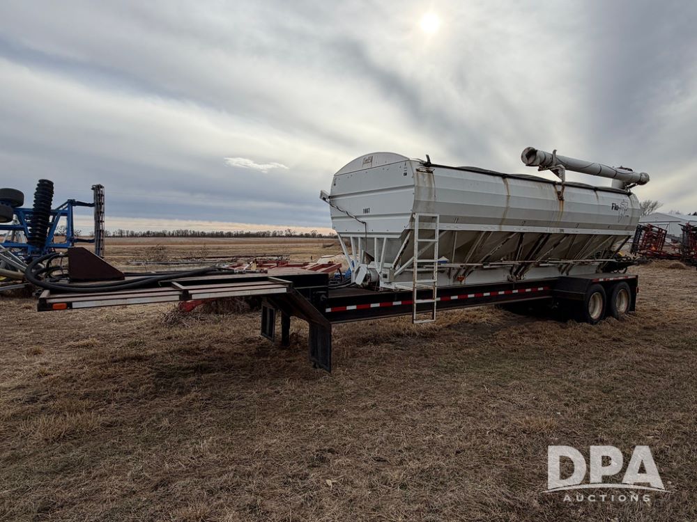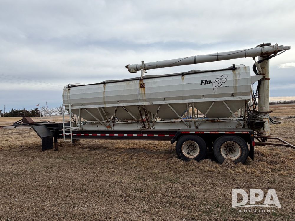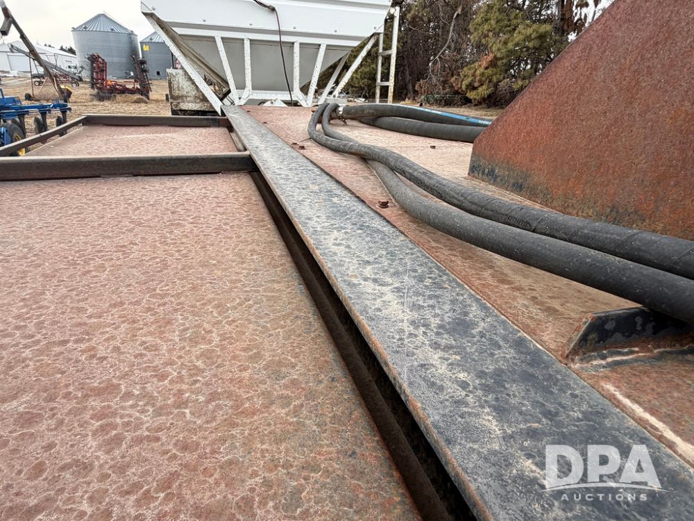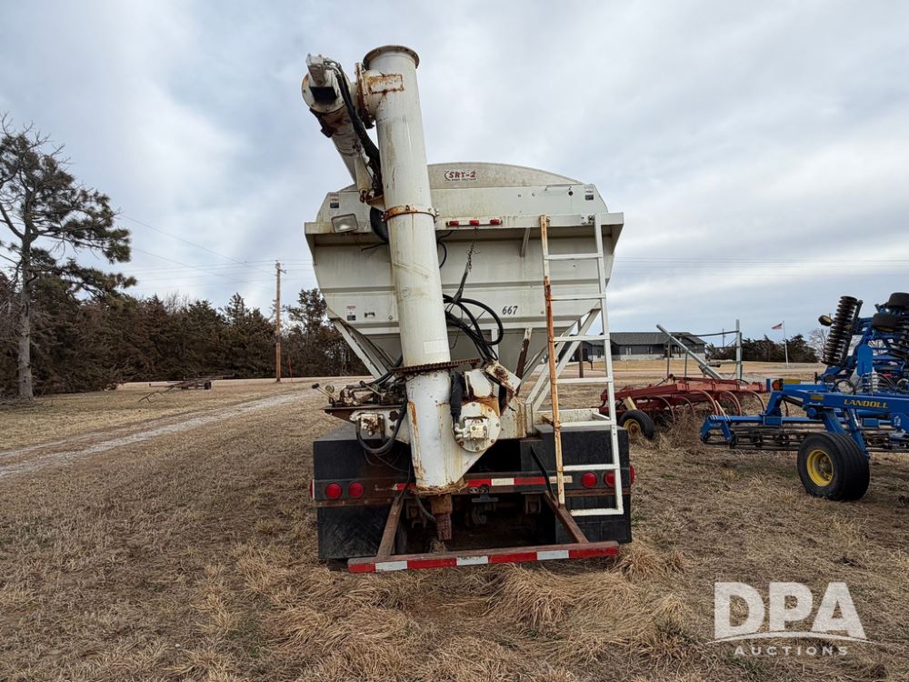 2002 Bauer Built Dry Tender Trailer (RR0613), 38-ft Bauer Built trailer, 11-ft top deck, 28-ft lower deck, air brakes, Loral Flomax compartment dry tender (SN:FM1069), 5 bins, electric SRT-2 roll over tarp, 16-ft unloading swing out top auger, rear controls, rear discharge, 11R22.5 tires.