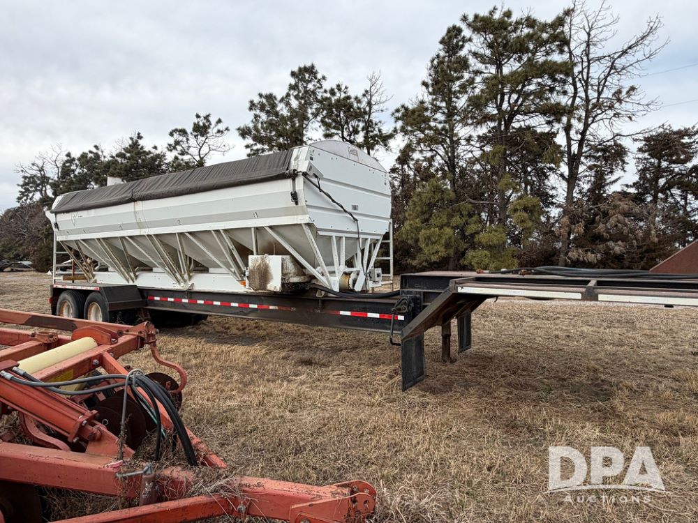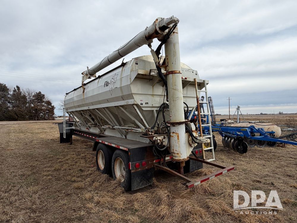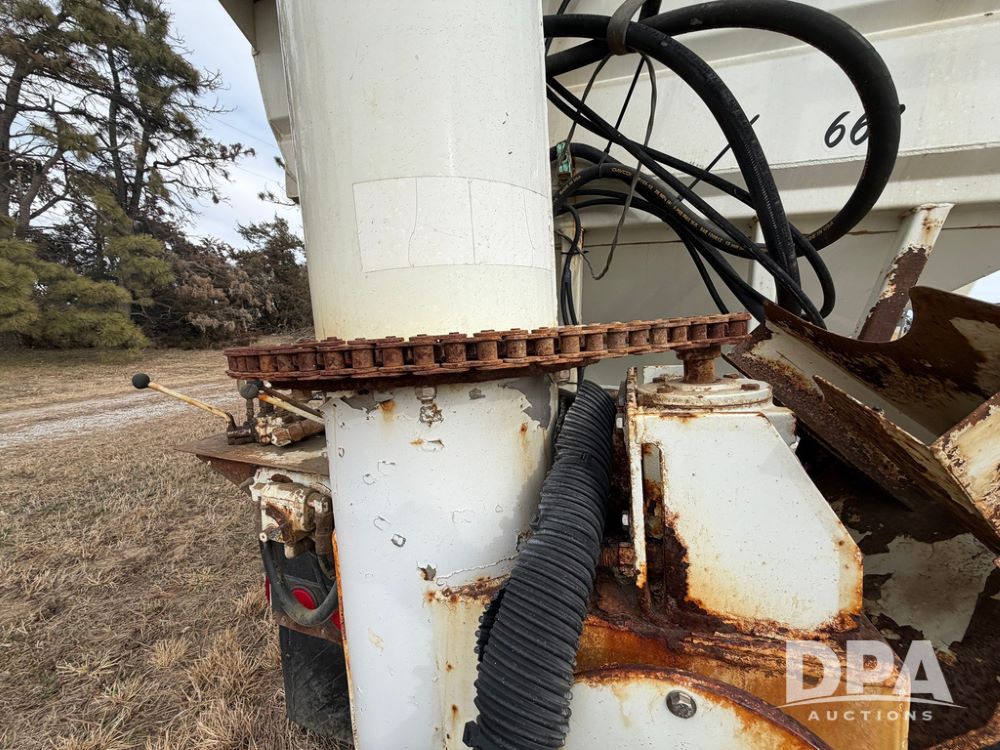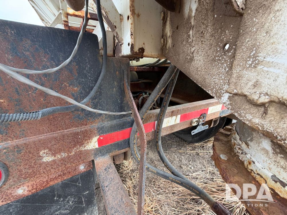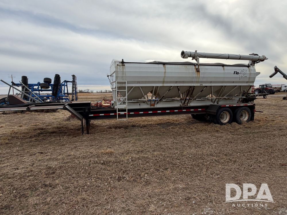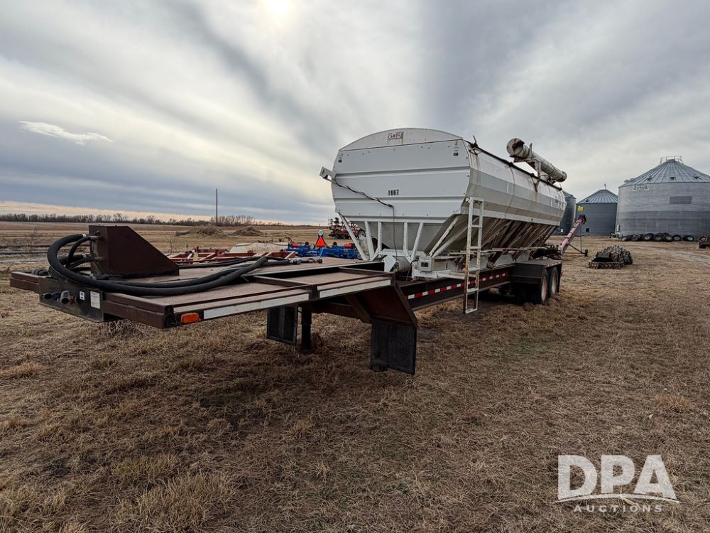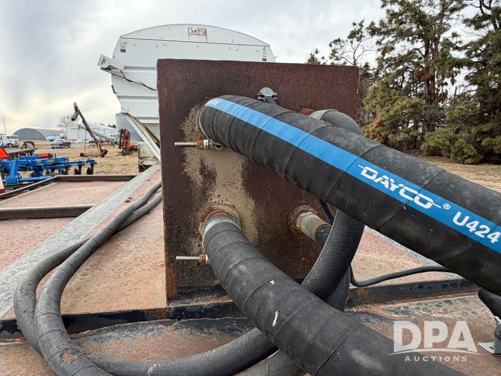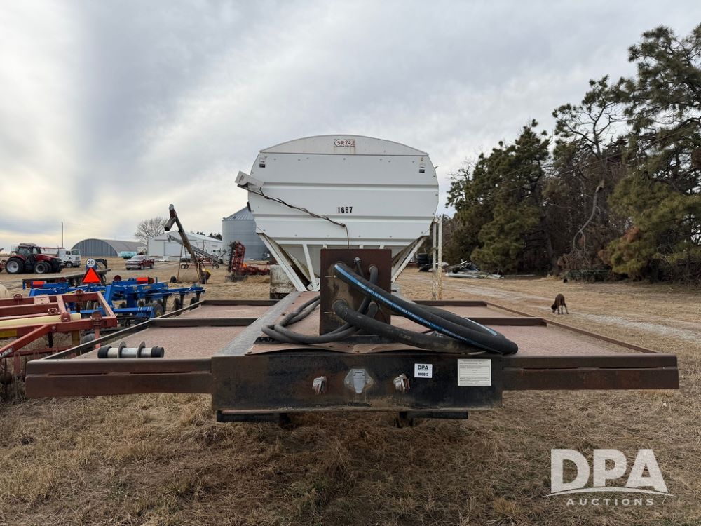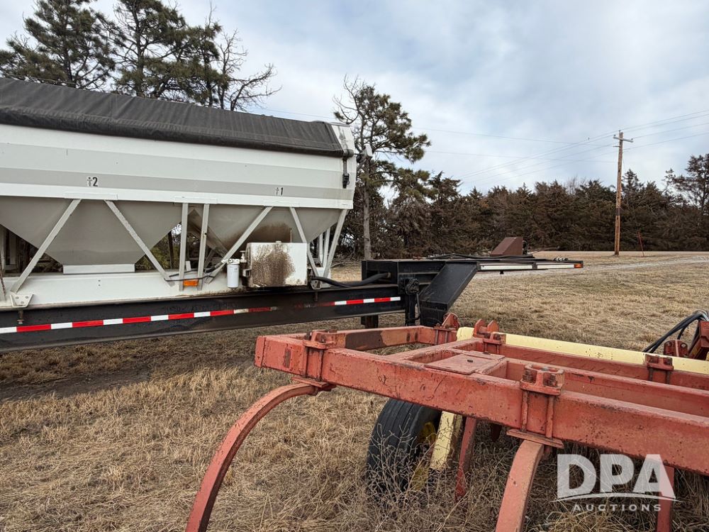 2002 Bauer Built Dry Tender Trailer (RR0613), 38-ft Bauer Built trailer, 11-ft top deck, 28-ft lower deck, air brakes, Loral Flomax compartment dry tender (SN:FM1069), 5 bins, electric SRT-2 roll over tarp, 16-ft unloading swing out top auger, rear controls, rear discharge, 11R22.5 tires.