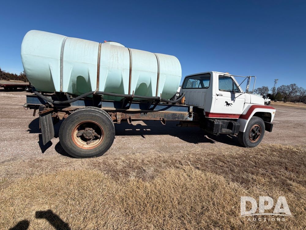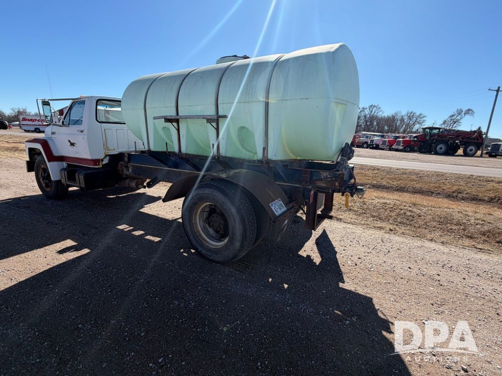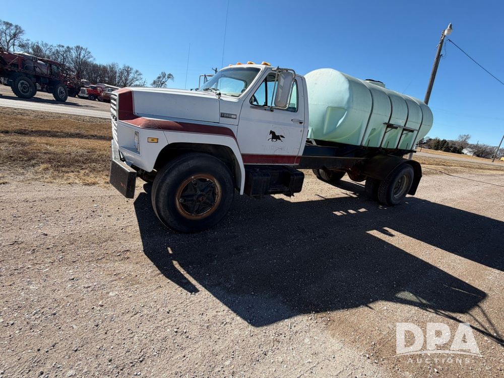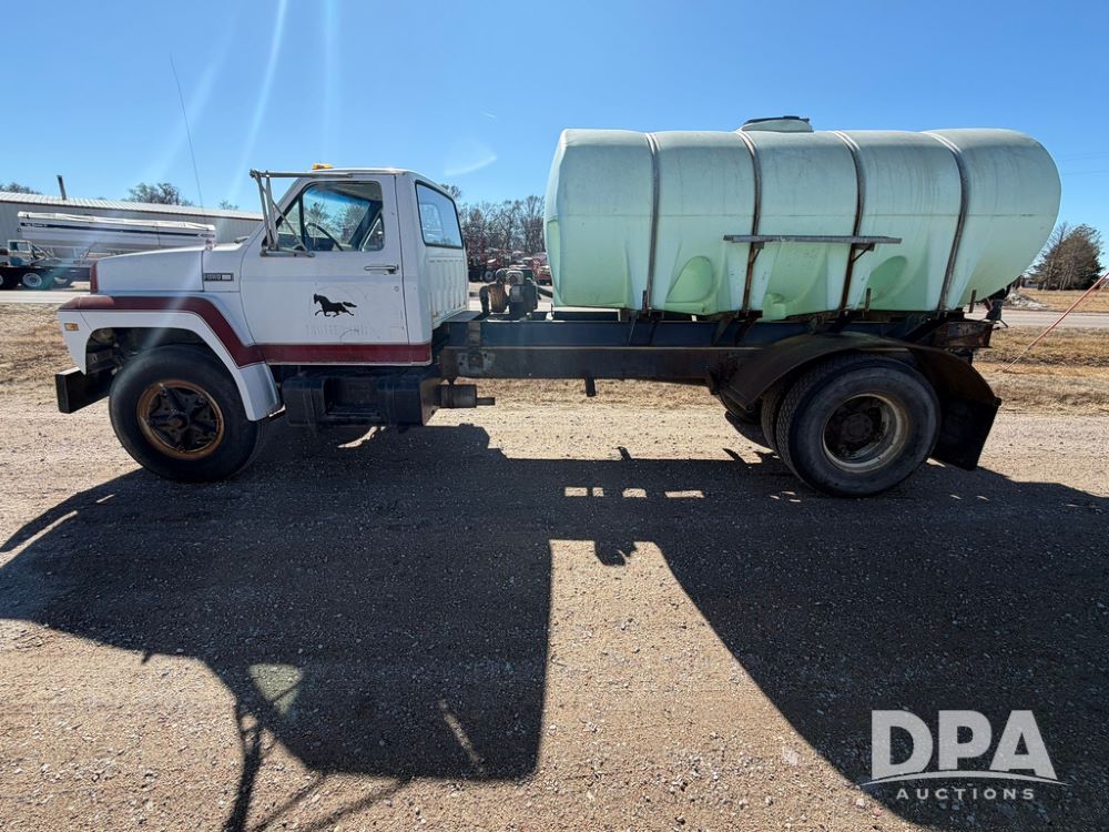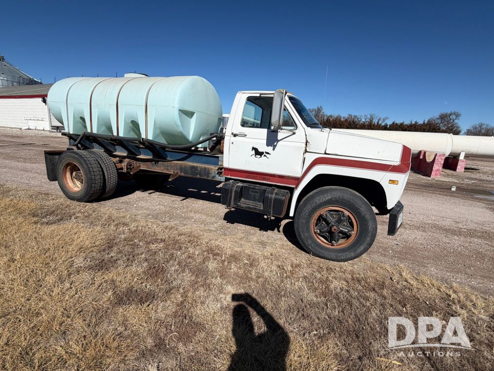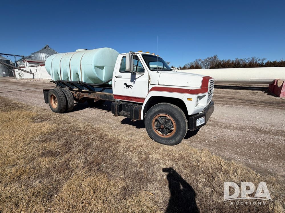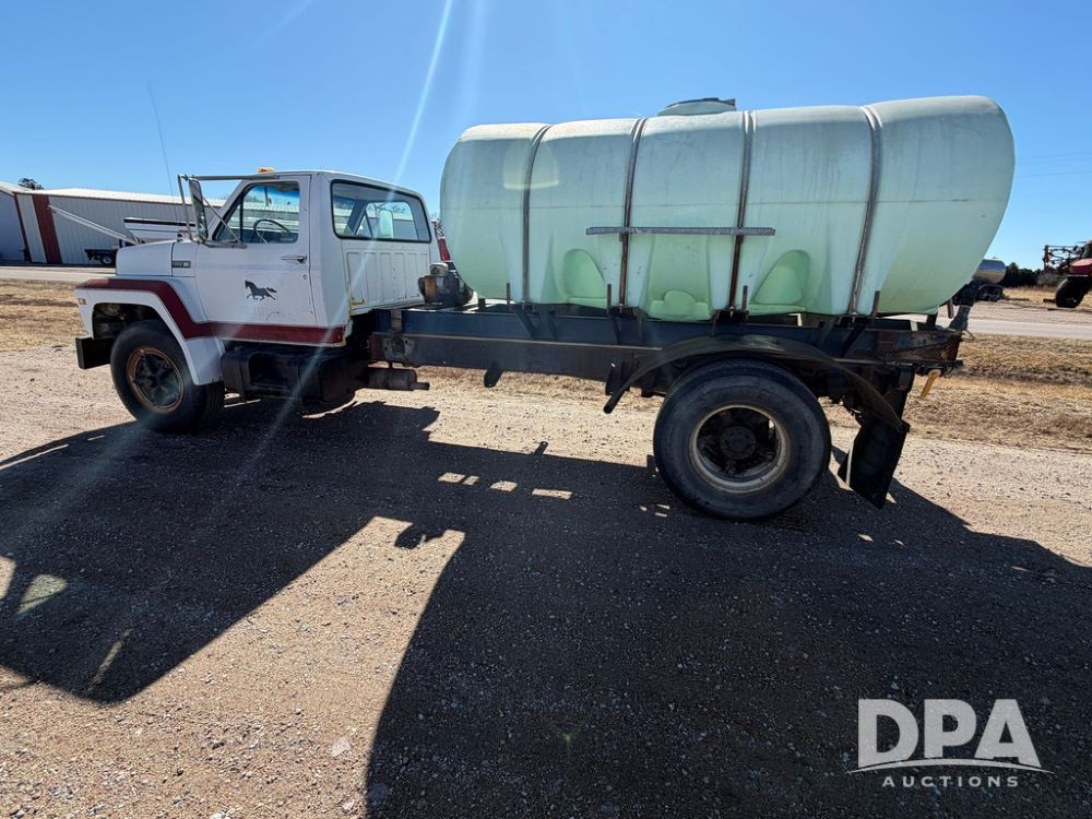 1983 Ford F800 Nurse Truck (RR0618), V-8 379CI gas engine, 5 speed manual transmission, heat, bucket seats, AM radio, 1,600 gallon poly leg tank, 5.5 HP Briggs Stratton pump, includes all plumbing, High/Lo axle, rear hitch, mud flaps, 10.00R20 front tires, 11R22.5 rear tires, steel finders, shows 68,554 miles.