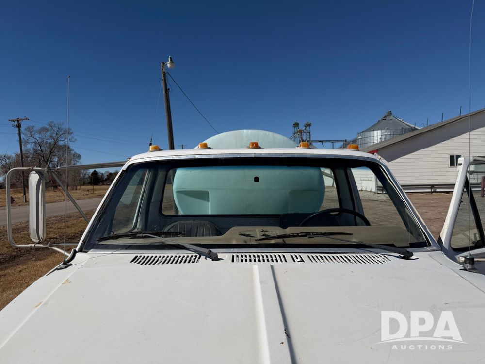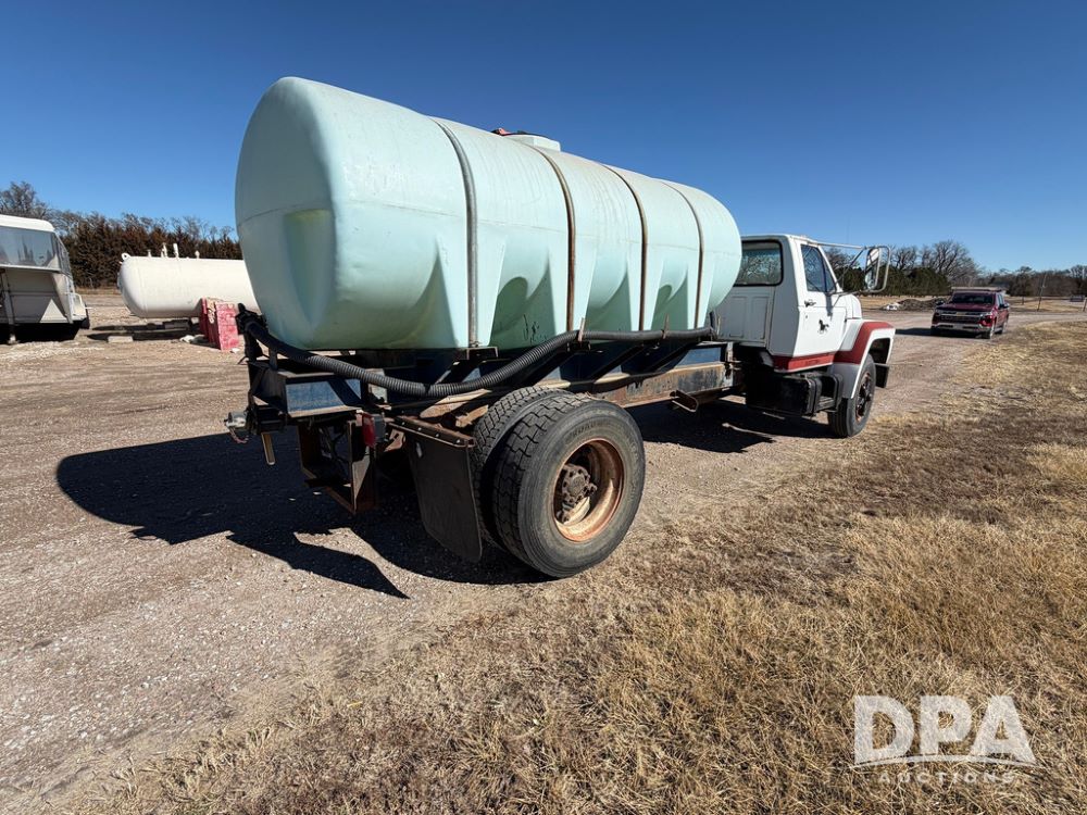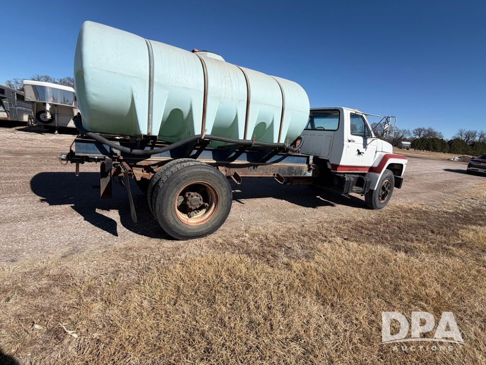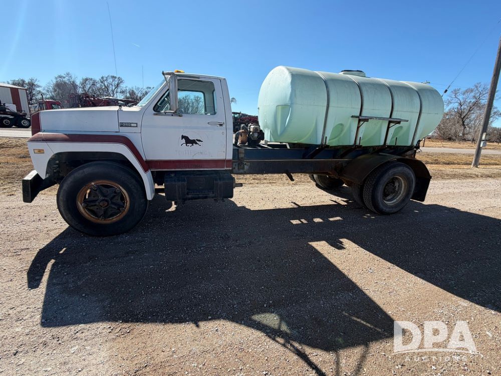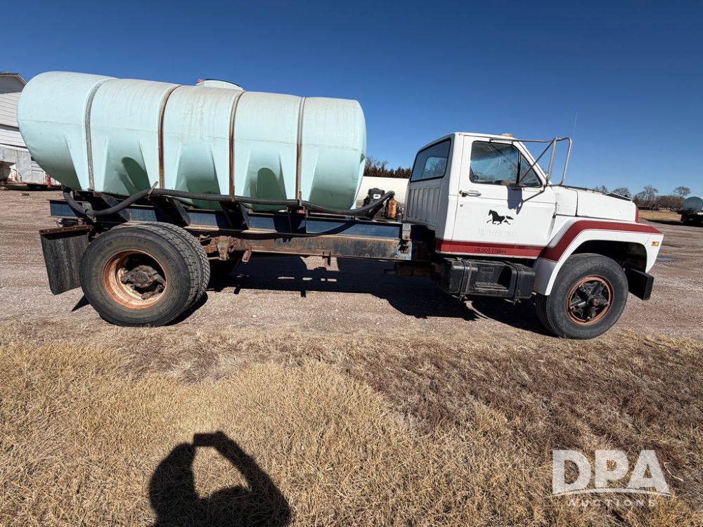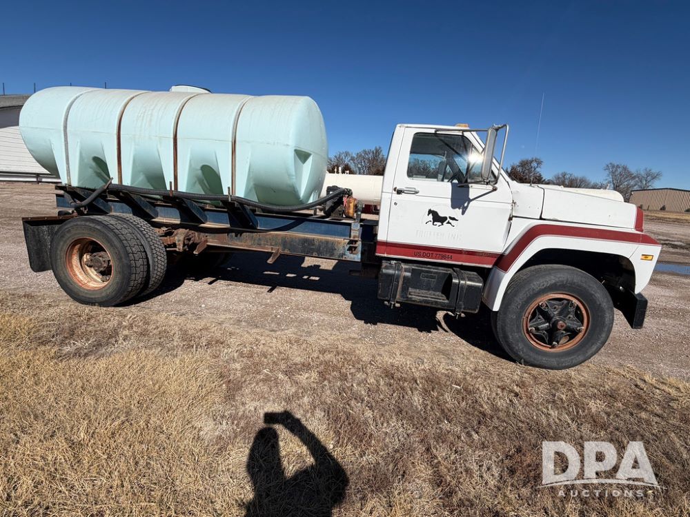 1983 Ford F800 Nurse Truck (RR0618), V-8 379CI gas engine, 5 speed manual transmission, heat, bucket seats, AM radio, 1,600 gallon poly leg tank, 5.5 HP Briggs Stratton pump, includes all plumbing, High/Lo axle, rear hitch, mud flaps, 10.00R20 front tires, 11R22.5 rear tires, steel finders, shows 68,554 miles.