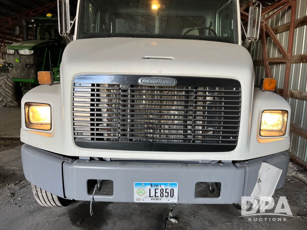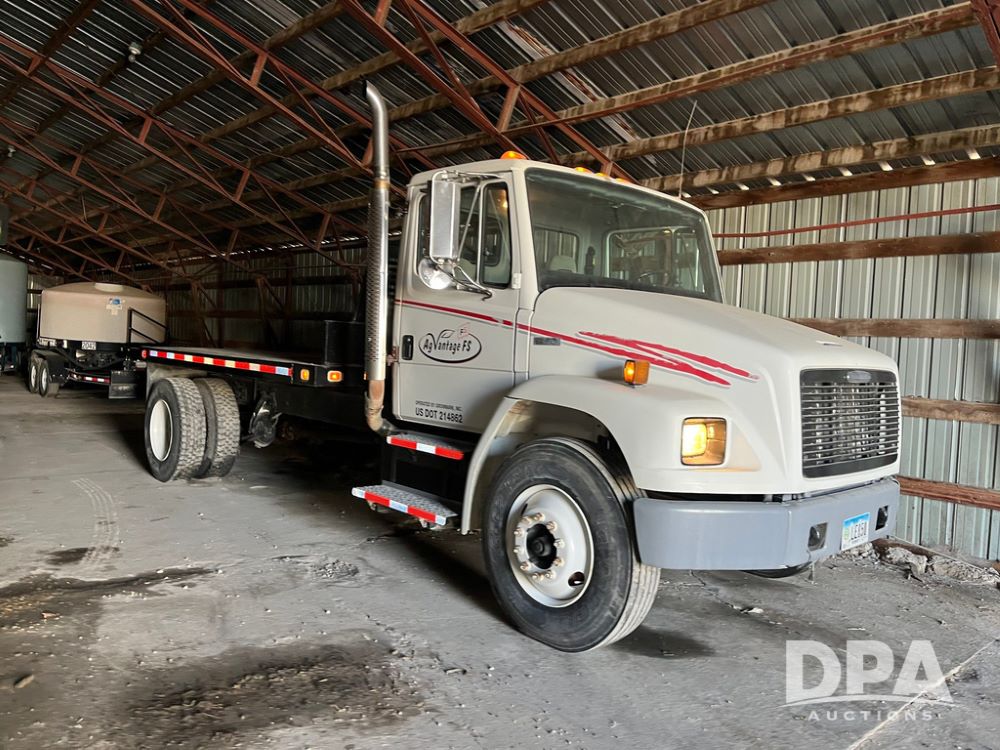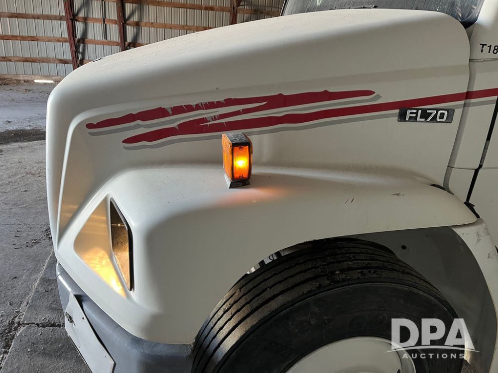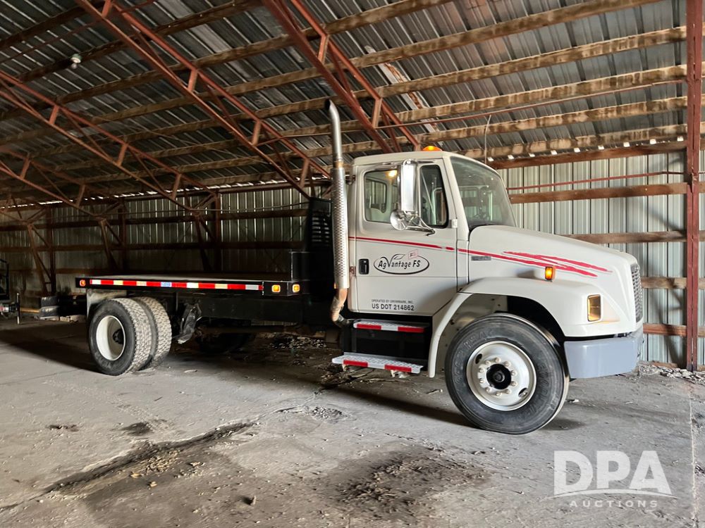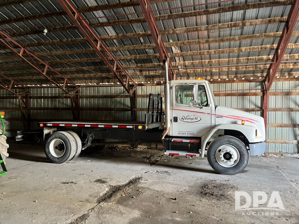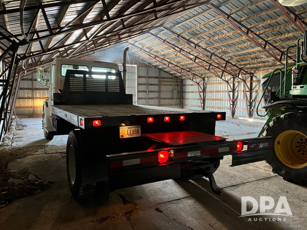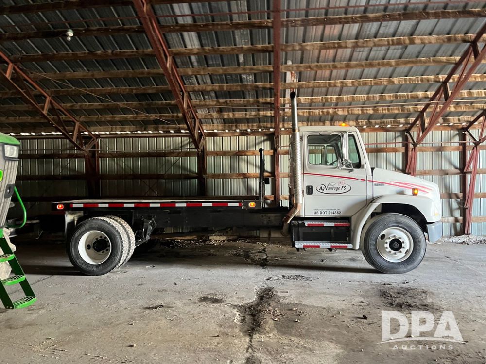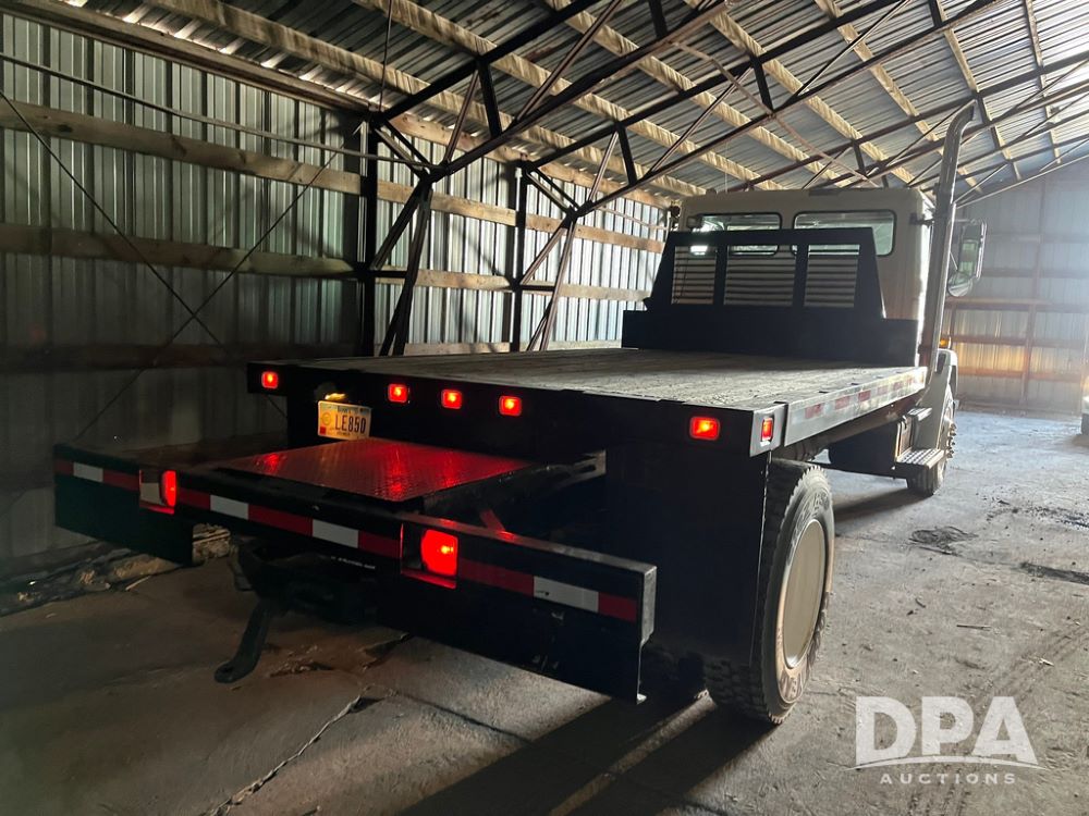 2001 Freightliner FL70 Flatbed (JN4070, Unit T180), Cummins diesel engine, 6 speed transmission, air conditioning, heat, Am/Fm radio, cruise control, single axle, air ride suspension, steel flatbed, wood deck, headache rack, rear hitch, 11R22.5 tires, shows 187,842 miles.