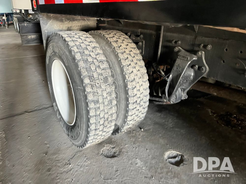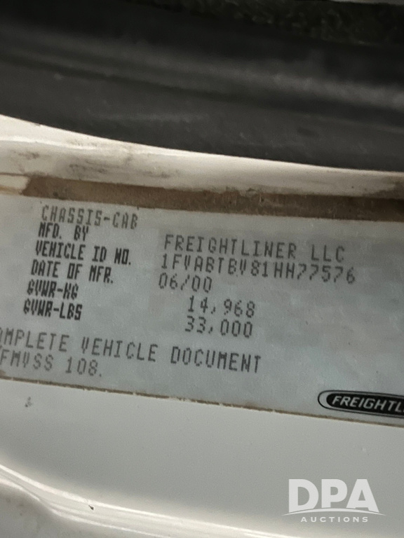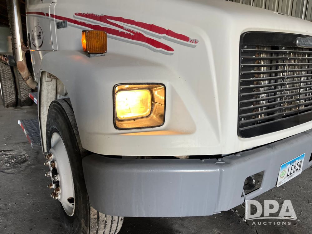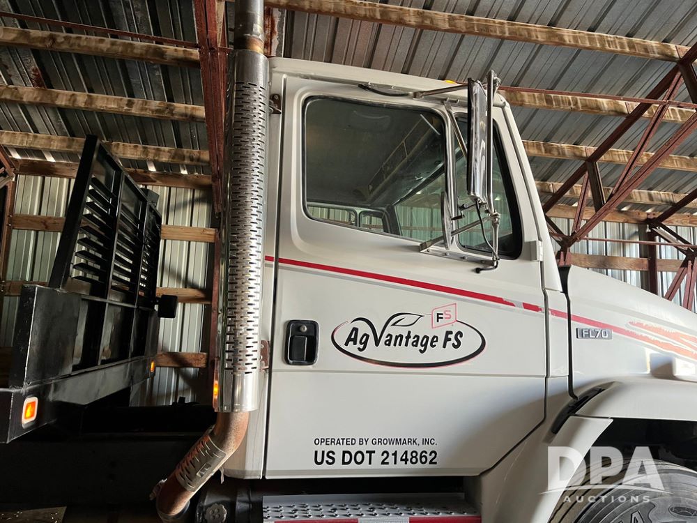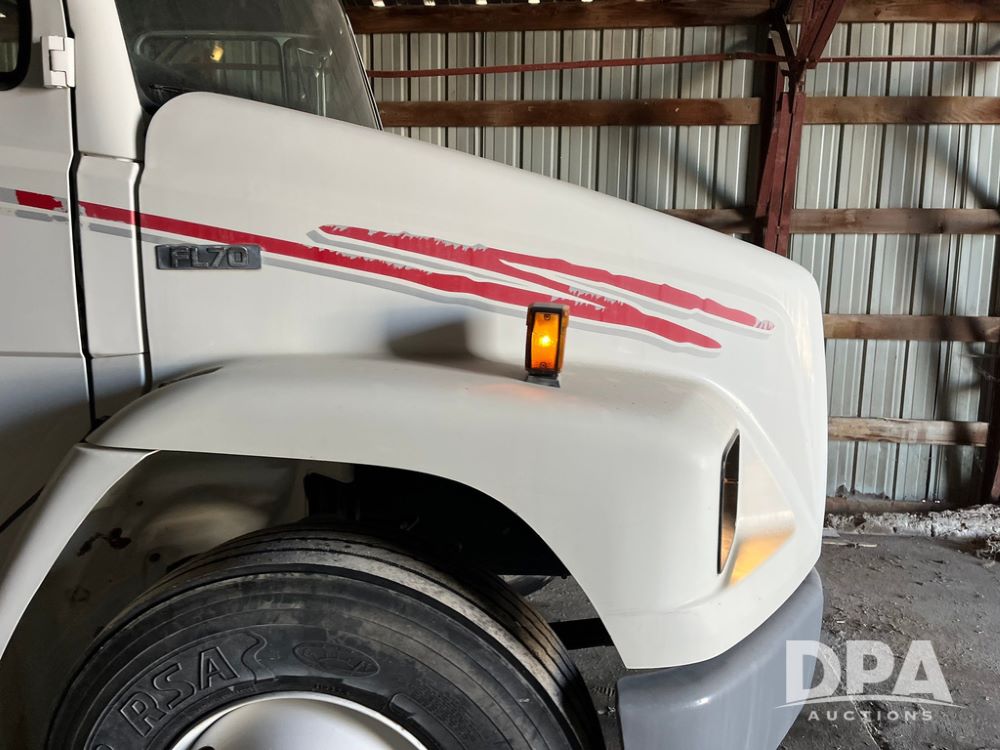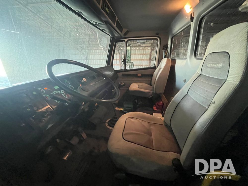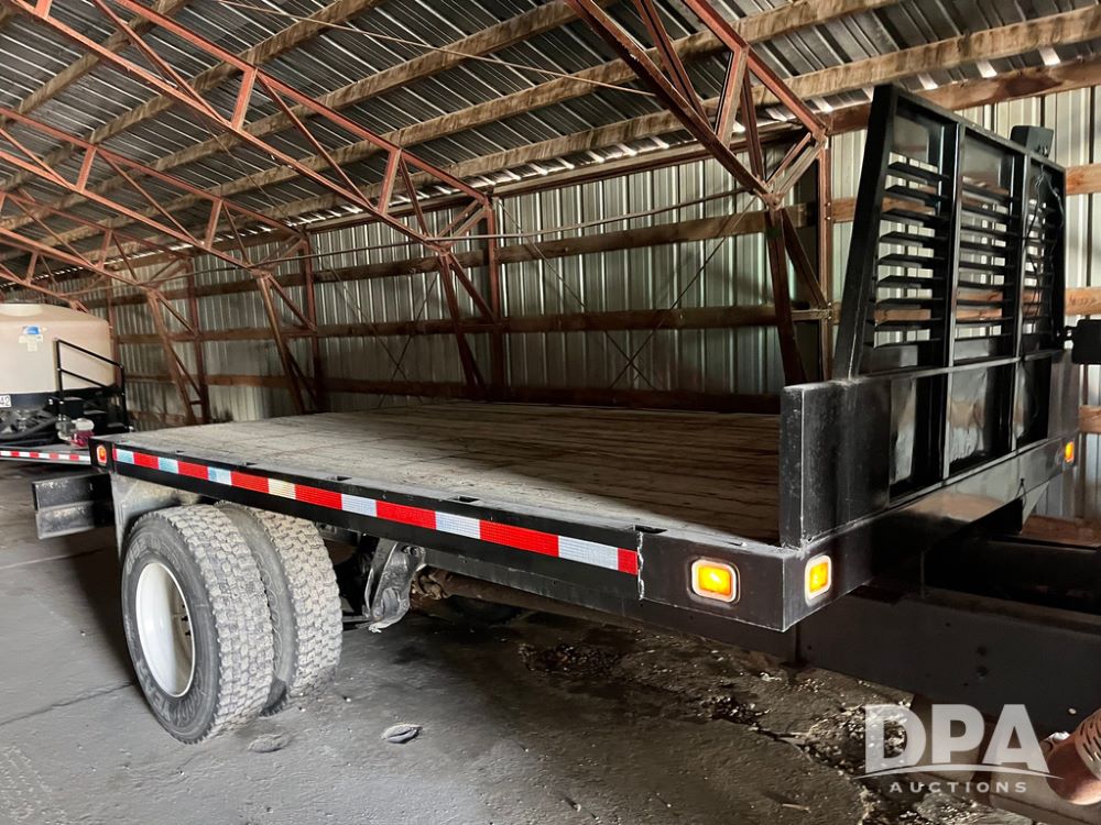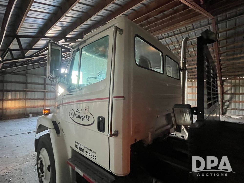 2001 Freightliner FL70 Flatbed (JN4070, Unit T180), Cummins diesel engine, 6 speed transmission, air conditioning, heat, Am/Fm radio, cruise control, single axle, air ride suspension, steel flatbed, wood deck, headache rack, rear hitch, 11R22.5 tires, shows 187,842 miles.