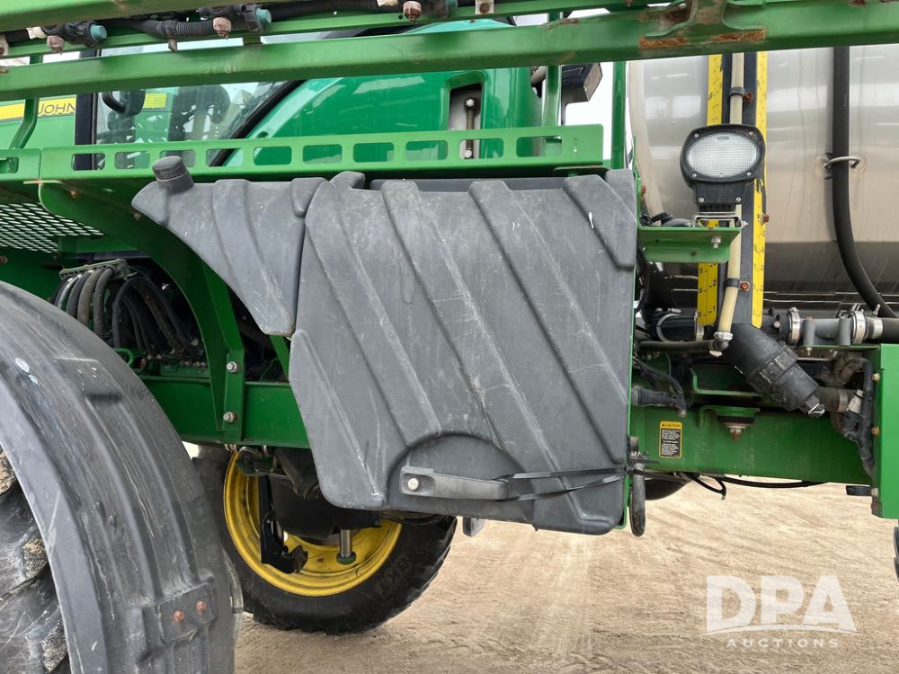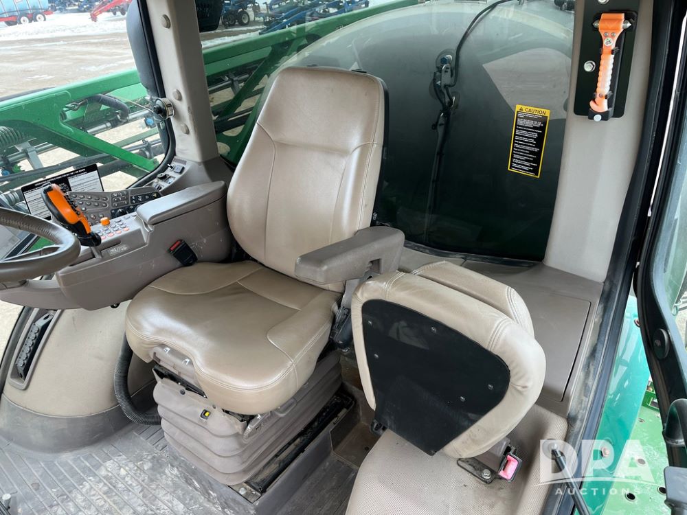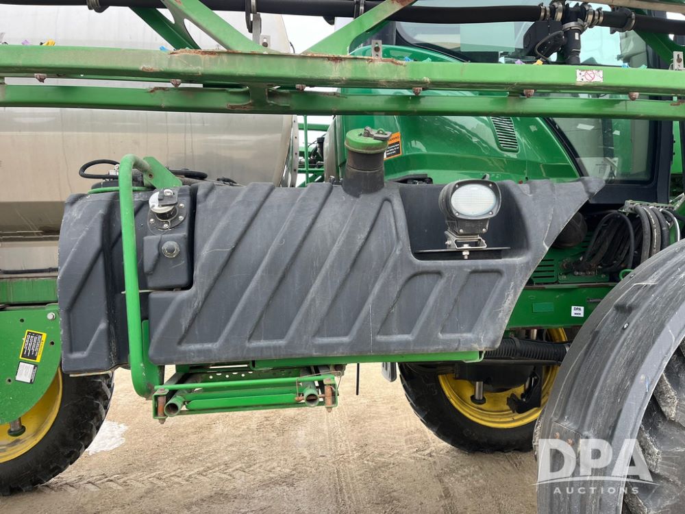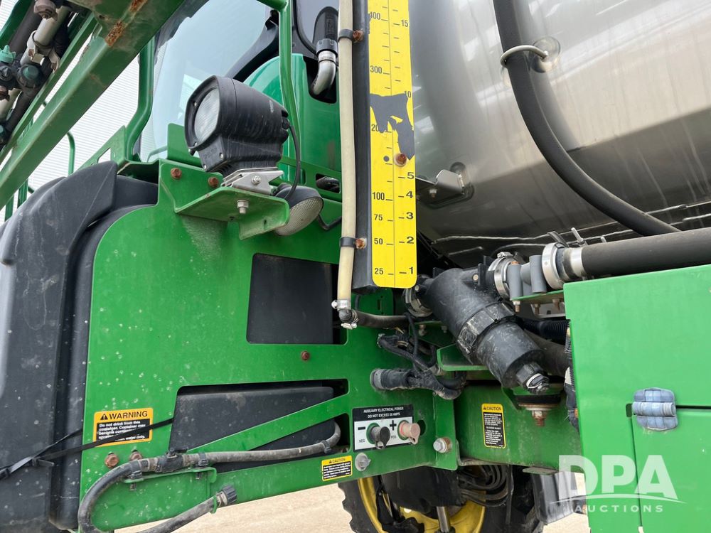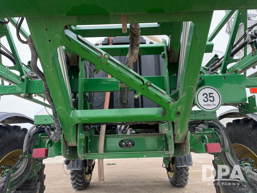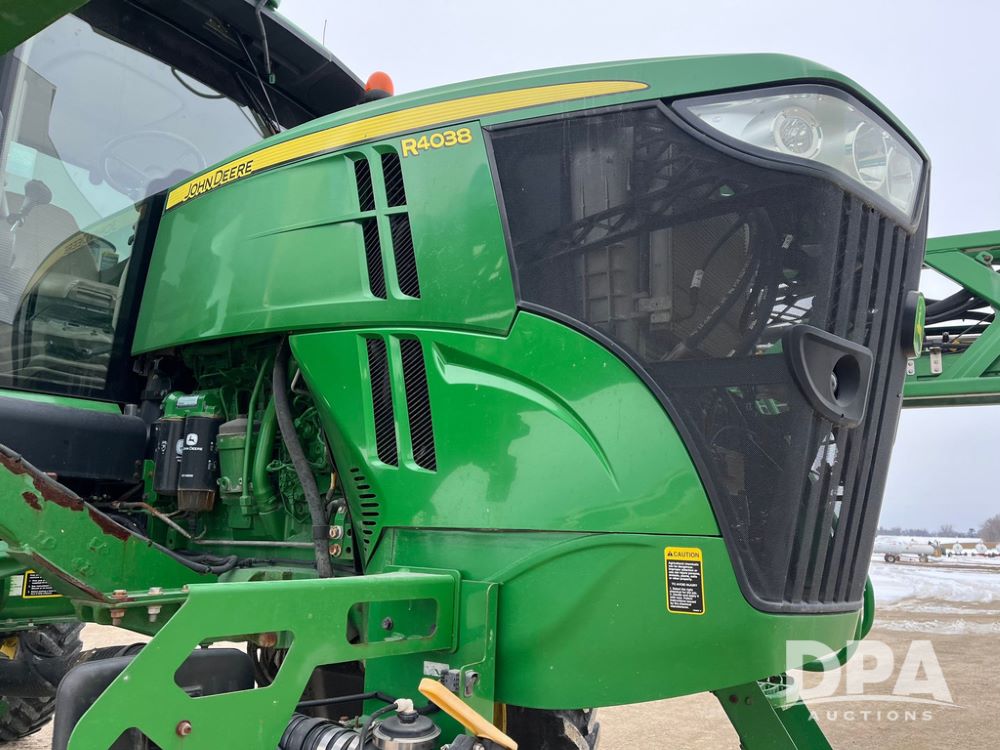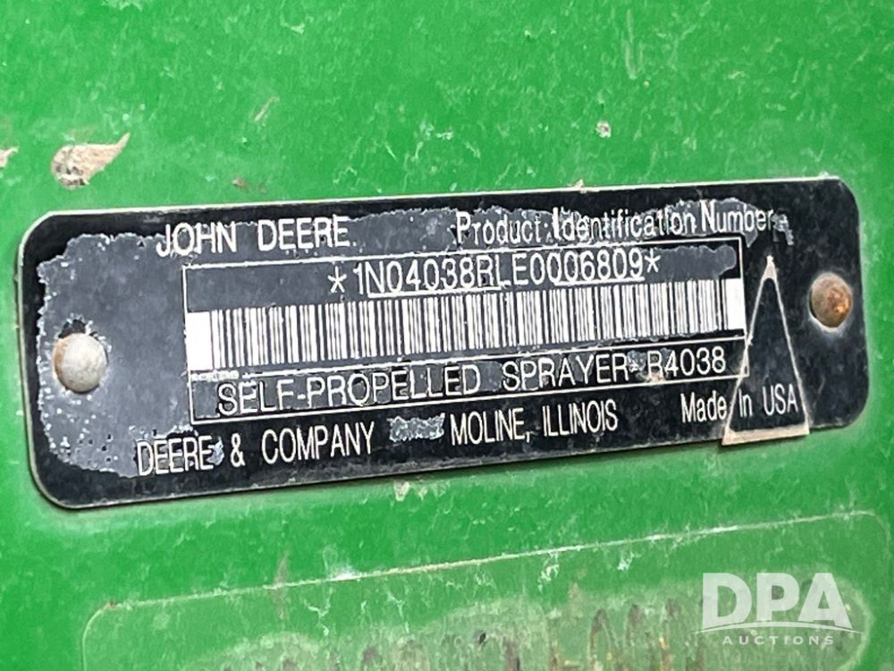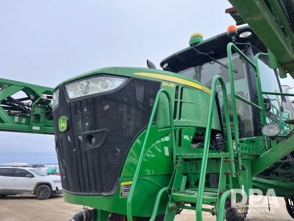 2015 John Deere R4038 Sprayer (JN4078, Unit 1586), John Deere diesel engine (S/N RG6090U013874), hydrostatic transmission, air conditioning, heat, Am/Fm CD radio, leather seat, buddy seat, beacon lights, 1000 gallon stainless steel liquid system, 120' boom, rear poly rinse tank, automatic solution control, front fill, BKT Agrimax Spargo VF380/90R46 tires, fenders, John Deere StarFire 3000 globe, John Deere monitor, shows 2,384 hours.