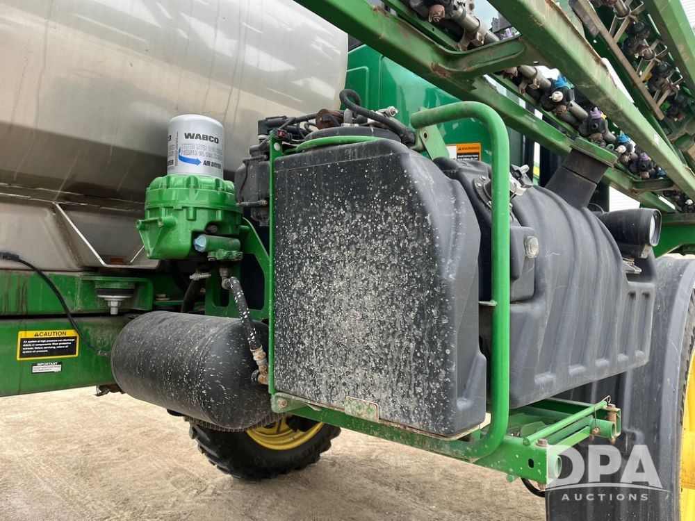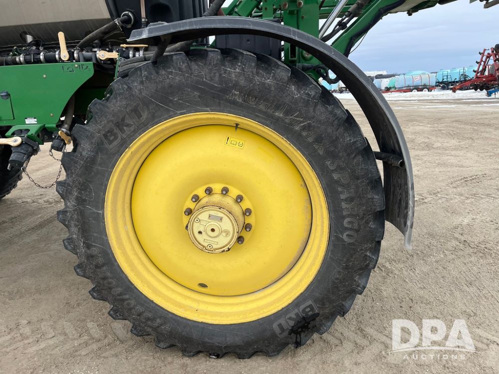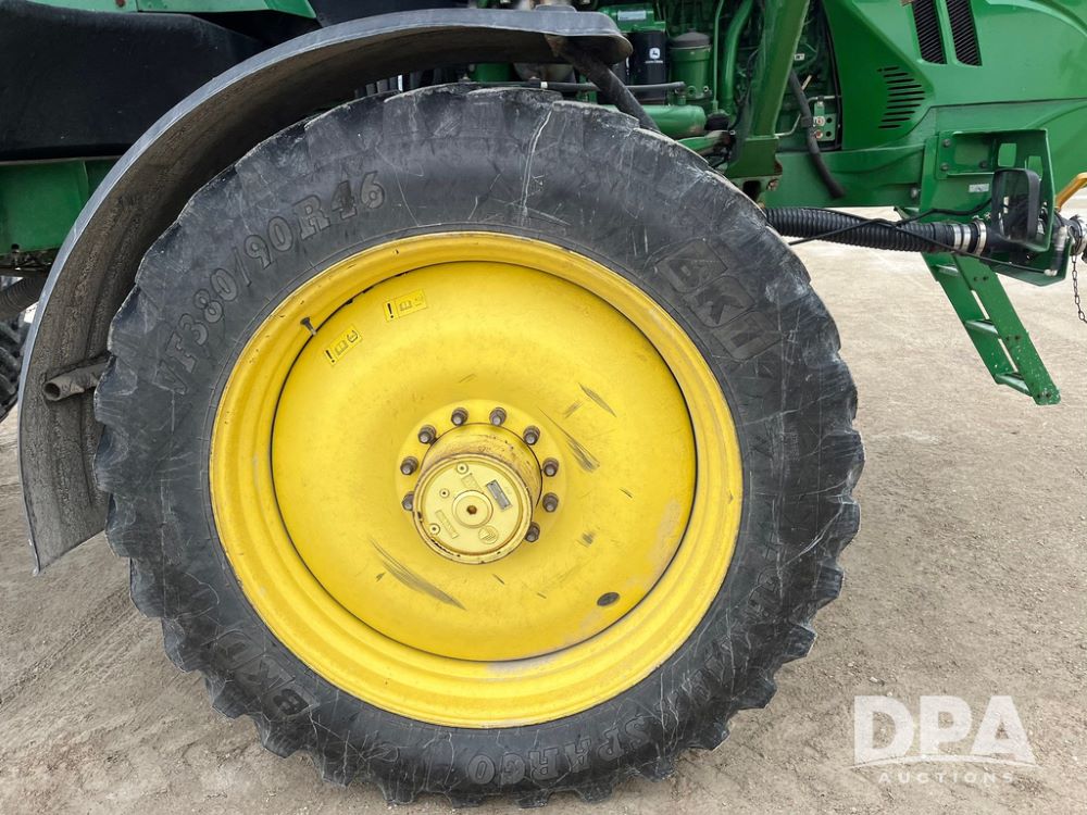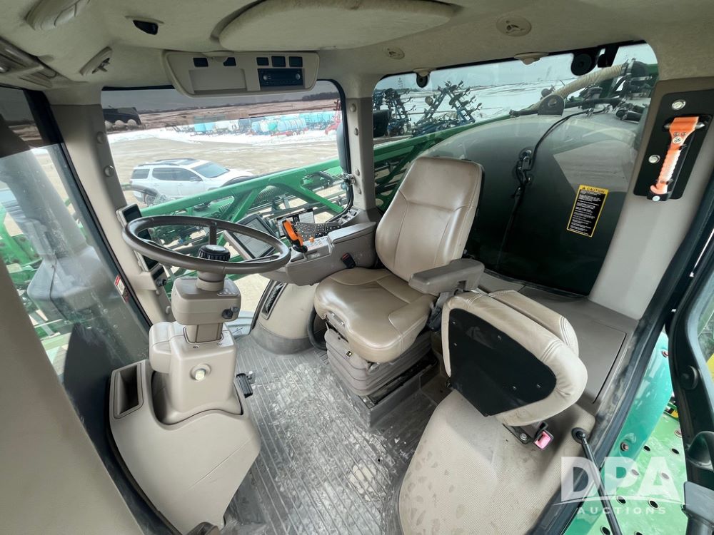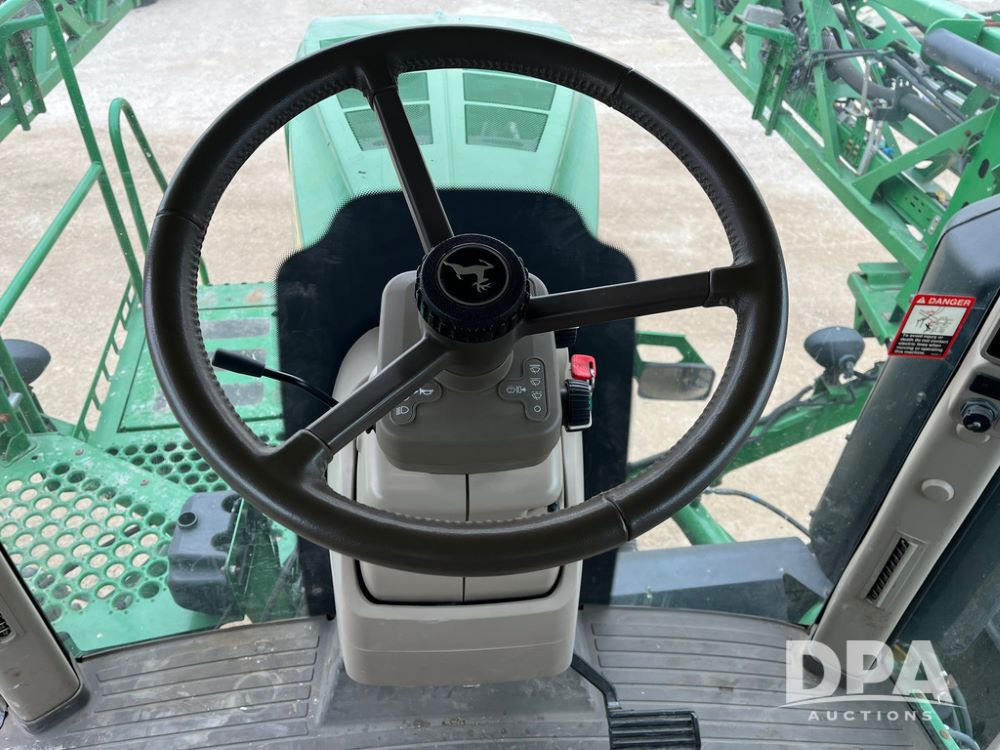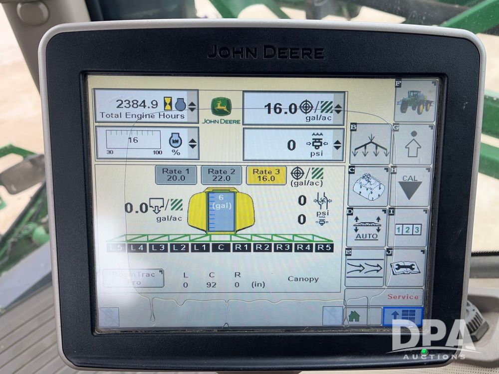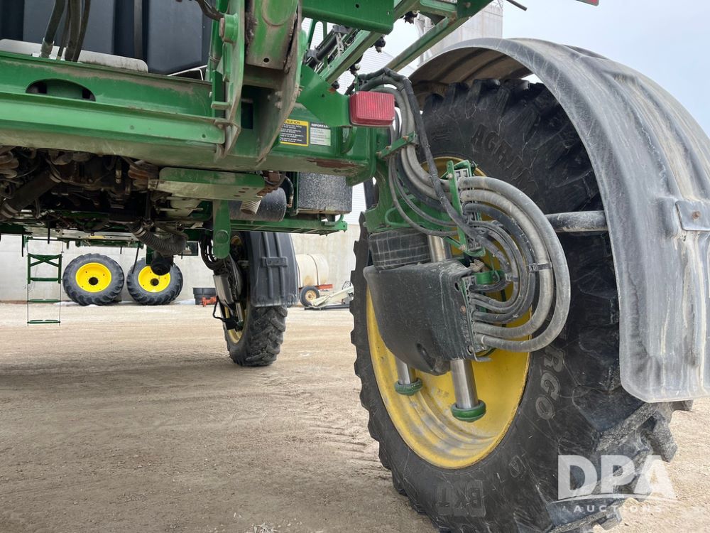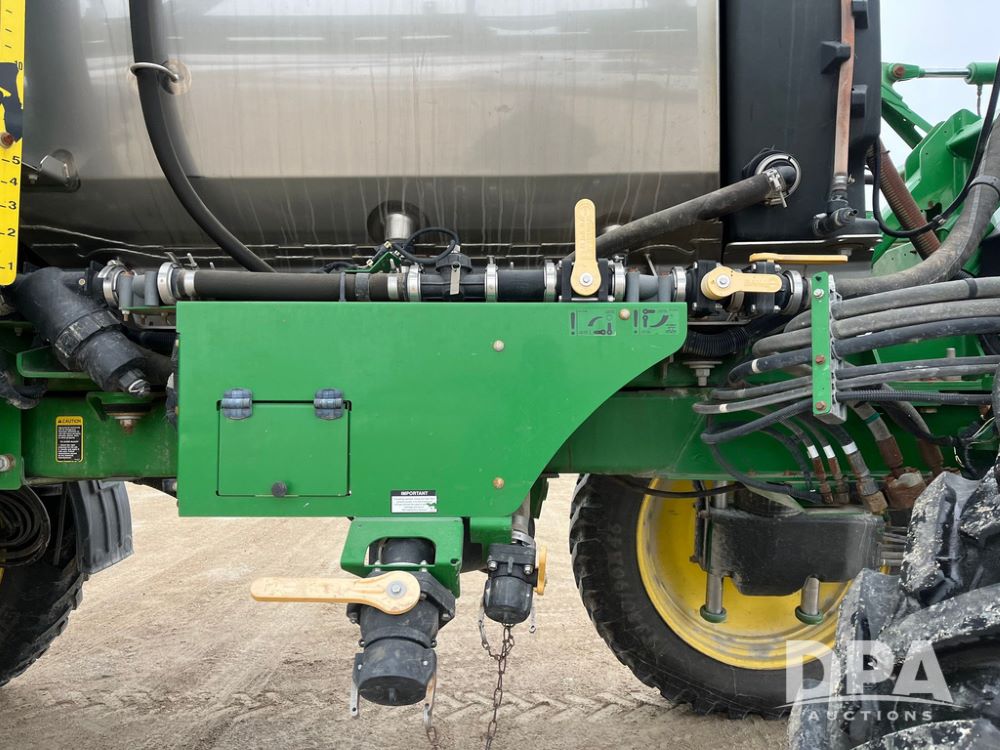 2015 John Deere R4038 Sprayer (JN4078, Unit 1586), John Deere diesel engine (S/N RG6090U013874), hydrostatic transmission, air conditioning, heat, Am/Fm CD radio, leather seat, buddy seat, beacon lights, 1000 gallon stainless steel liquid system, 120' boom, rear poly rinse tank, automatic solution control, front fill, BKT Agrimax Spargo VF380/90R46 tires, fenders, John Deere StarFire 3000 globe, John Deere monitor, shows 2,384 hours.