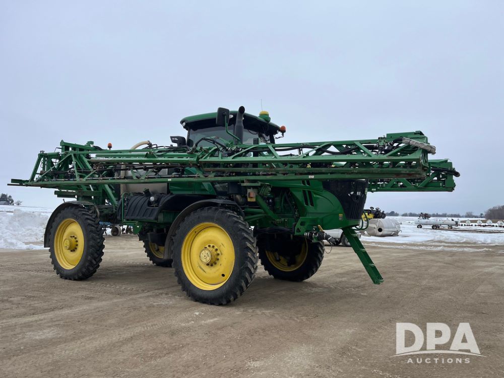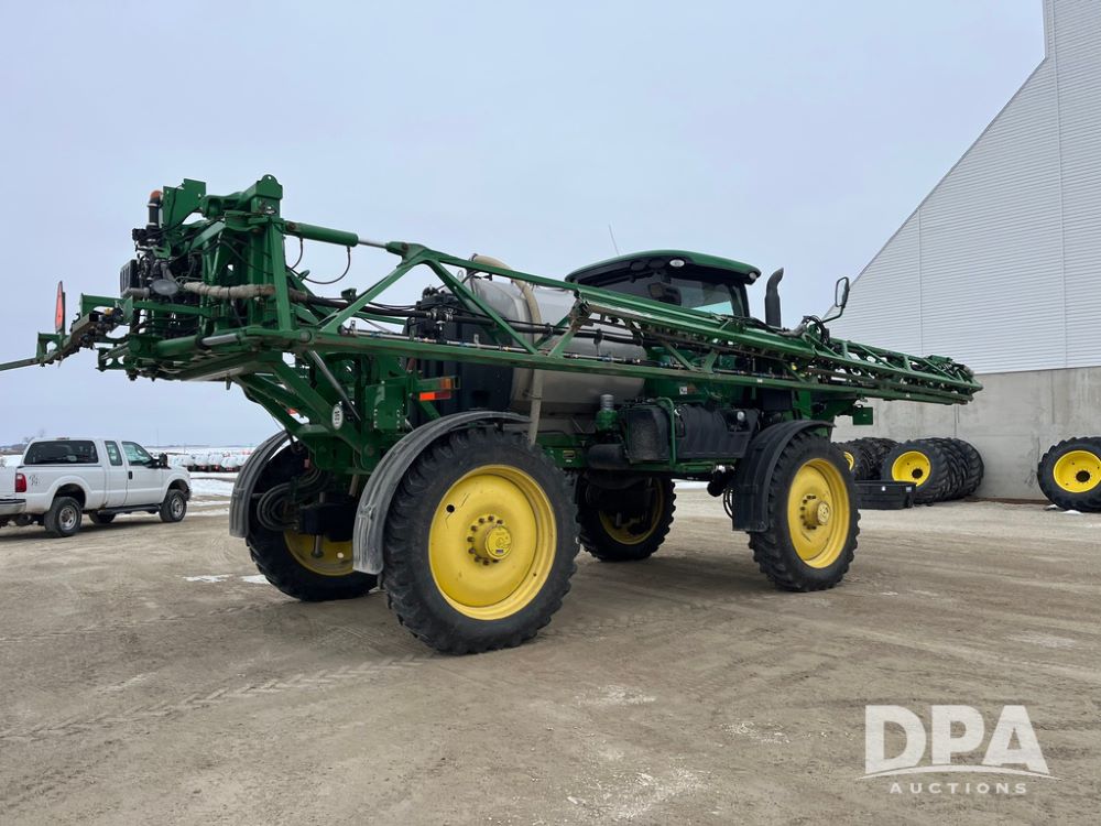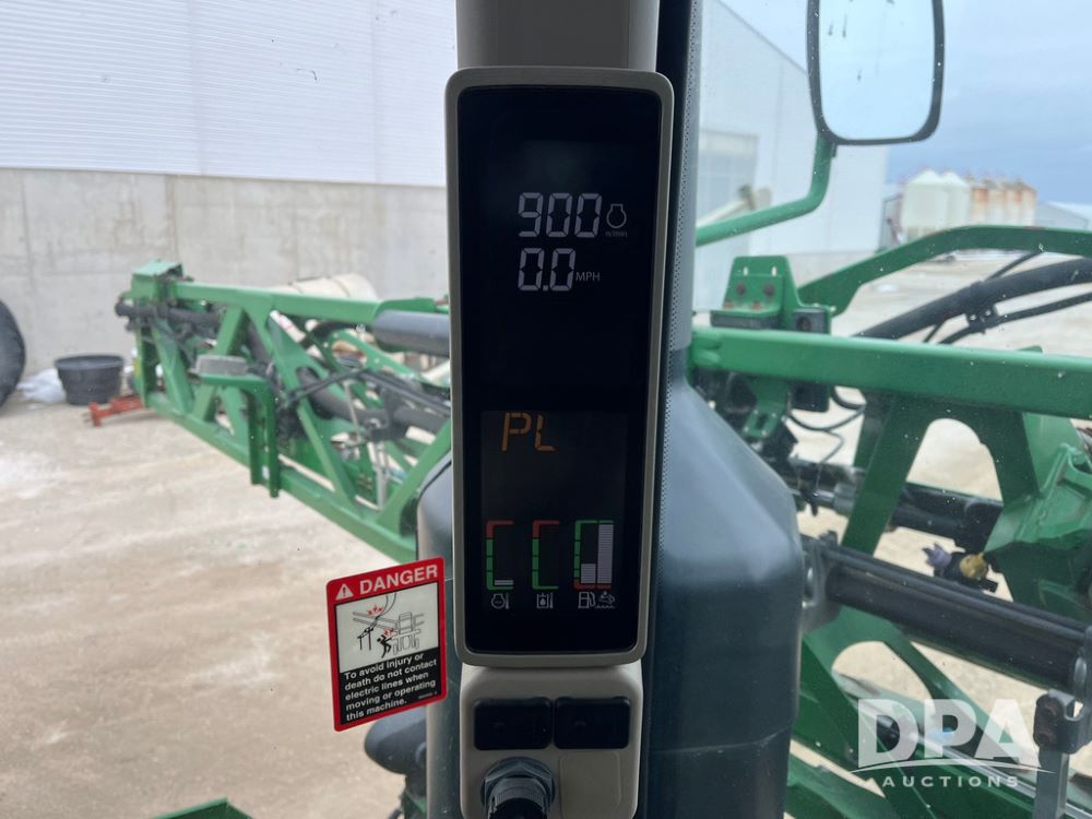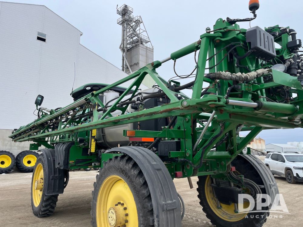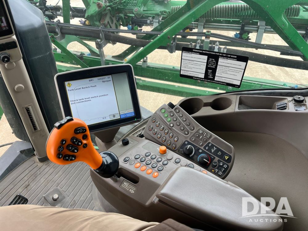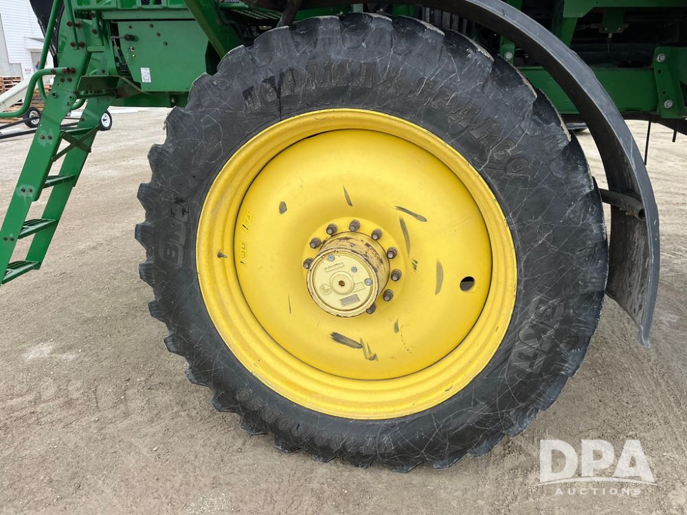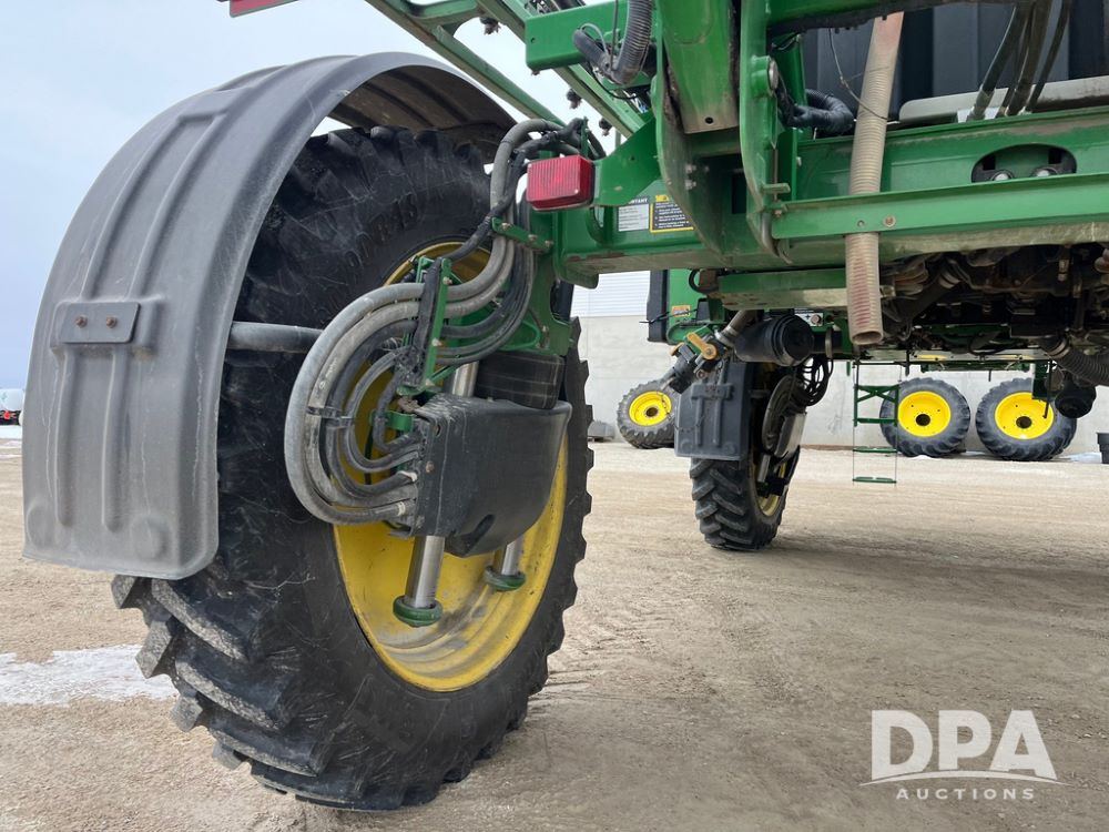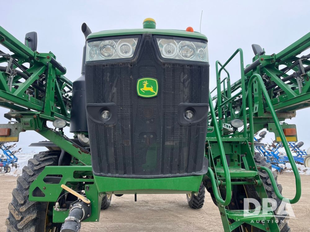 2015 John Deere R4038 Sprayer (JN4078, Unit 1586), John Deere diesel engine (S/N RG6090U013874), hydrostatic transmission, air conditioning, heat, Am/Fm CD radio, leather seat, buddy seat, beacon lights, 1000 gallon stainless steel liquid system, 120' boom, rear poly rinse tank, automatic solution control, front fill, BKT Agrimax Spargo VF380/90R46 tires, fenders, John Deere StarFire 3000 globe, John Deere monitor, shows 2,384 hours.