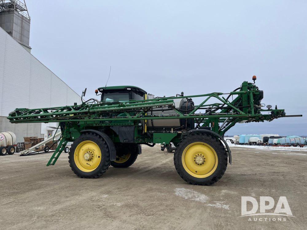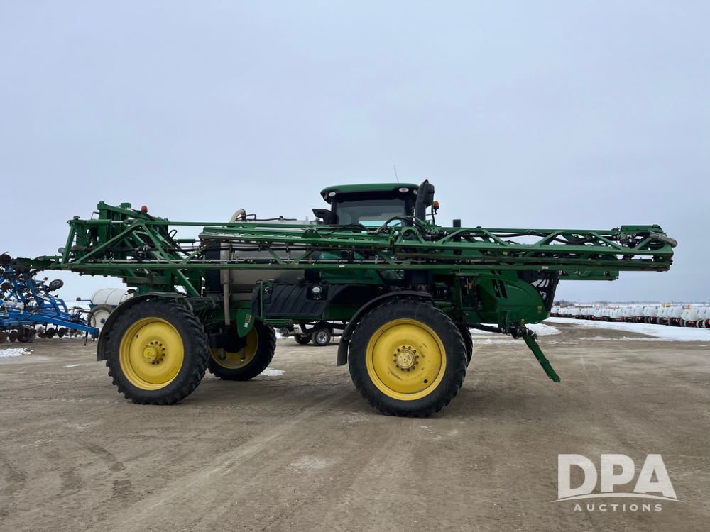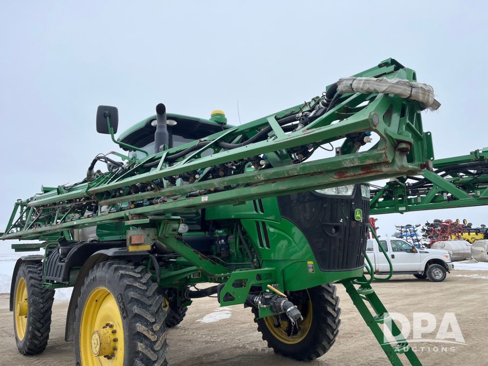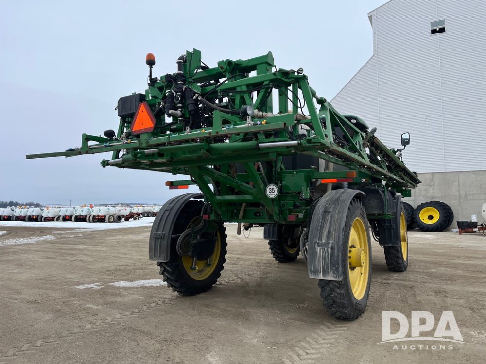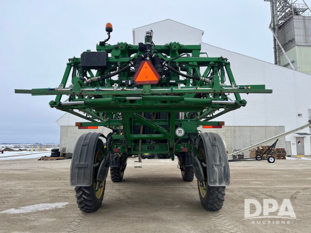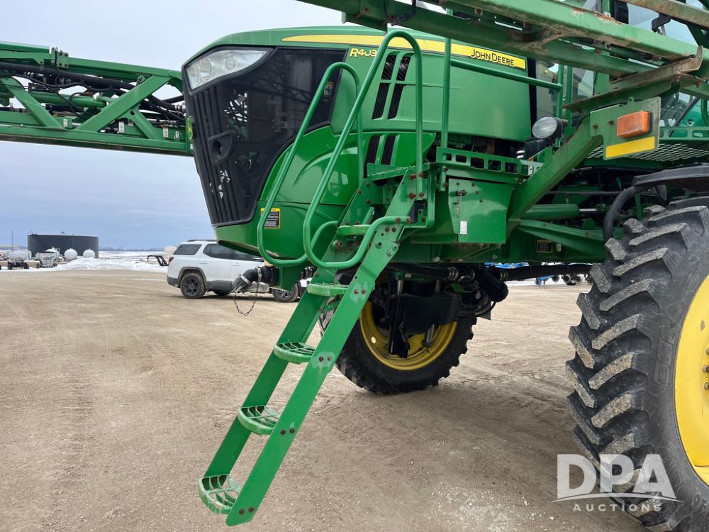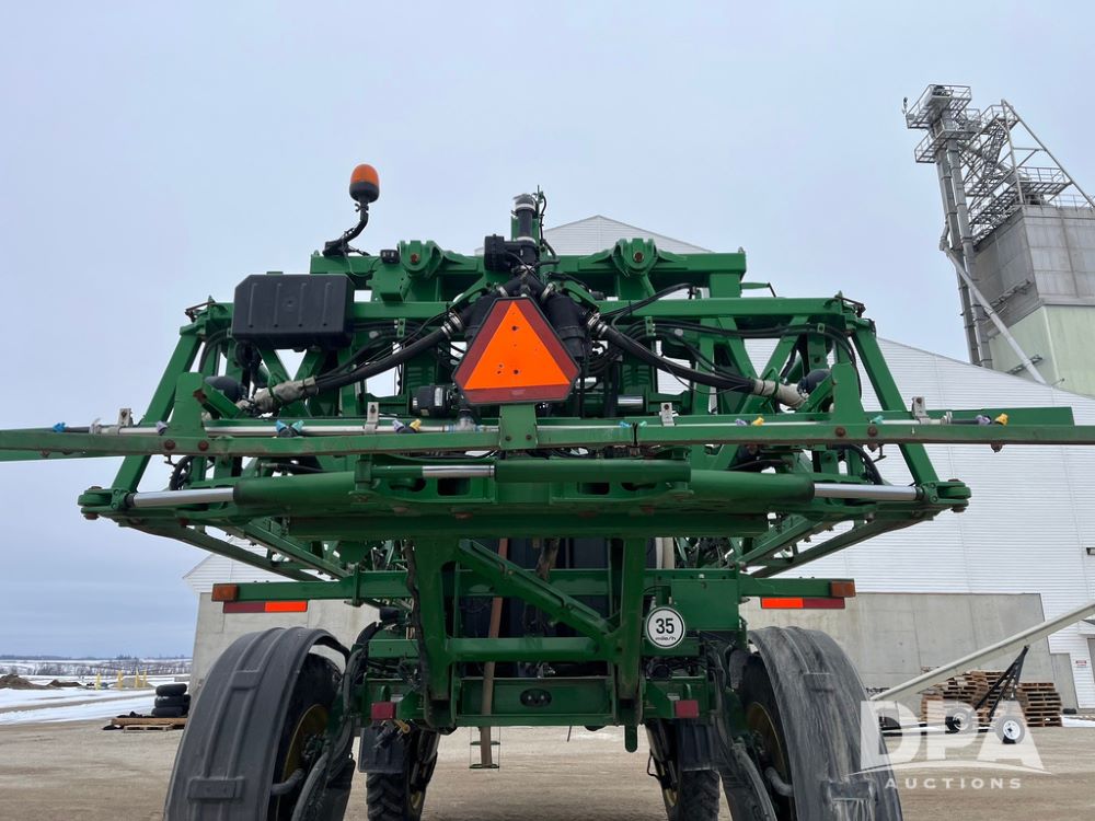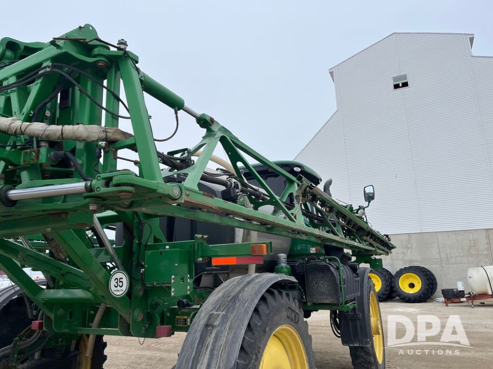 2015 John Deere R4038 Sprayer (JN4078, Unit 1586), John Deere diesel engine (S/N RG6090U013874), hydrostatic transmission, air conditioning, heat, Am/Fm CD radio, leather seat, buddy seat, beacon lights, 1000 gallon stainless steel liquid system, 120' boom, rear poly rinse tank, automatic solution control, front fill, BKT Agrimax Spargo VF380/90R46 tires, fenders, John Deere StarFire 3000 globe, John Deere monitor, shows 2,384 hours.