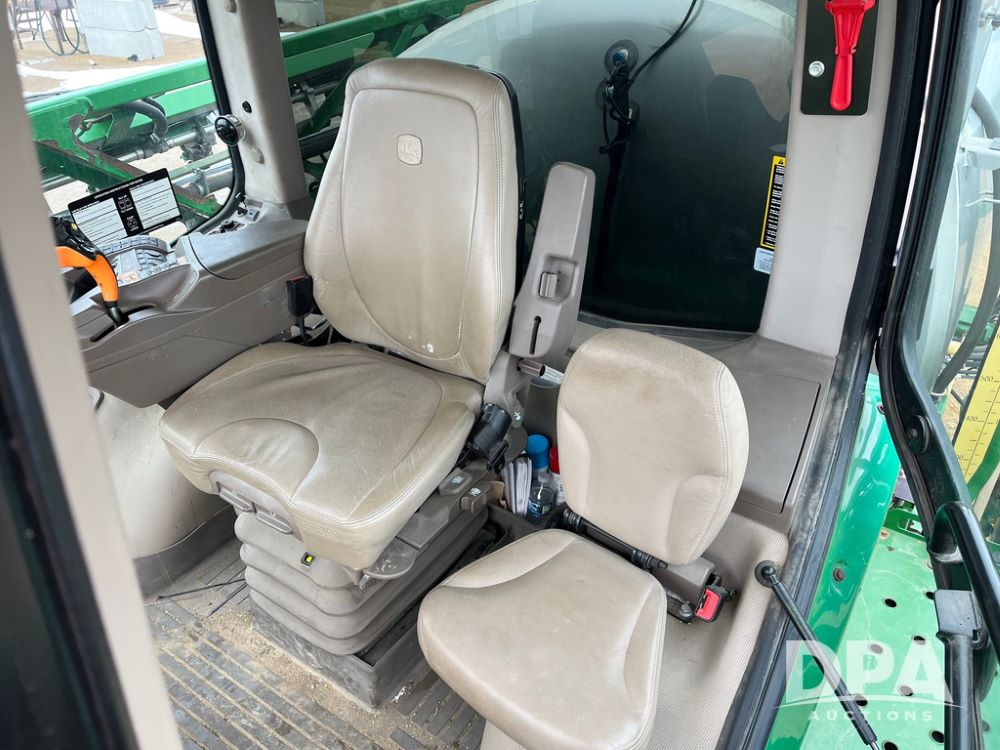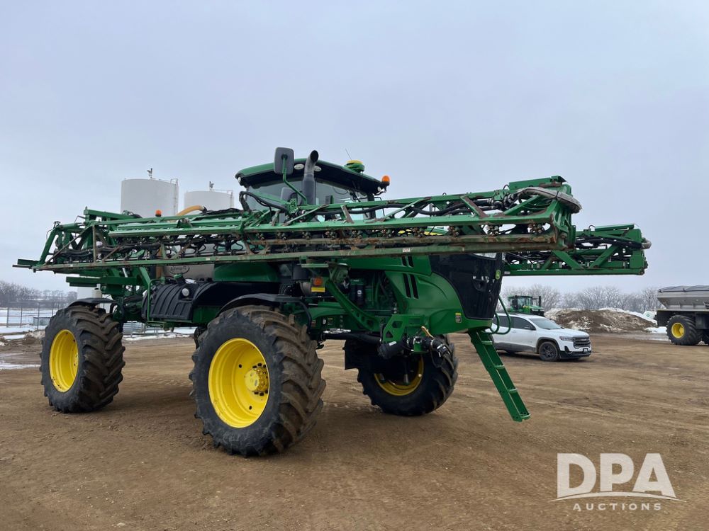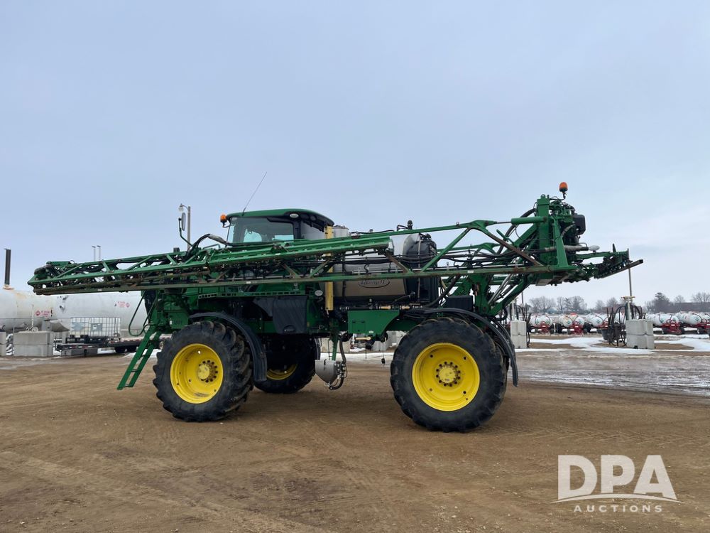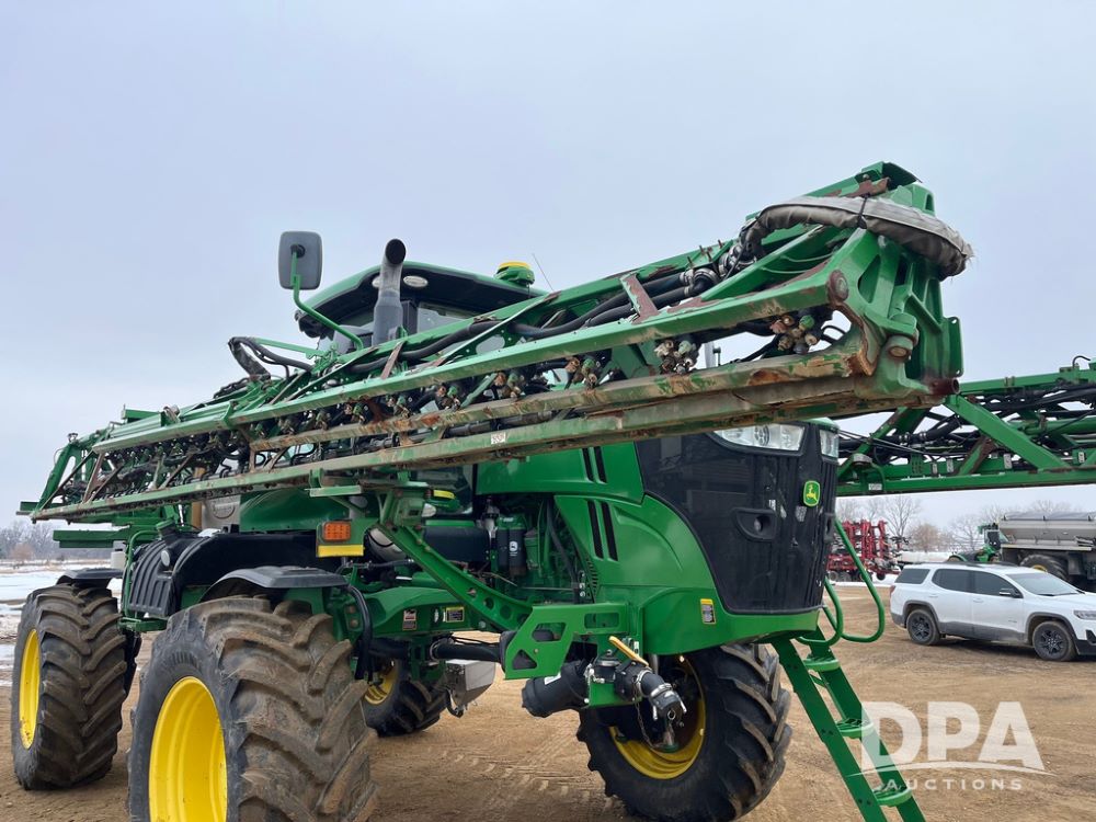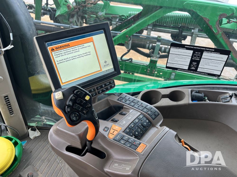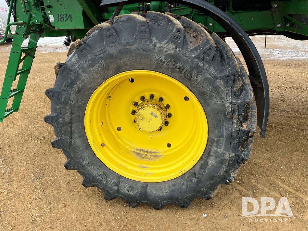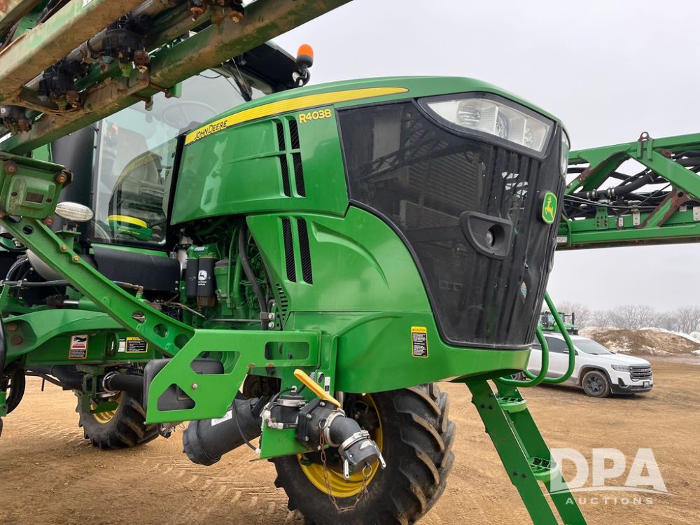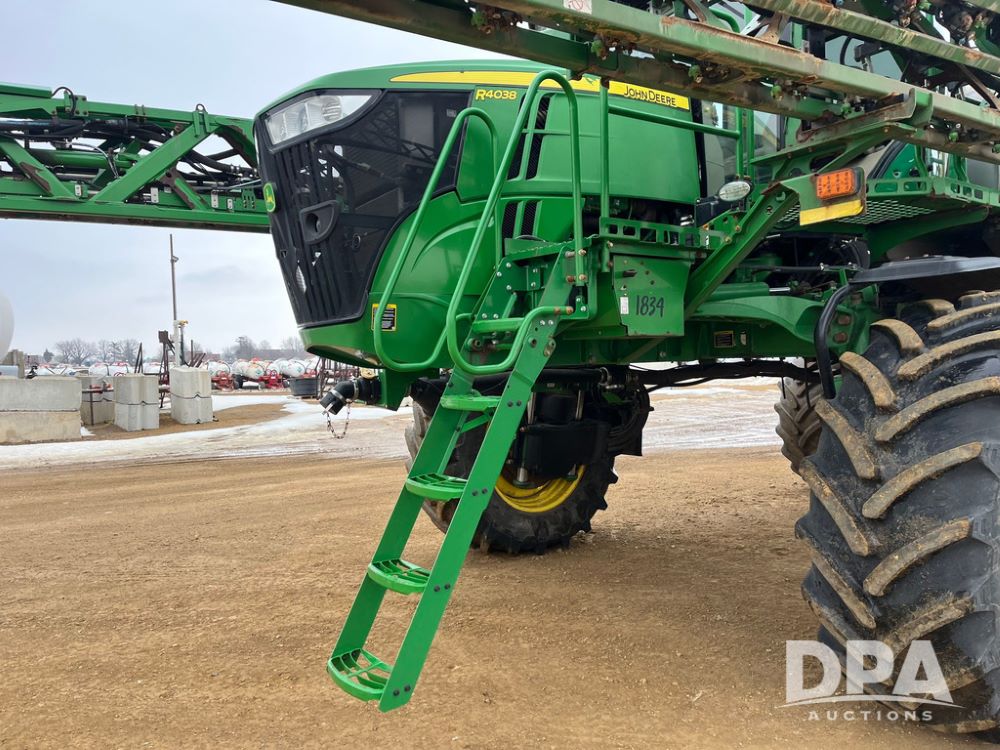 2019 John Deere R4038 Sprayer (JN4097, Unit 1834), John Deere diesel engine (S/N RG6090U060422), hydrostatic transmission, air conditioning, heat, Am/Fm radio, leather seat, buddy seat, beacon lights, 1000 gallon stainless steel liquid system, 120' boom, rear poly rinse tank, stainless steel chemical inductor, automatic solution control, front fill, Alliance Agri-Star 365 650/65R38 flotation tires, fenders, John Deere StarFire 7000 globe, John Deere monitor, shows 2,287 hours.