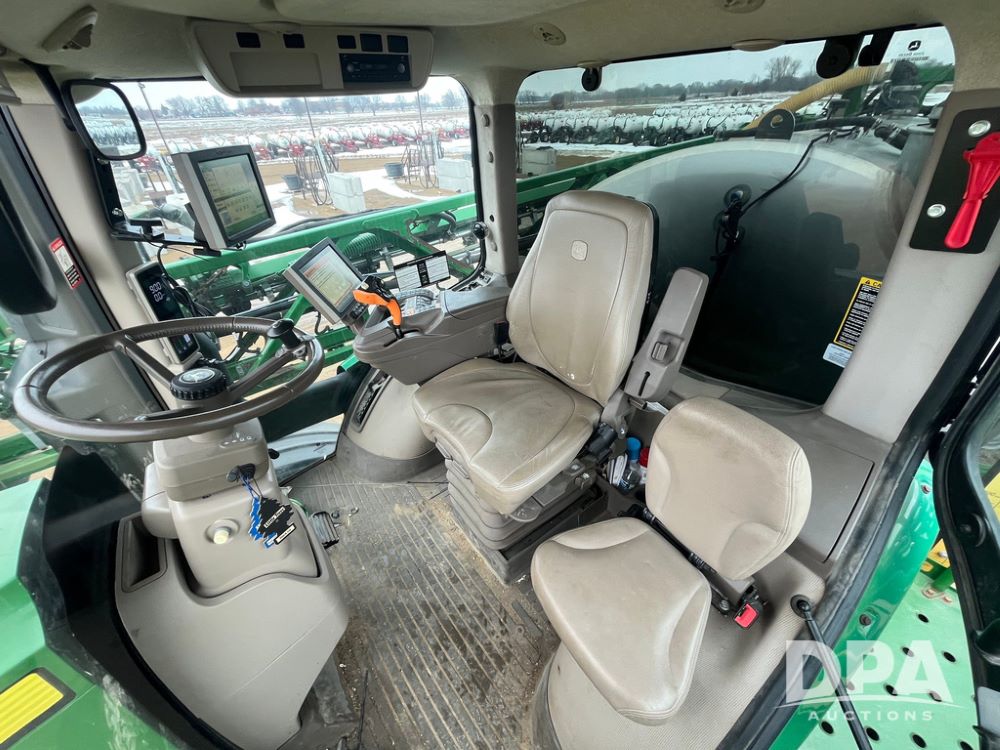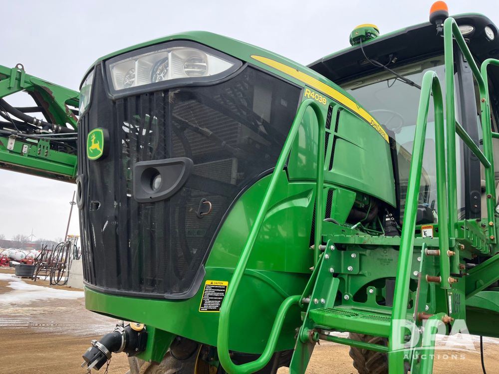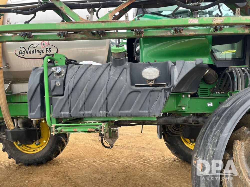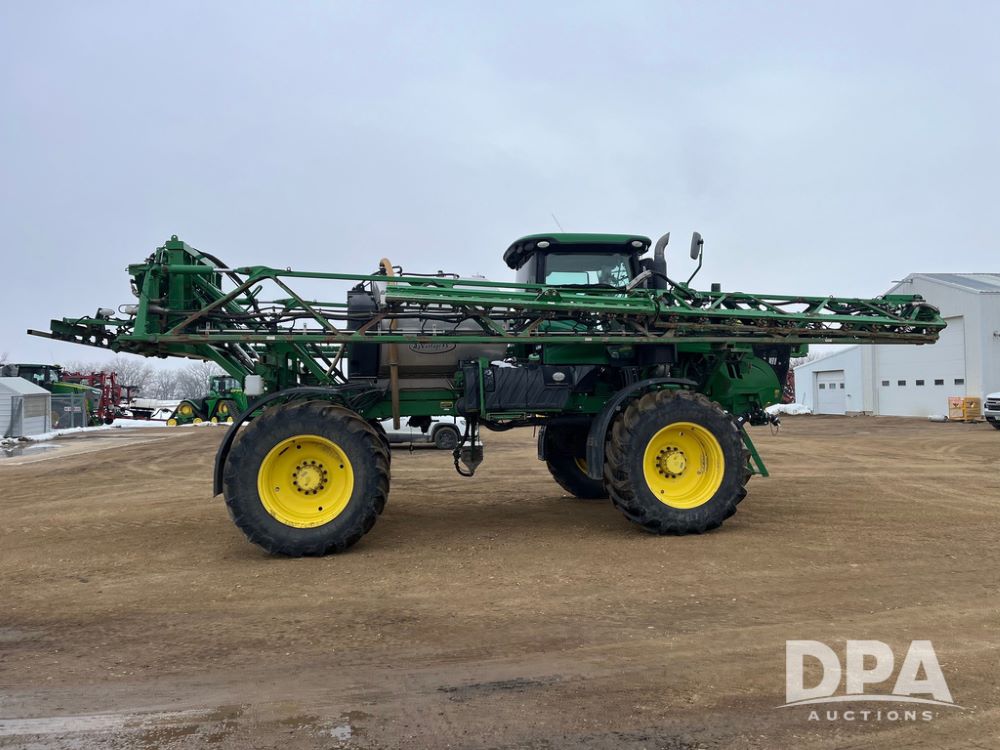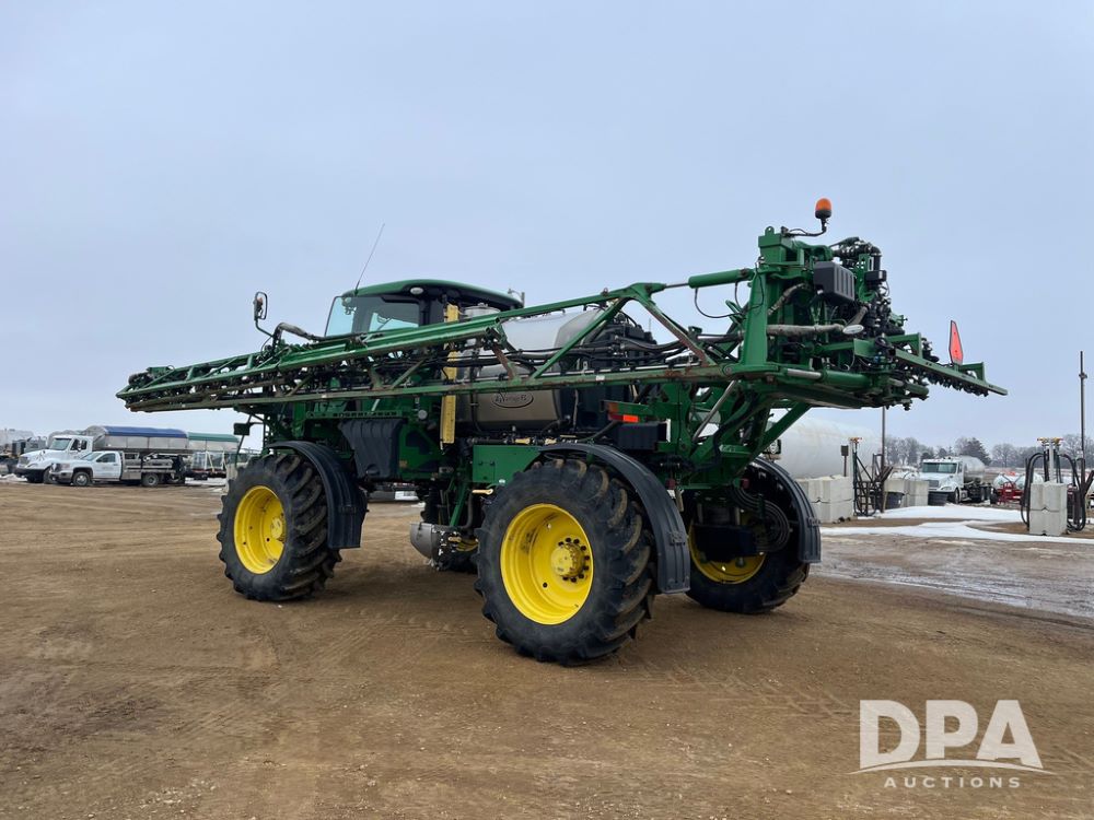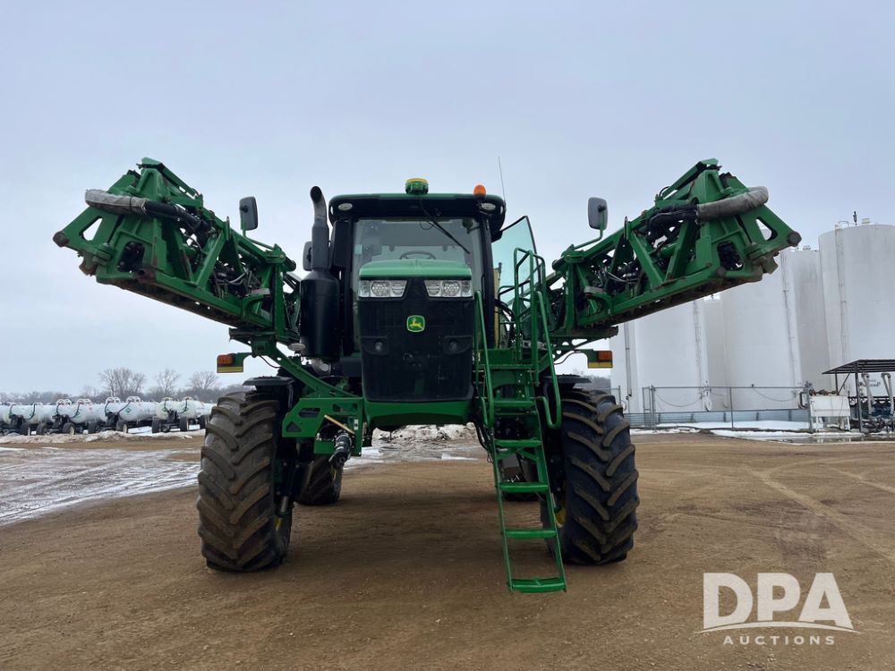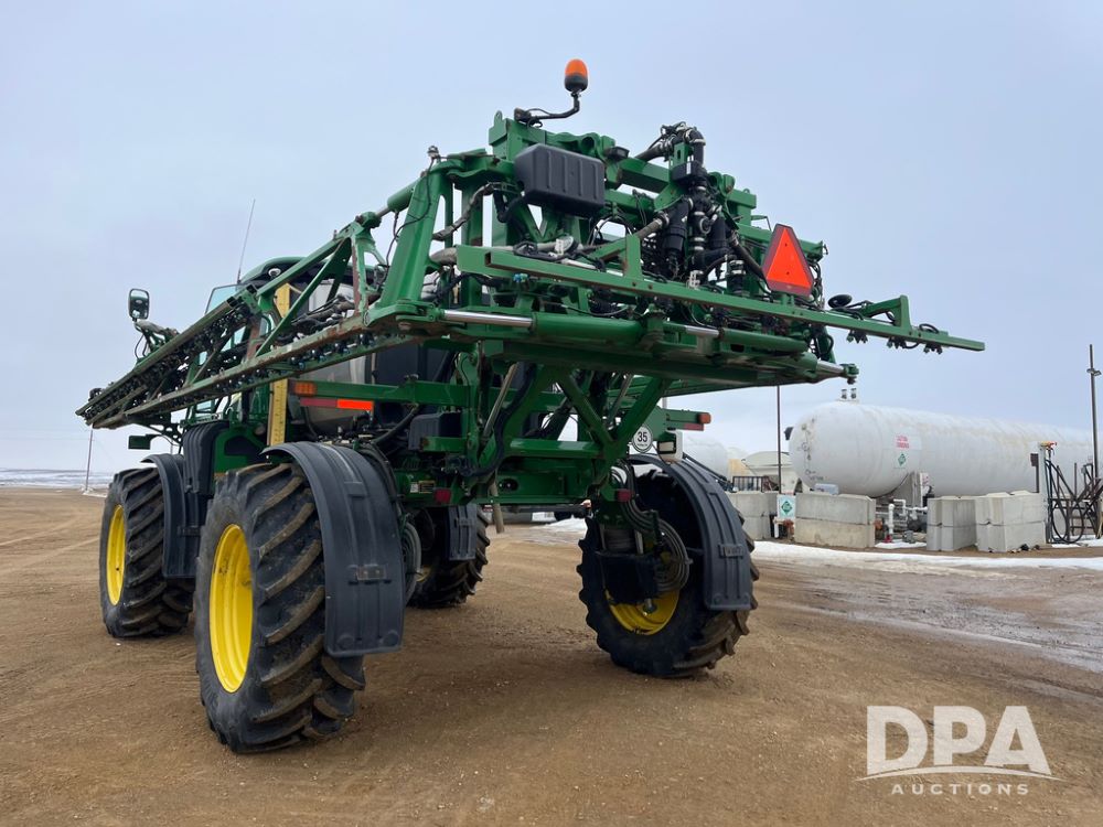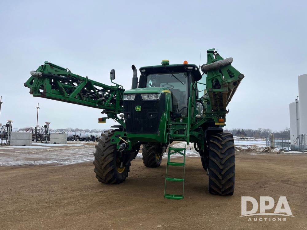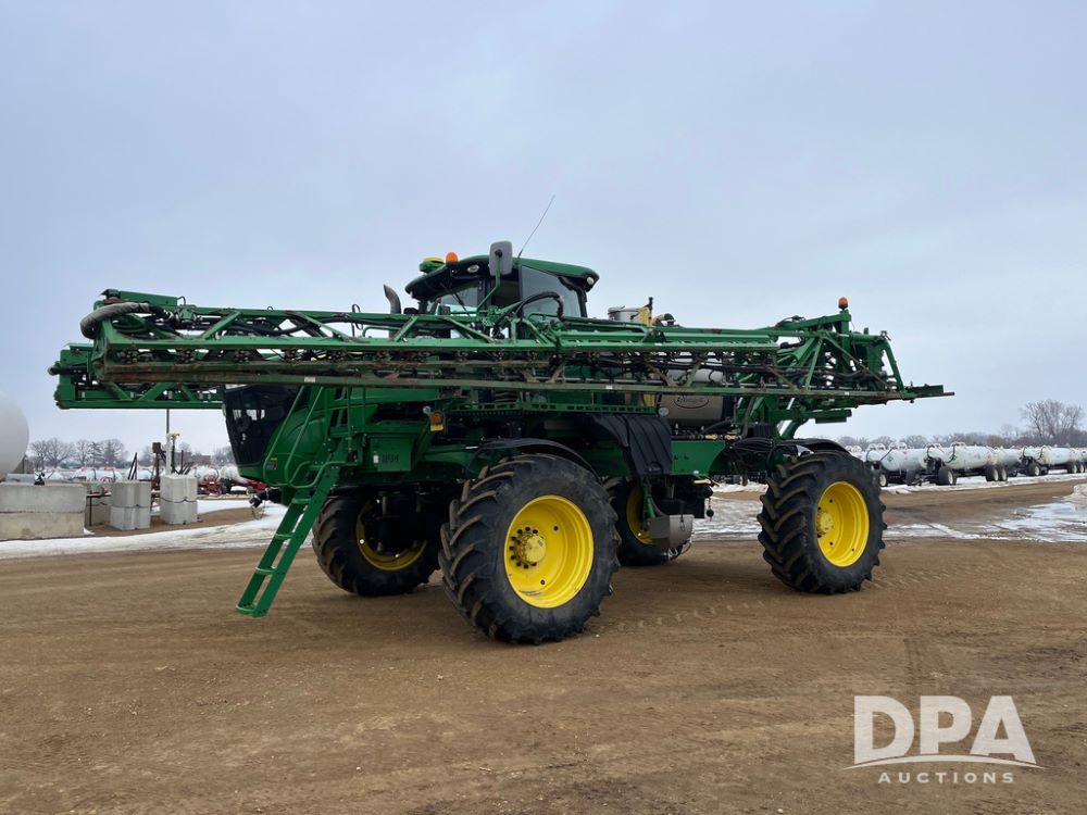 2019 John Deere R4038 Sprayer (JN4097, Unit 1834), John Deere diesel engine (S/N RG6090U060422), hydrostatic transmission, air conditioning, heat, Am/Fm radio, leather seat, buddy seat, beacon lights, 1000 gallon stainless steel liquid system, 120' boom, rear poly rinse tank, stainless steel chemical inductor, automatic solution control, front fill, Alliance Agri-Star 365 650/65R38 flotation tires, fenders, John Deere StarFire 7000 globe, John Deere monitor, shows 2,287 hours.