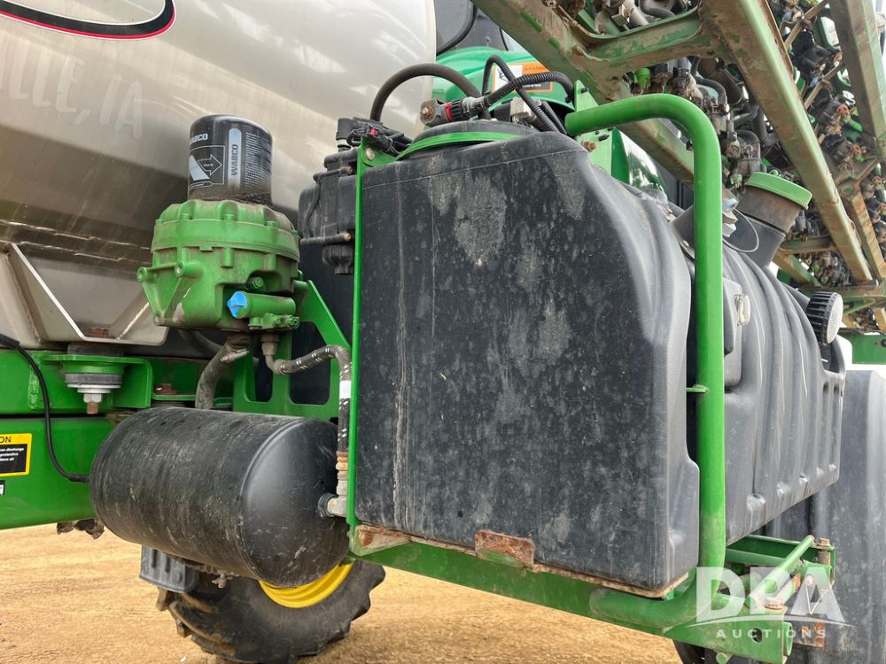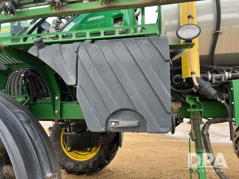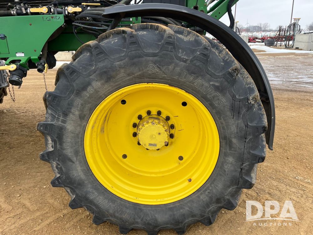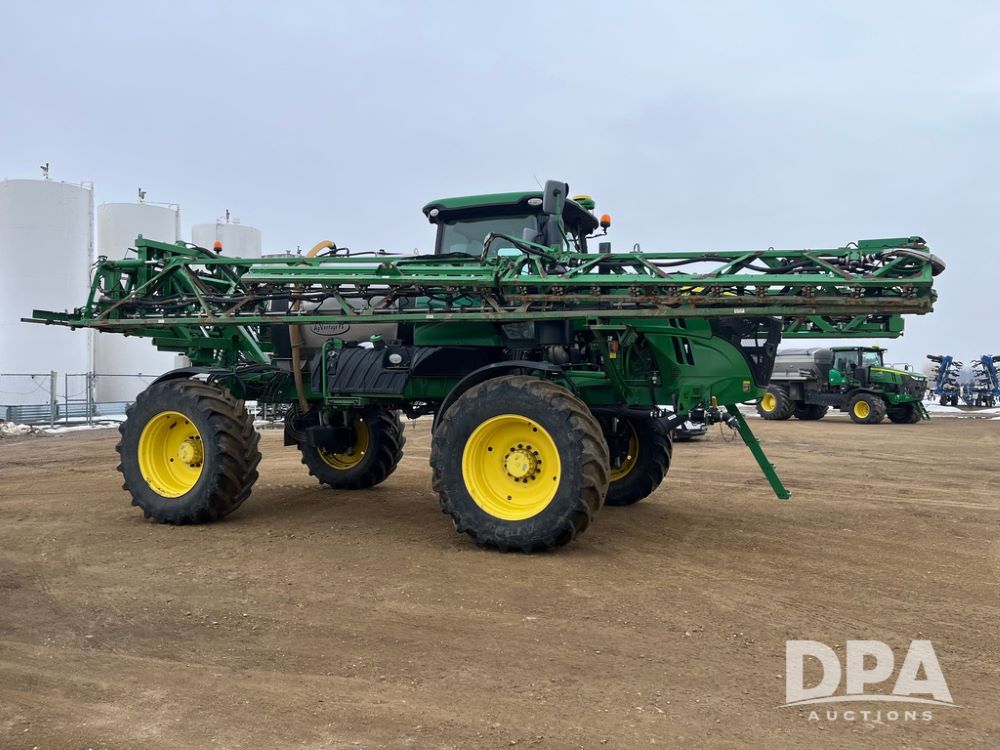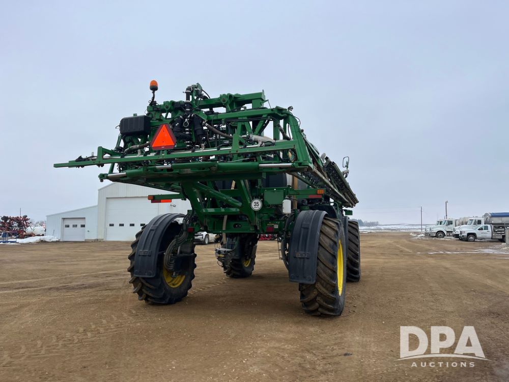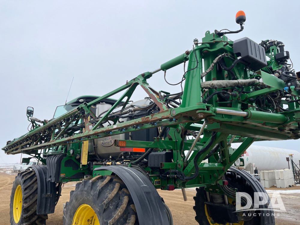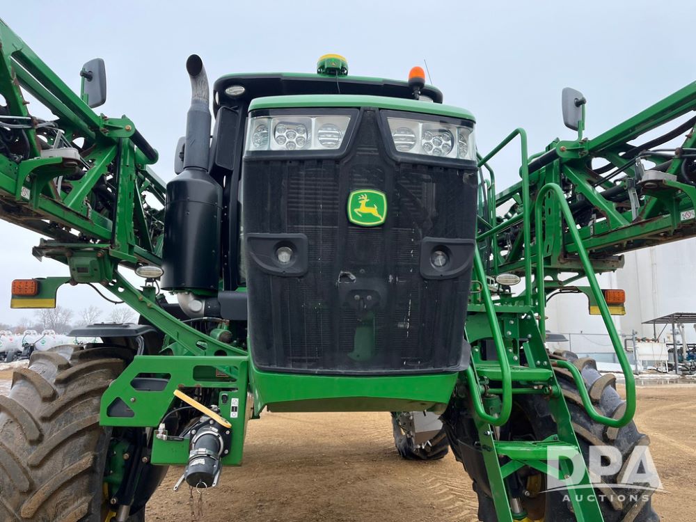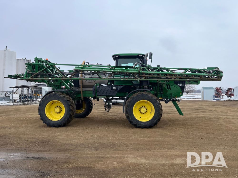 2019 John Deere R4038 Sprayer (JN4097, Unit 1834), John Deere diesel engine (S/N RG6090U060422), hydrostatic transmission, air conditioning, heat, Am/Fm radio, leather seat, buddy seat, beacon lights, 1000 gallon stainless steel liquid system, 120' boom, rear poly rinse tank, stainless steel chemical inductor, automatic solution control, front fill, Alliance Agri-Star 365 650/65R38 flotation tires, fenders, John Deere StarFire 7000 globe, John Deere monitor, shows 2,287 hours.