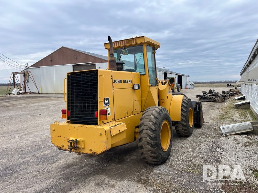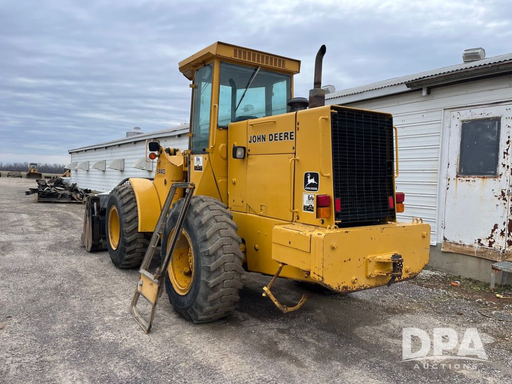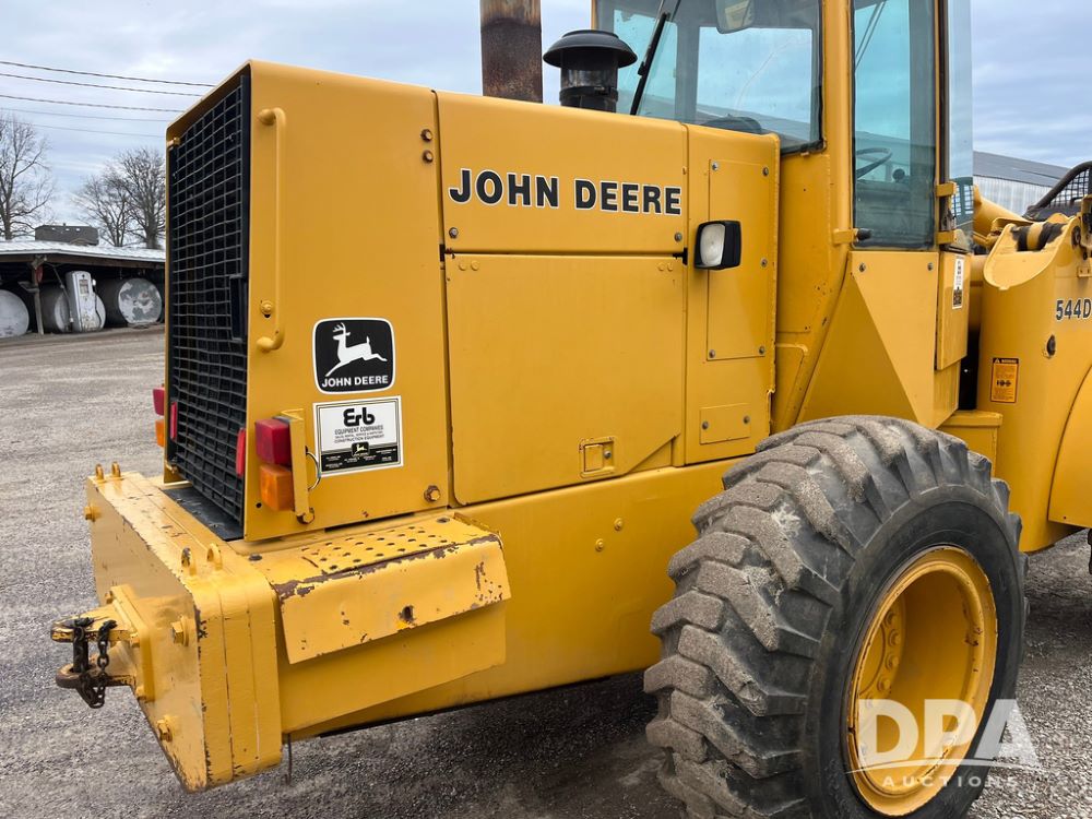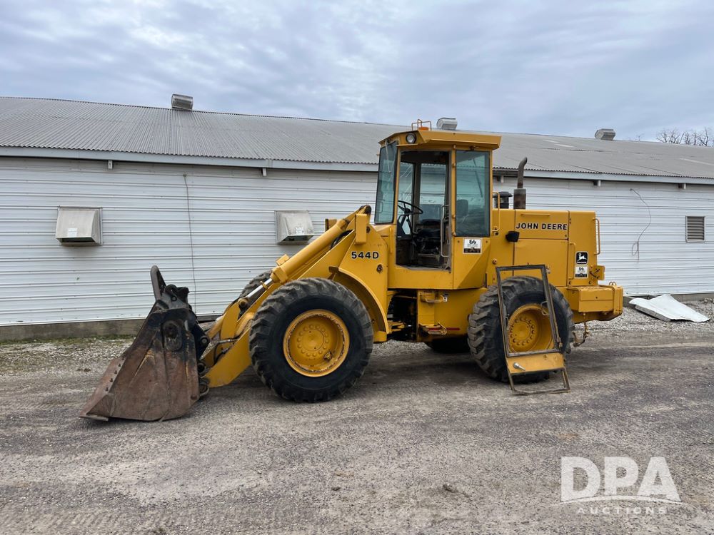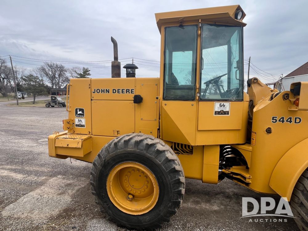1986 John Deere 544D Wheel Loader (JN4041), diesel engine, shuttle shift transmission, cab, lights, approx. 92in wide by 41in tall bucket, 17.5-25 tires, shows 1,425.5 hours.