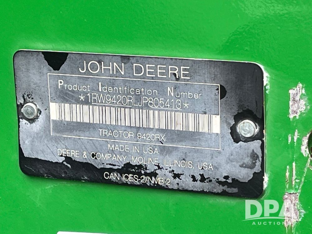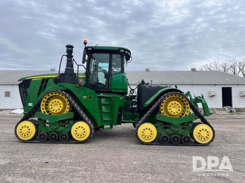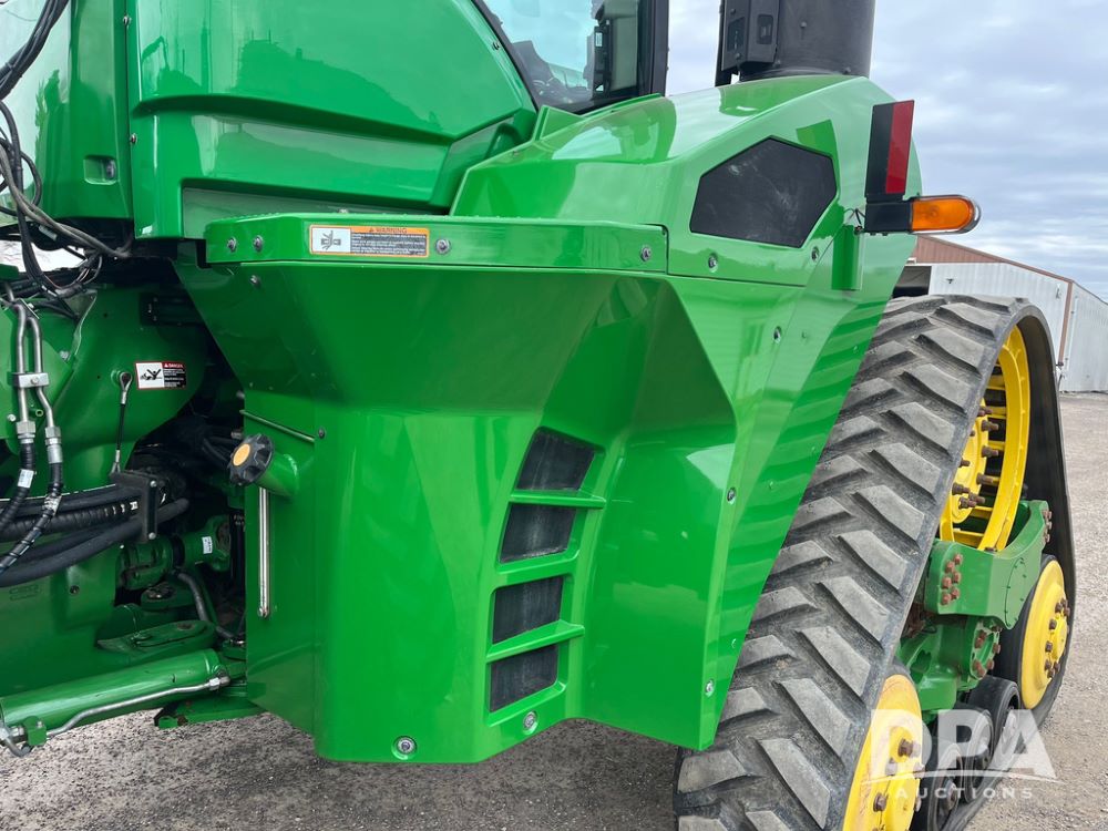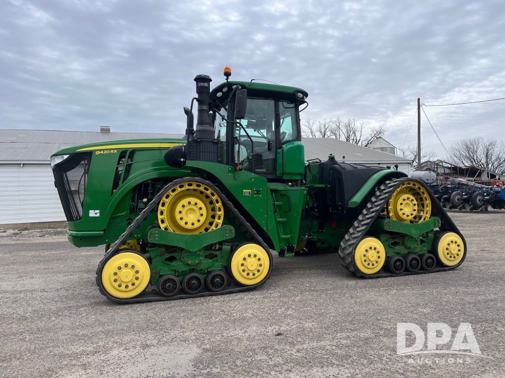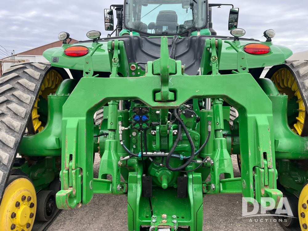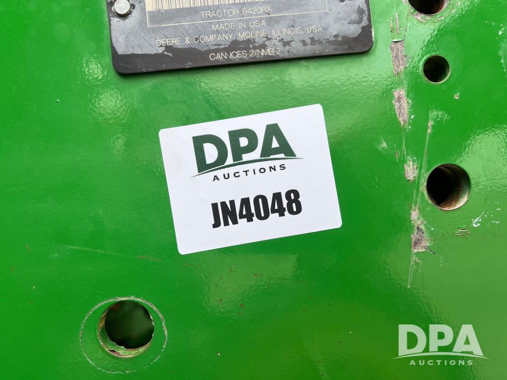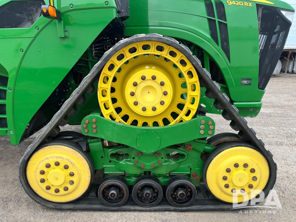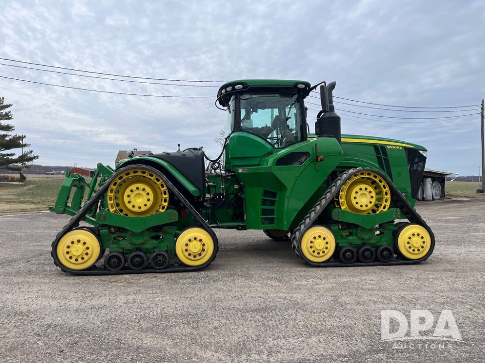 2018 John Deere 9420RX Tractor (JN4048), John Deere diesel engine, 420hp, powershift transmission, premium cab with cab suspension, air conditioning, heat, audio player, leather seats with buddy seat, 4 tracks, 18 inch tracks, high flow system pump, Commandview III with 4 post suspension, 5 rear remotes, 3 point hitch, optional capability (machine sync, Row Sense, AutoPath, AutoTrac, JD Link Connect), shows 2,273 hours.