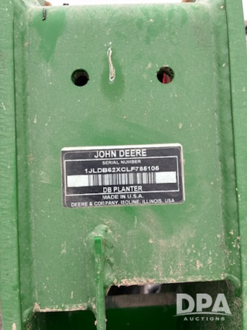 2019 John Deere DB62 Planter (LLD1688), 36 row, 20 inch spacing, air down force, hydraulic drive, row clutches, liquid tank included, mounted liquid tank, solid gauge wheels, Exactemerge, planter has less than 10,000 acres total on it.