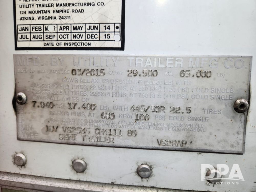 2016 Utility 3000R Reefer Trailer (JM767), 53 ft. x 102 in., tandem axle, air ride suspension, ThermoKing Precedent C-600 refer, quilted stainless steel rear swing cargo door, scuff plates, cold chute, bulk head, tires- 295/75R22.5, hours on reefer- 21,058.
