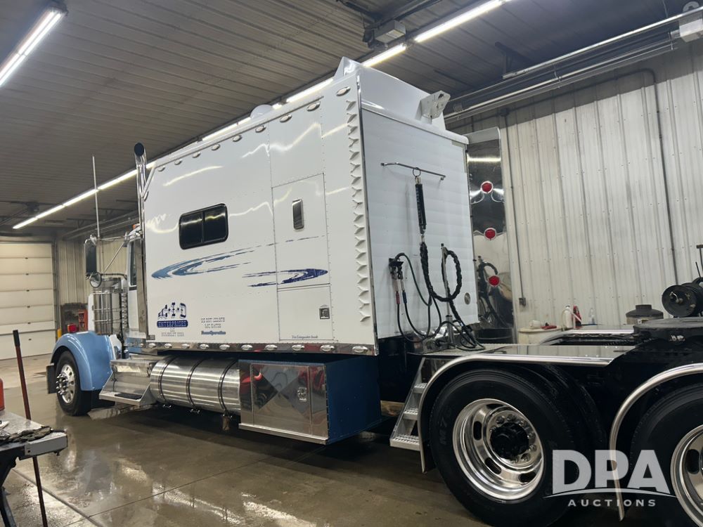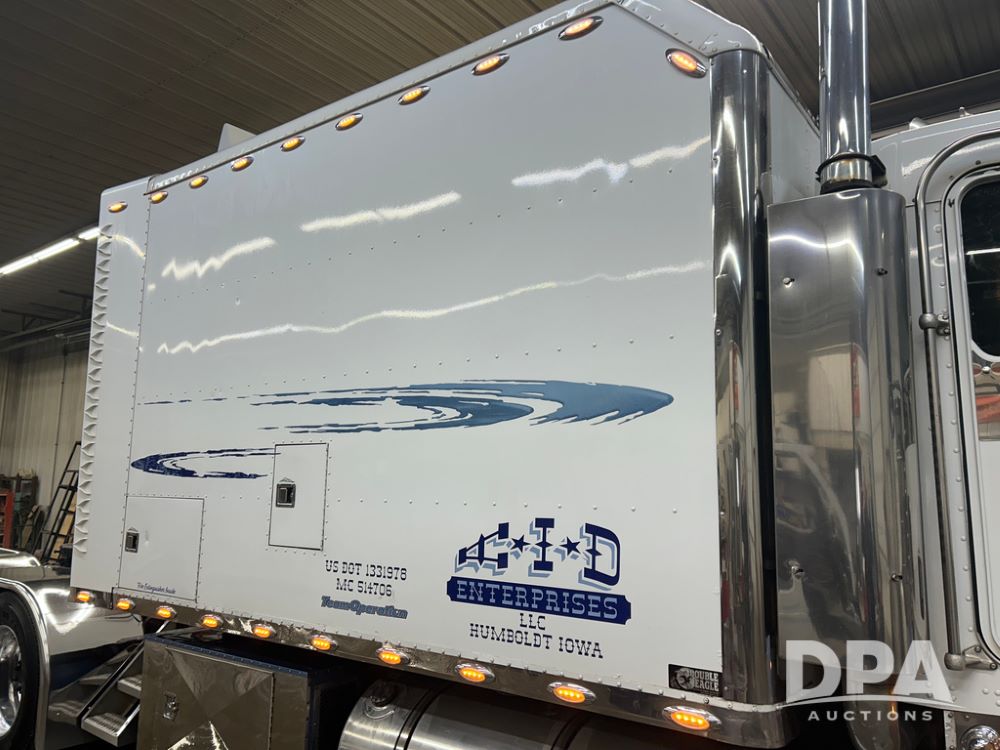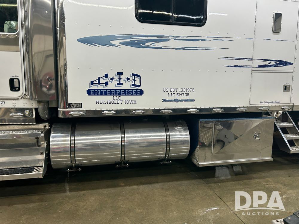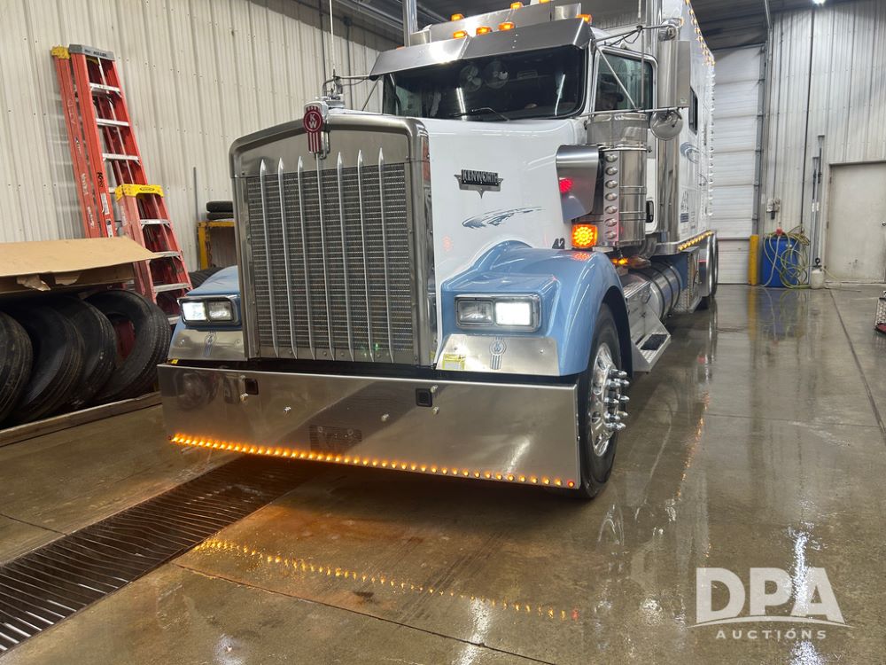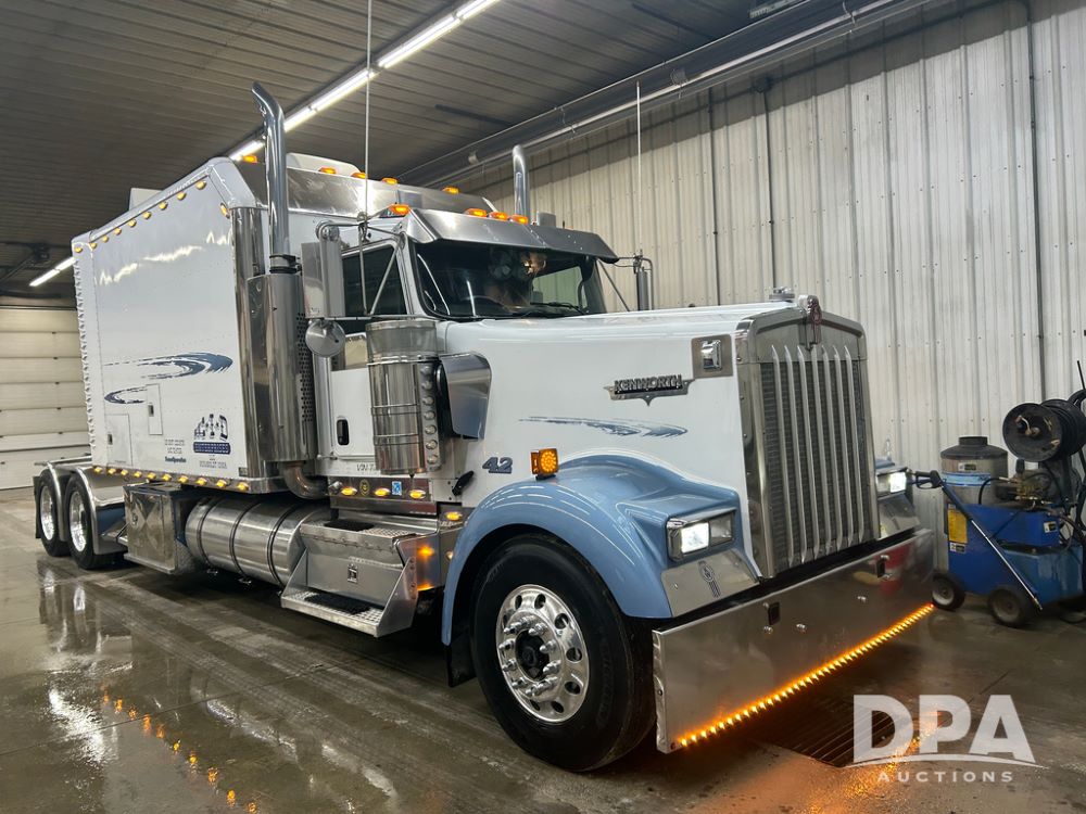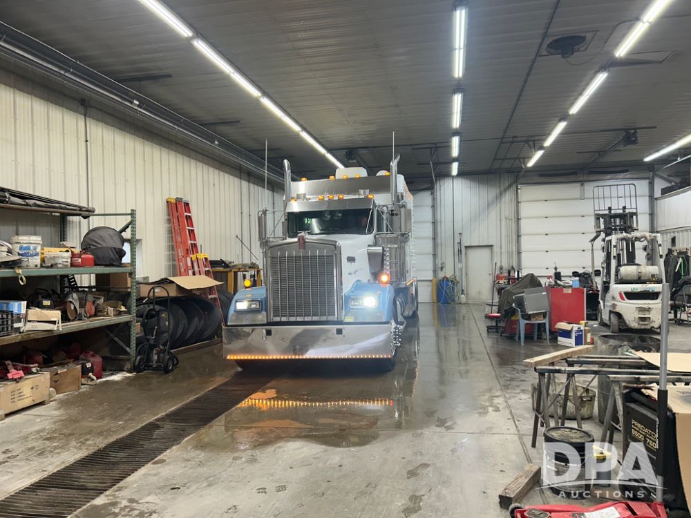 2007 Kenworth W900L Truck (CP1804), Cat C15 diesel engine (overhauled with paperwork from CAT), 550hp, Eaton Fuller 13 speed transmission, Double Eagle custom built Super Eagle 130in sleeper, air ride cab, air conditioning, heat, (dual controls and thermostat in sleeper), refrigerator, microwave, coffee pot, shower, stool, TV, multiple storage compartments in cab, Gen Pac diesel powered generator, dual chrome stacks, dual chrome air breathers, chrome bumper, tandem axle, air ride suspension, 366in wheel base, individual full stainless steel fenders, 285/75R24.5 tires, 1,185,608 miles on chassis, approx. 301,034 miles on overhauled engine.