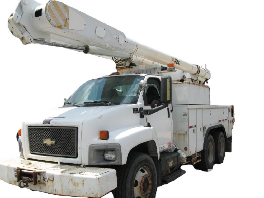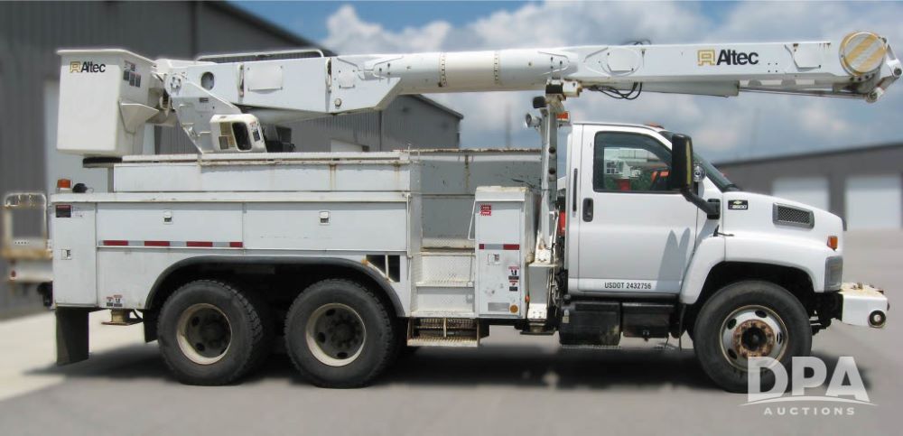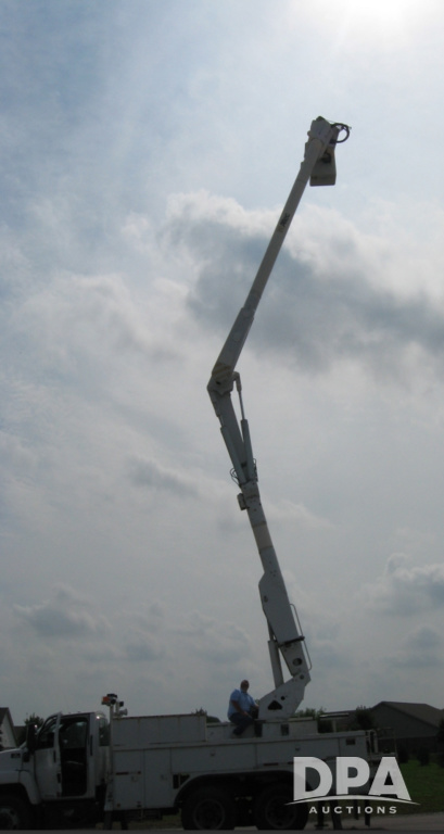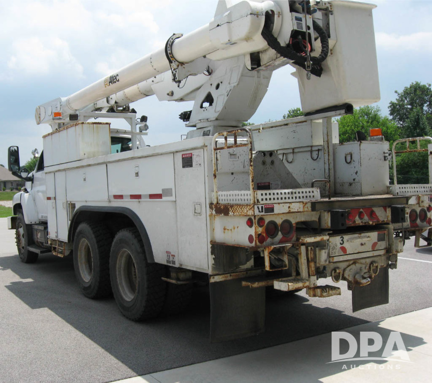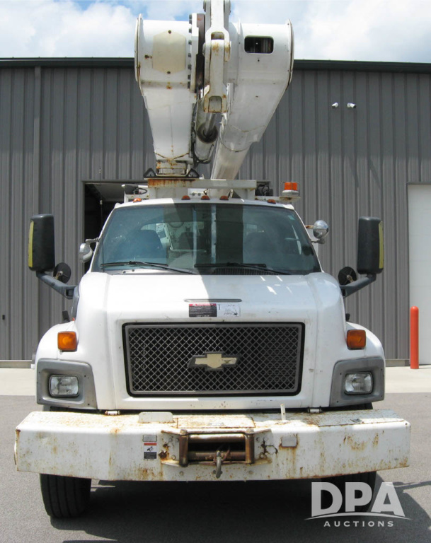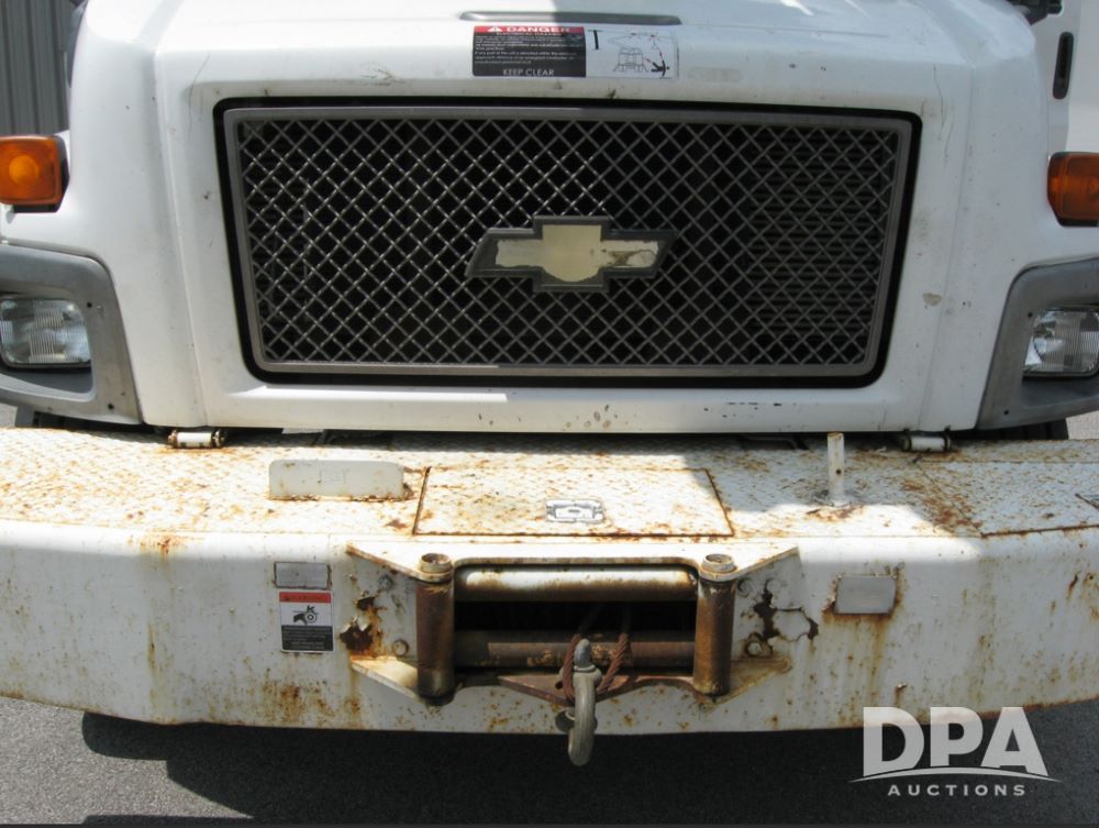 2005 Chevrolet C8500 C8C064 Bucket Truck (JM769), turbo diesel engine, 6 gear Allison transmission, spring ride suspension, air brakes, dual axle, air conditioning, heat, AM/FM radio, manual windows and locks, two fuel tanks, 96 inch wheel base, 11R 22.5 tires, 84,448 miles.