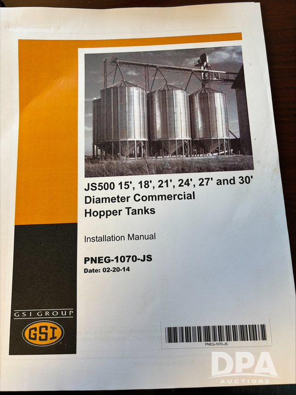 (3) GSI 30,000 bu Hopper Bins (ED5507), total of 3 GSI hopper bins with support structures, 30' diameter, 75'7" eve height, 83'9" overall height, approximately 39,491 bu, includes: all bin sheets, bin stiffeners, bottom bin floor sheets and aeration tubes (tubes will need replaced on one), all bottom aeration fans, all top aeration fans, all ladder access, 2 center roof supports, wind rings, supports for between legs of bin, miscellaneous small parts, manuals, bins have been dismantled.