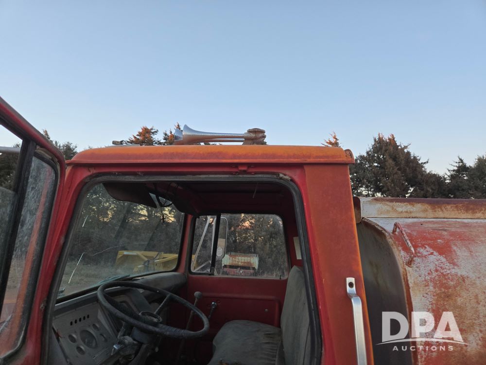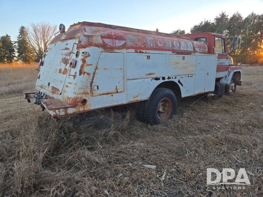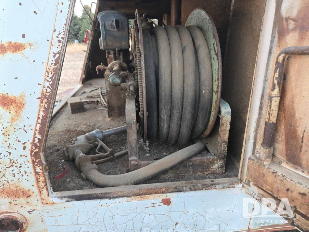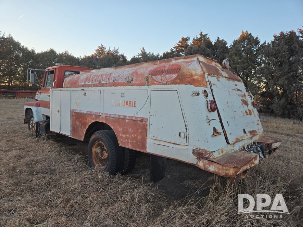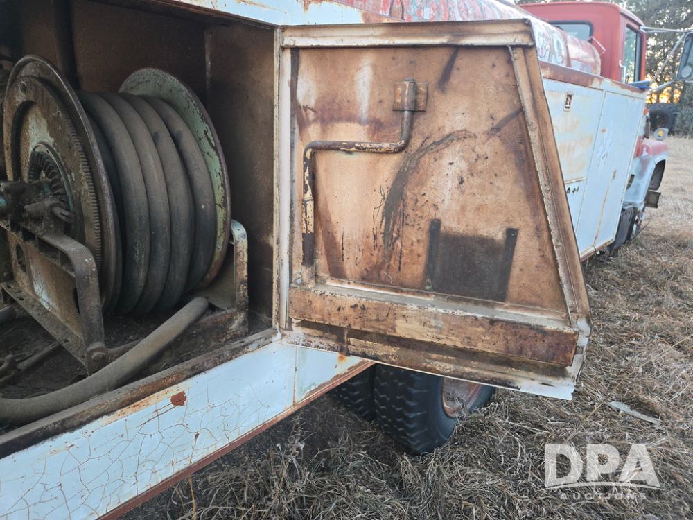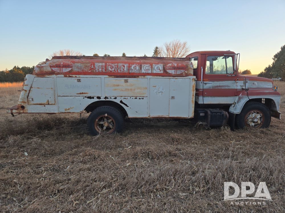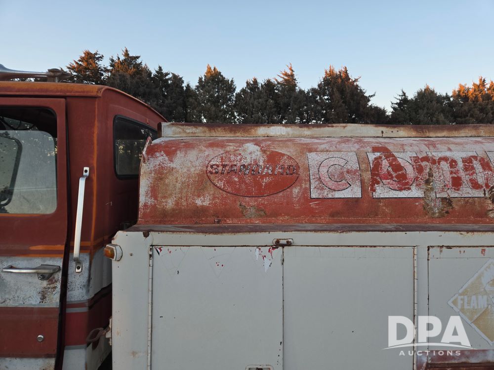 1971 Ford LN 750 S/A Fuel Truck (KS0105), 361 gas motor, 5 speed manual transmission, 2 speed rear axle, PTO, Dayton hubs, air brakes, air park brakes, dual fuel tanks, 10.00/20 tires, fuel body: 5 tanks totaling 1500 gallon, (1) 500 gallon, (1) 350 gallon, (1) 300 gallon, (1) 200 gallon, (1) 150 gallon, dual manual hose reels, only 1 with hose, PTO driven pump with meter.