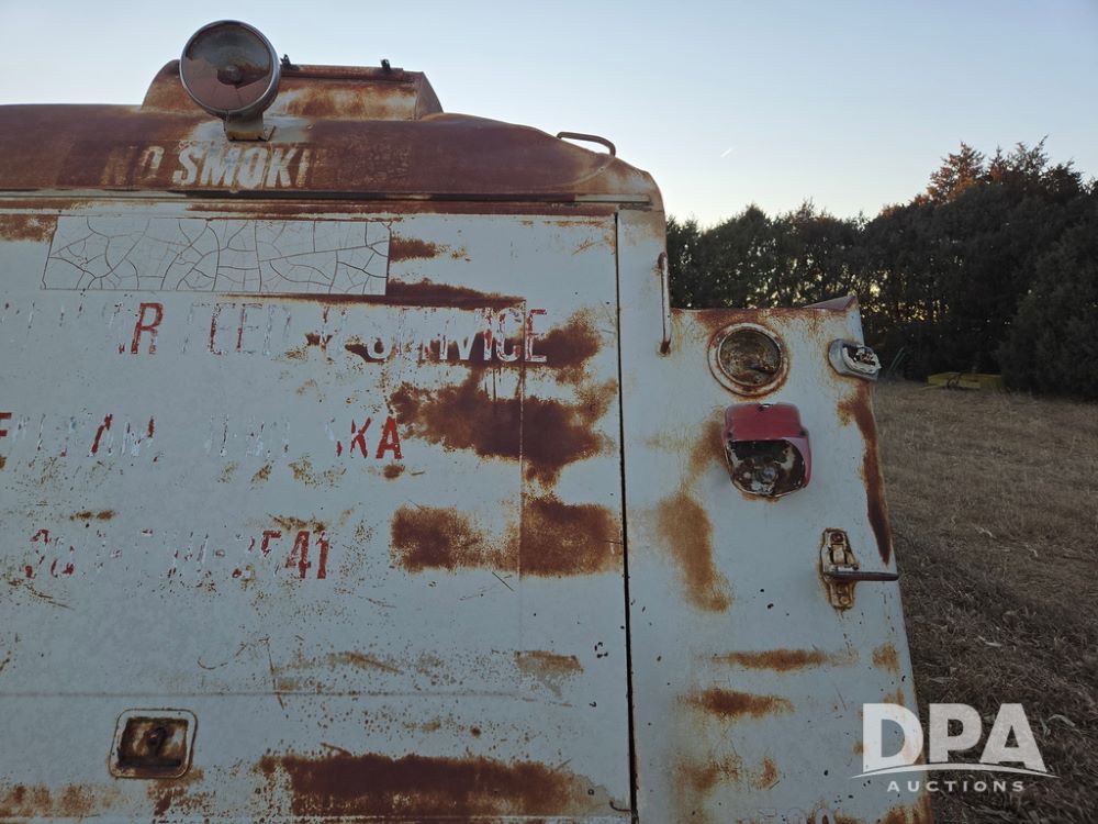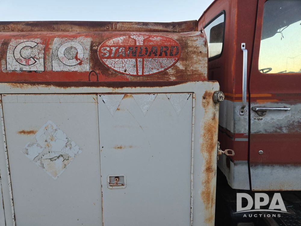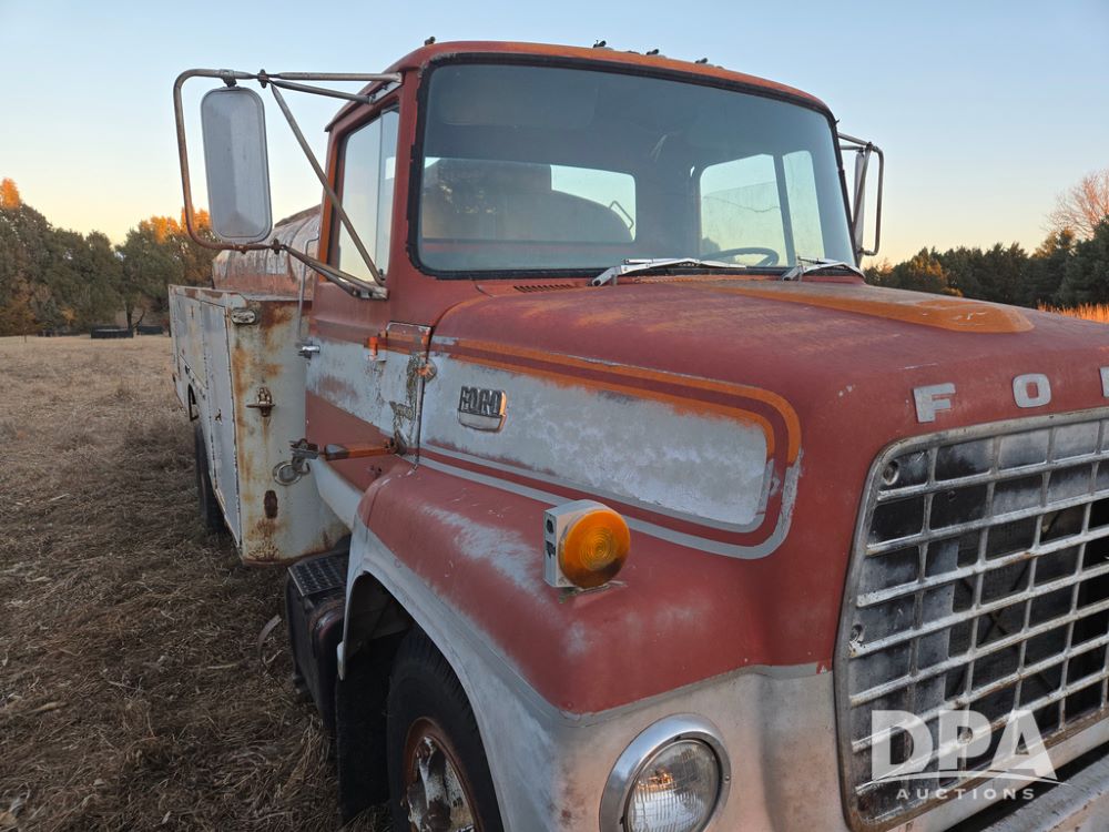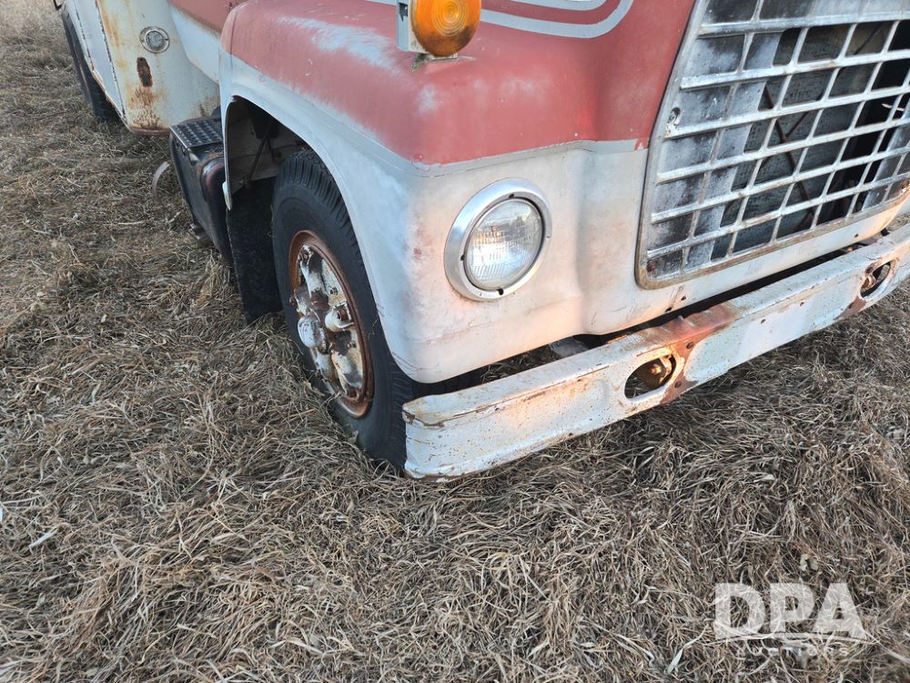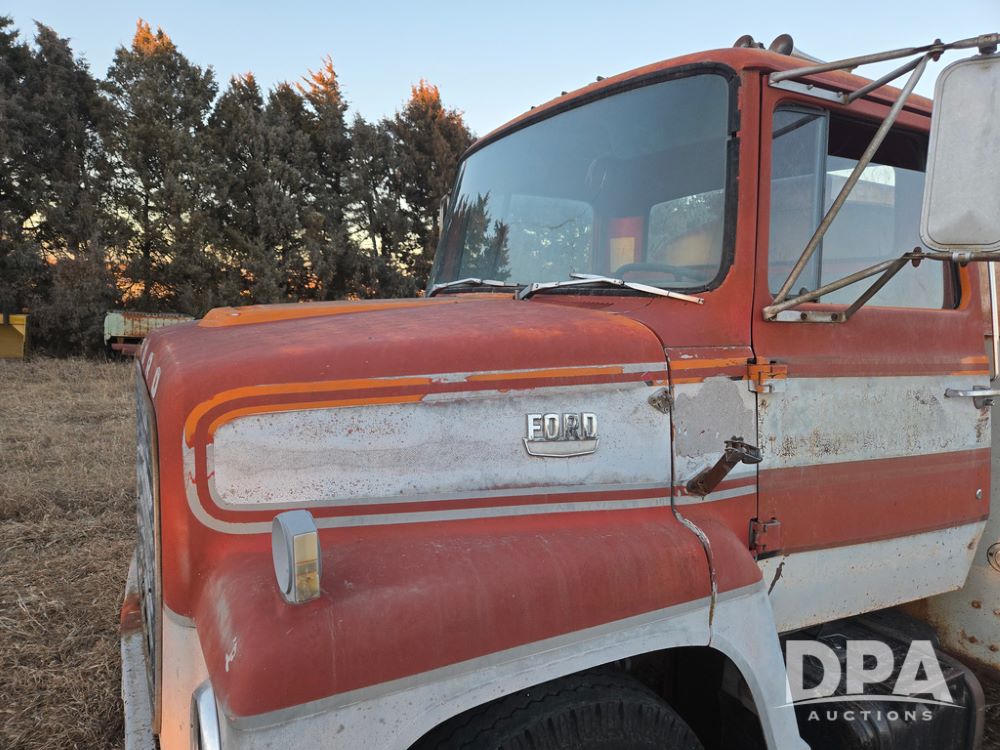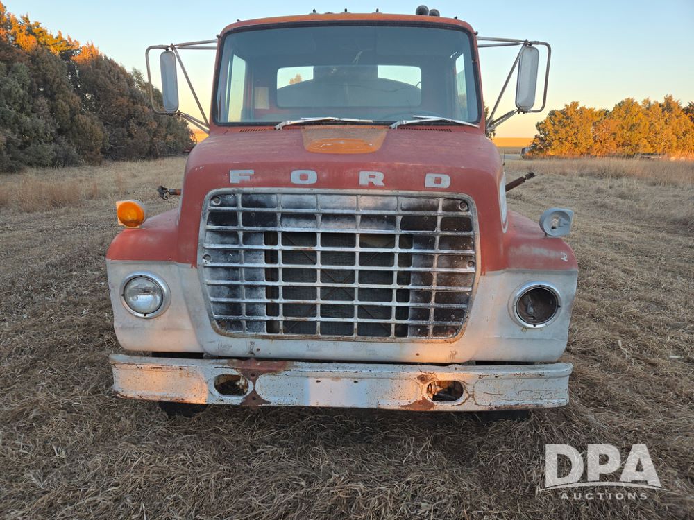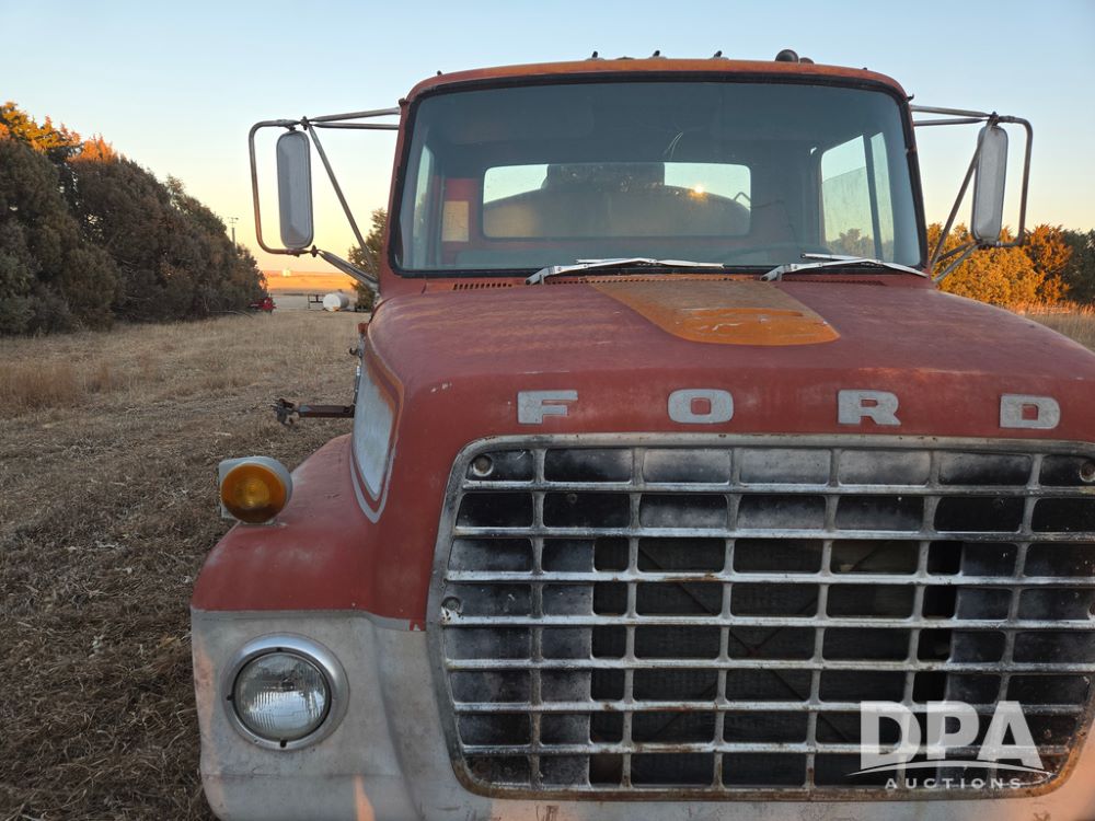 1971 Ford LN 750 S/A Fuel Truck (KS0105), 361 gas motor, 5 speed manual transmission, 2 speed rear axle, PTO, Dayton hubs, air brakes, air park brakes, dual fuel tanks, 10.00/20 tires, fuel body: 5 tanks totaling 1500 gallon, (1) 500 gallon, (1) 350 gallon, (1) 300 gallon, (1) 200 gallon, (1) 150 gallon, dual manual hose reels, only 1 with hose, PTO driven pump with meter.