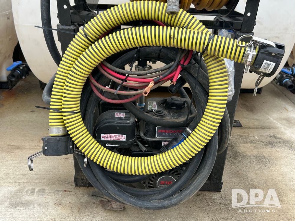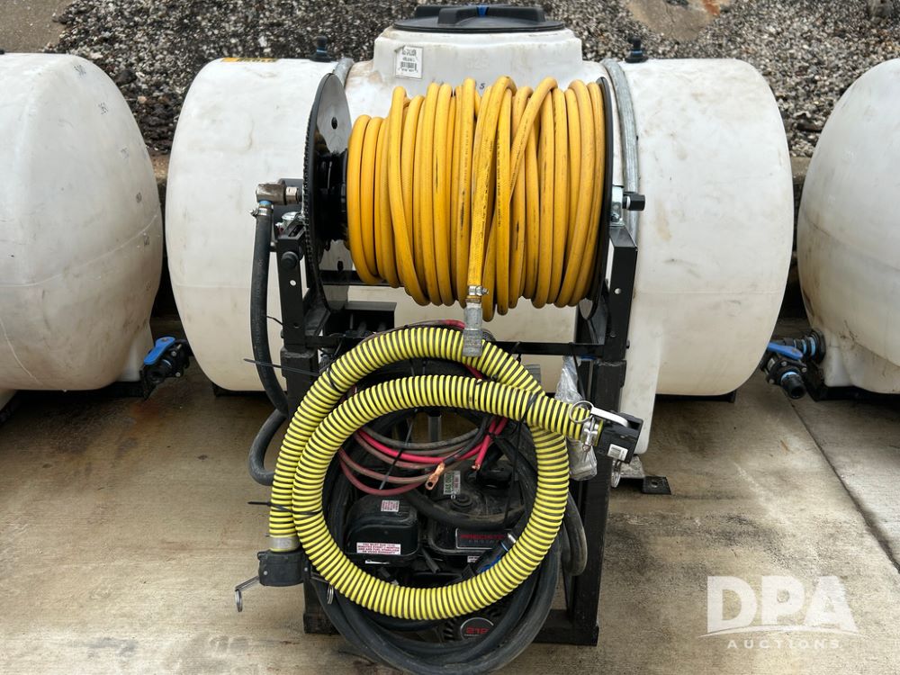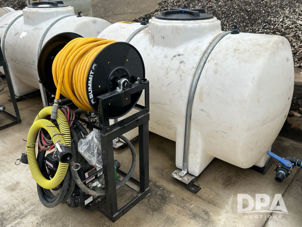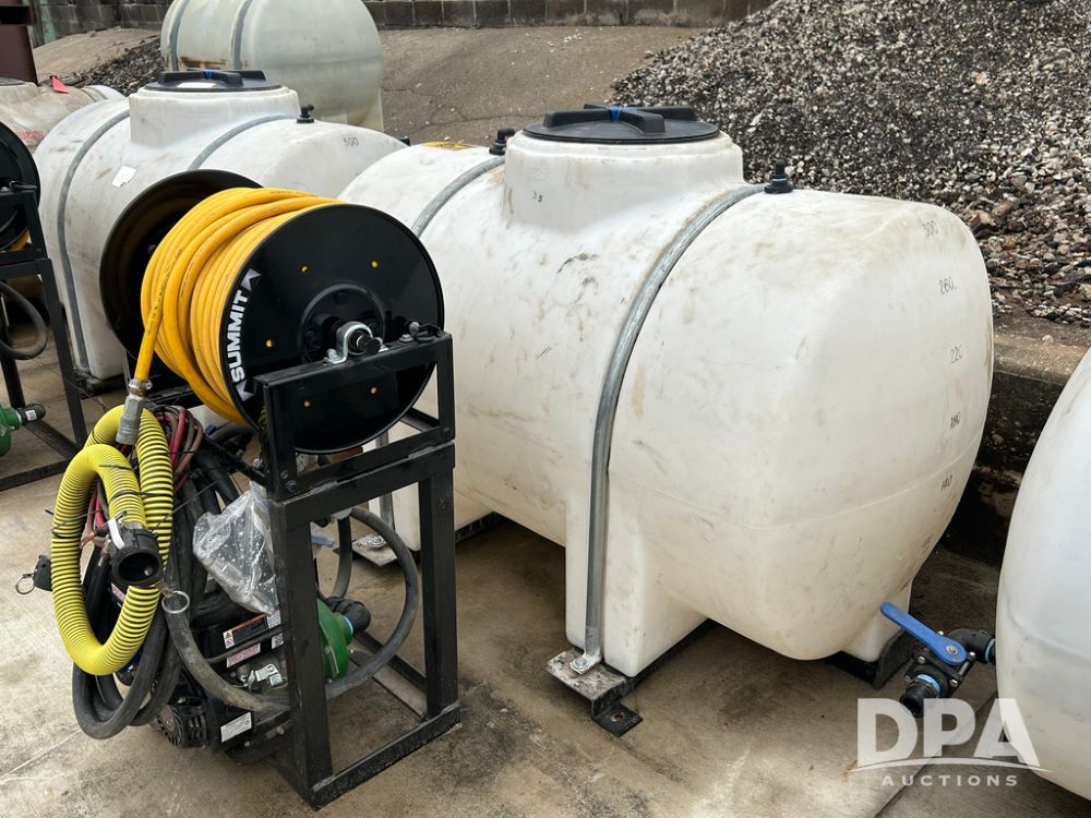 325 Gallon Sprayer System with Electric Hose Reel (LLD1696, Unit 35), 325 gallon poly tank, dual agitation, Summit MFG 300 foot hose reel, quick connect fitting, spray hose (in good condition), spray to tank connection hose, 20 foot whip hose, power and ground cables, 800 PSI quick connect Hudson spray gun, 6.5 HP Predator gasoline engine, Ace centrifugal pump GE-660-LE, 110 GPM max. flow, 120 PSI max pressure, plumbed for adjustable PSI, sediment filter.