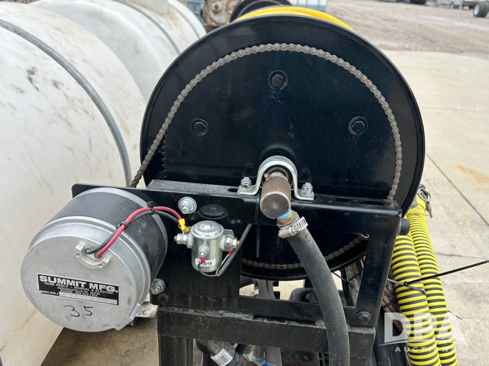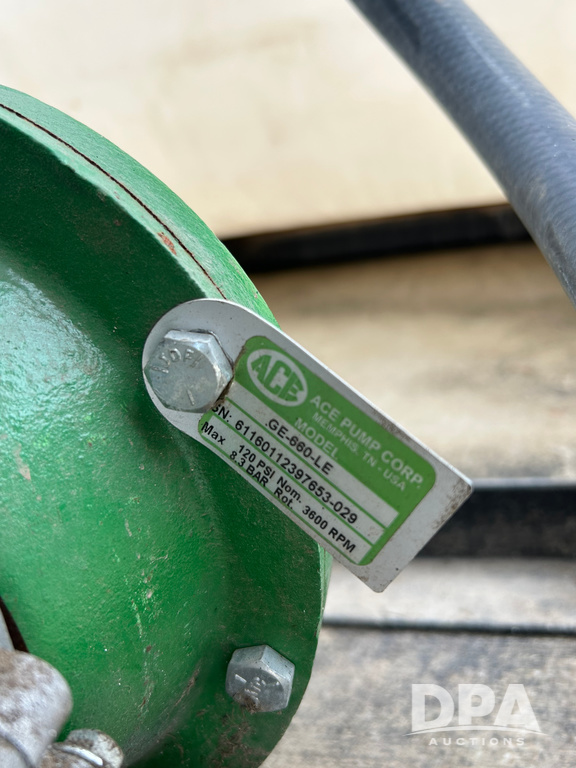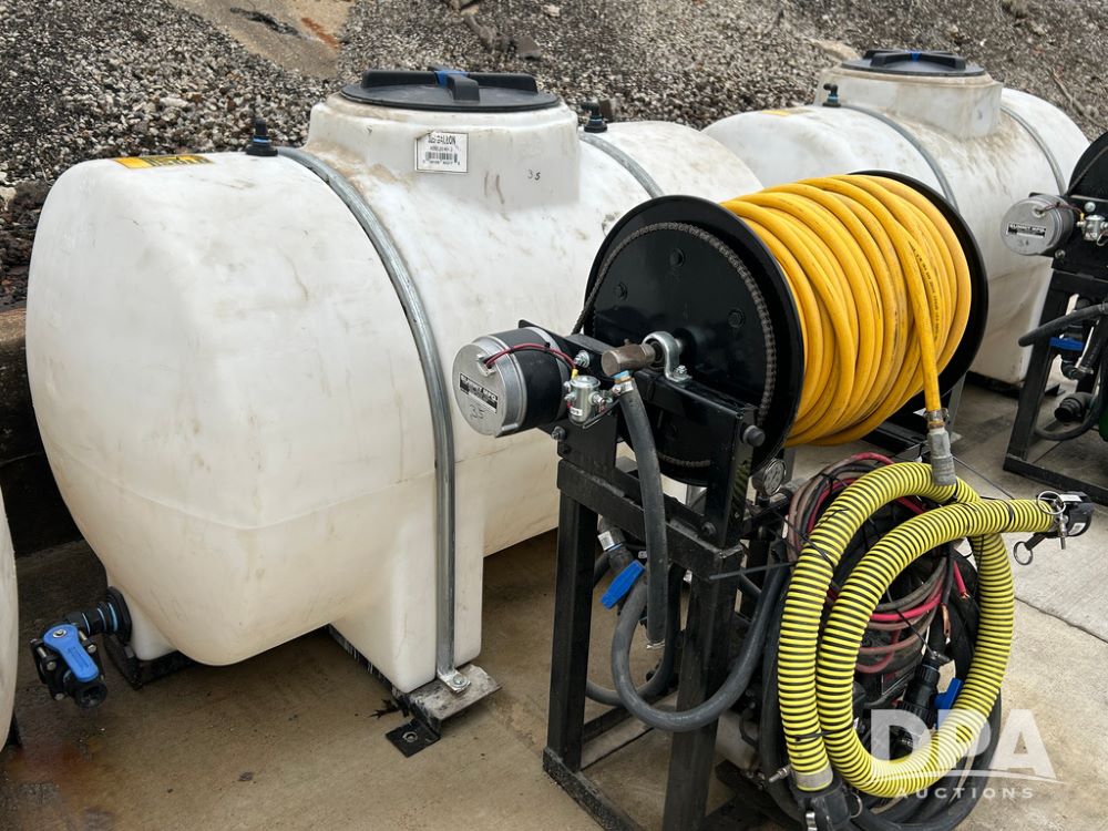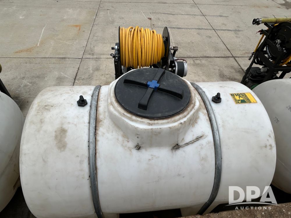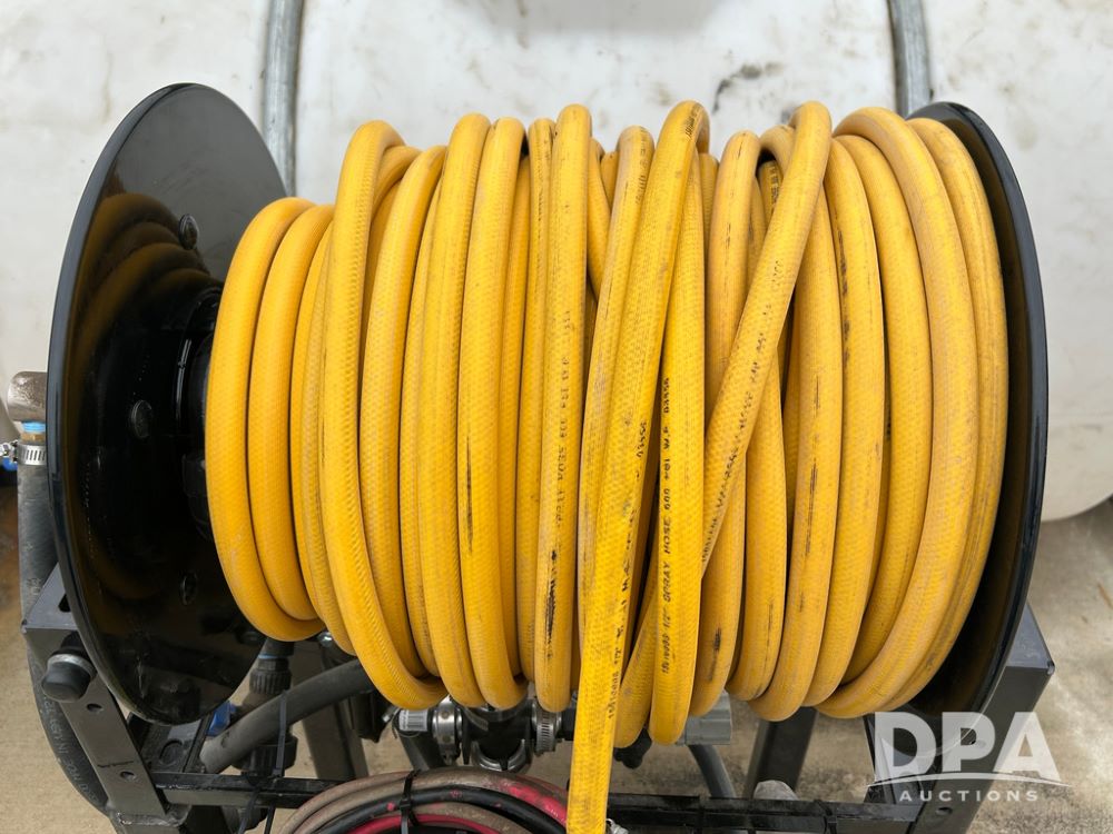 325 Gallon Sprayer System with Electric Hose Reel (LLD1696, Unit 35), 325 gallon poly tank, dual agitation, Summit MFG 300 foot hose reel, quick connect fitting, spray hose (in good condition), spray to tank connection hose, 20 foot whip hose, power and ground cables, 800 PSI quick connect Hudson spray gun, 6.5 HP Predator gasoline engine, Ace centrifugal pump GE-660-LE, 110 GPM max. flow, 120 PSI max pressure, plumbed for adjustable PSI, sediment filter.
