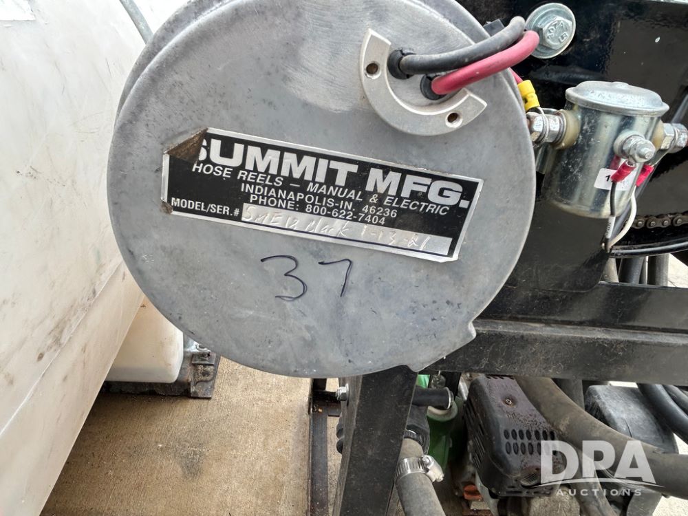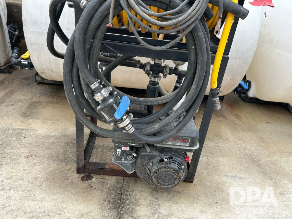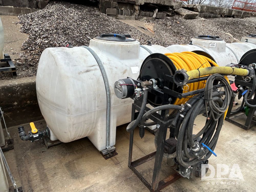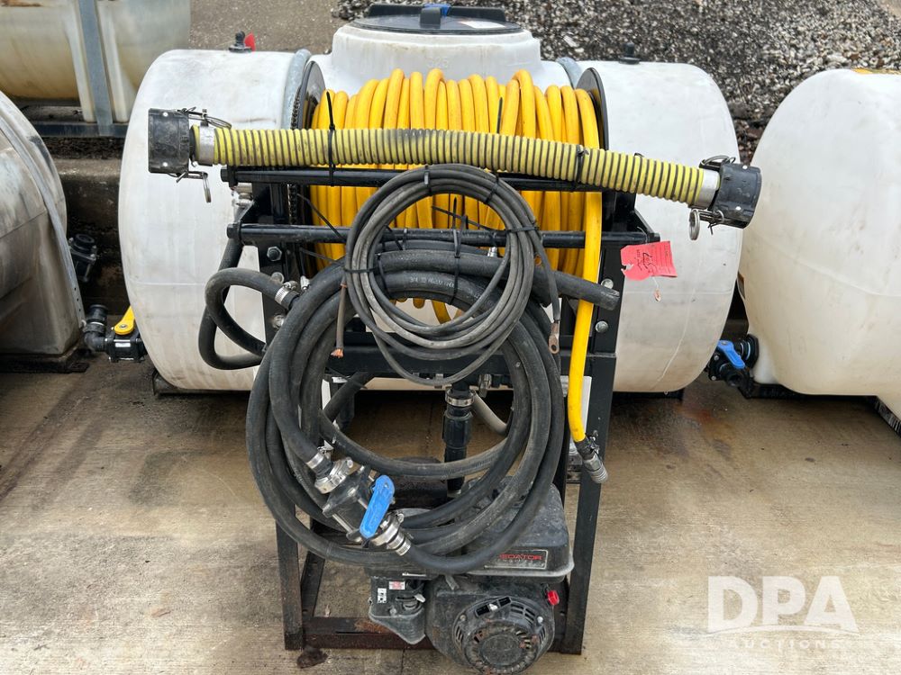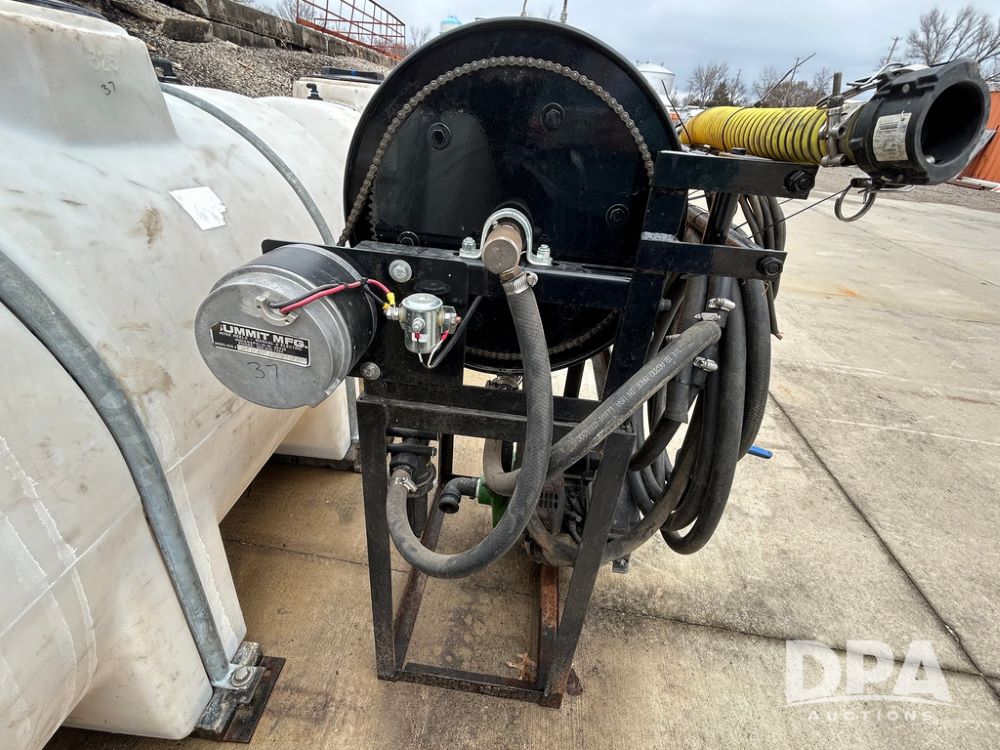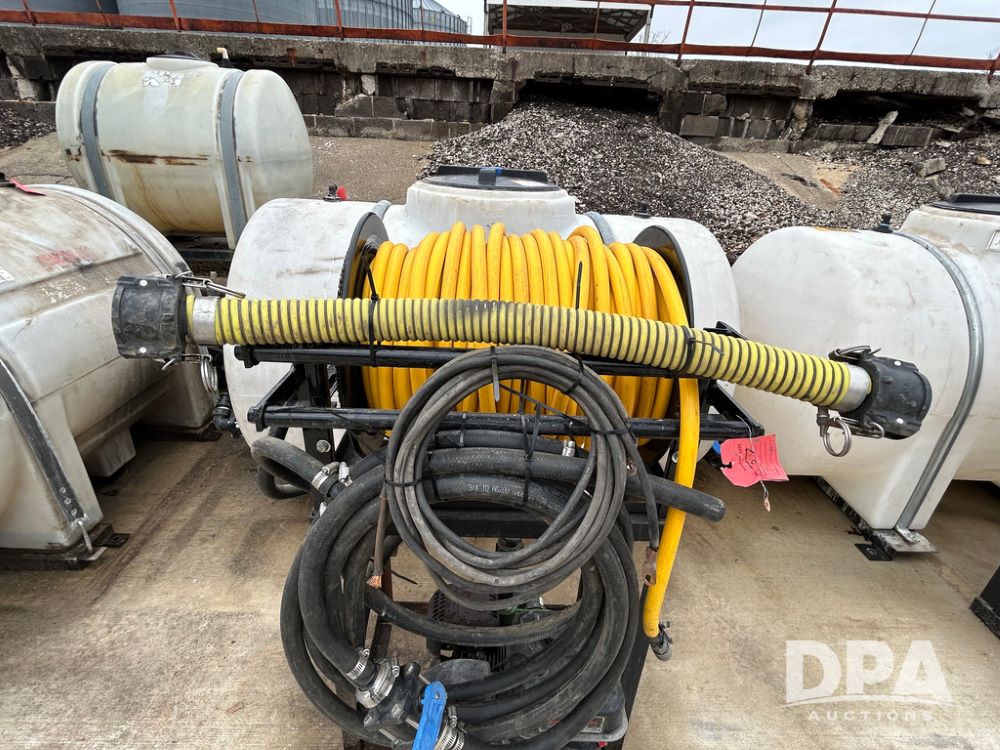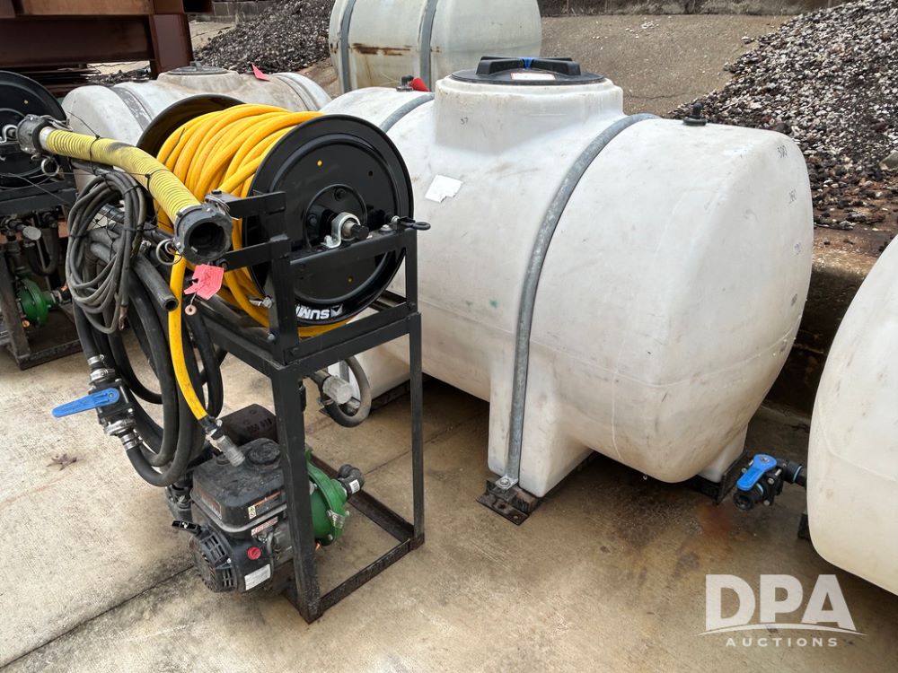 325 Gallon Sprayer System with Electric Hose Reel (LLD1698, Unit 37), 325 gallon poly tank, dual agitation, Summit MFG 300 foot hose reel, quick connect fitting, spray hose (in good condition), spray to tank connection hose, 20 foot whip hose, power and ground cables, 800 PSI quick connect Hudson spray gun, 6.5 HP Predator gasoline engine, Ace centrifugal pump GE-660-LE, 110 GPM max. flow, 120 PSI max pressure, plumbed for adjustable PSI, sediment filter.
