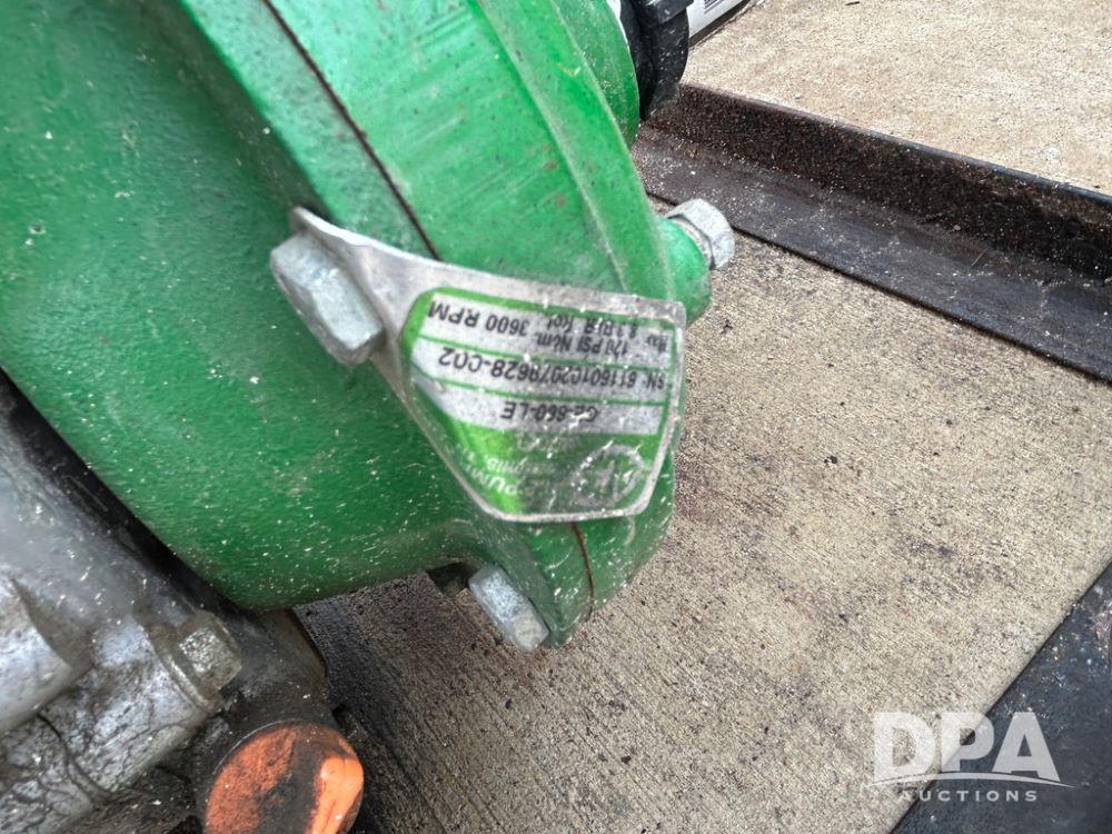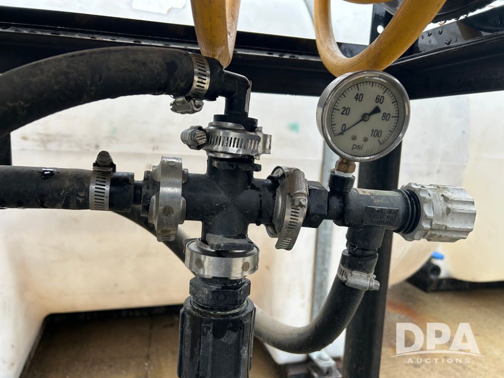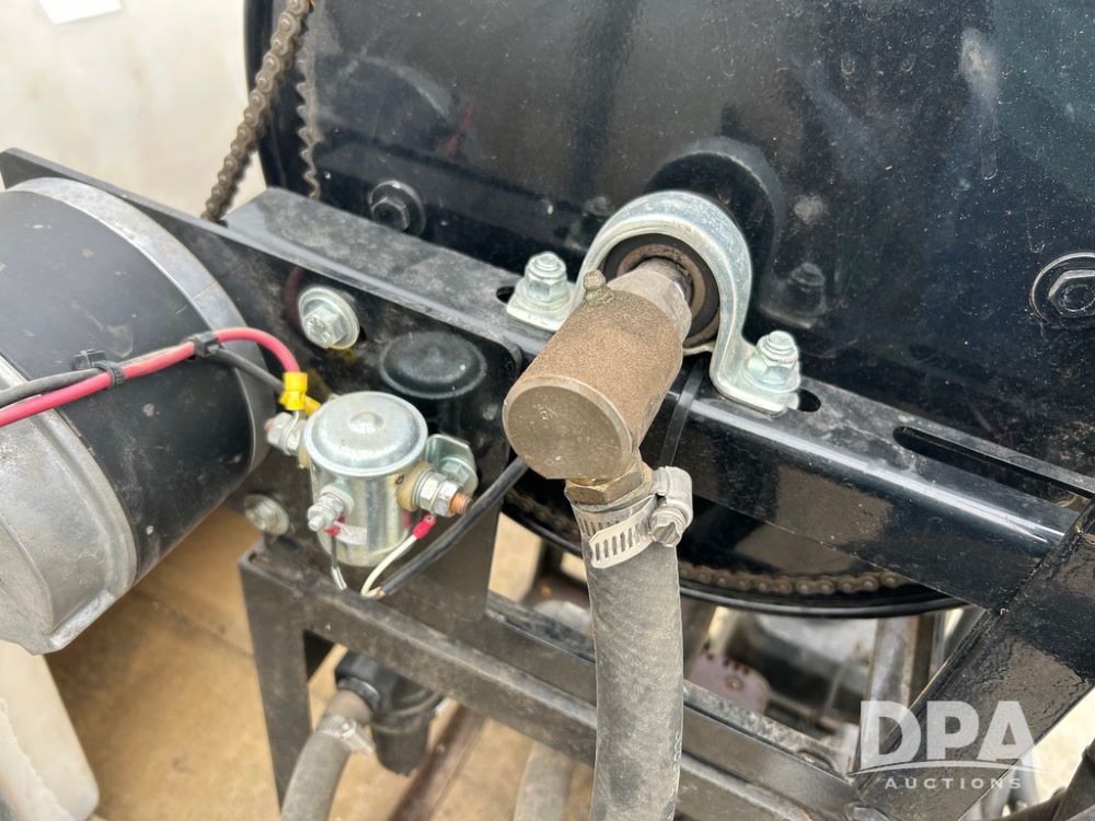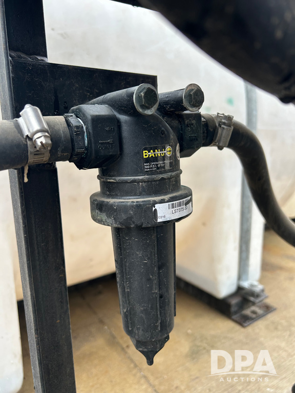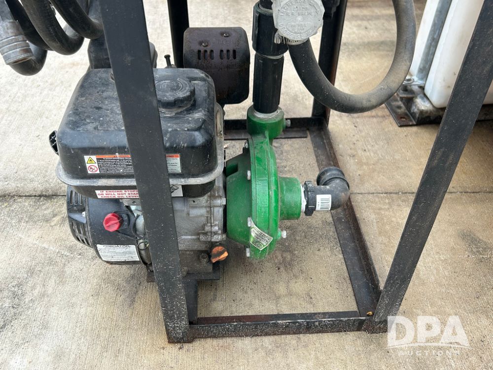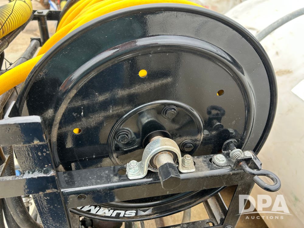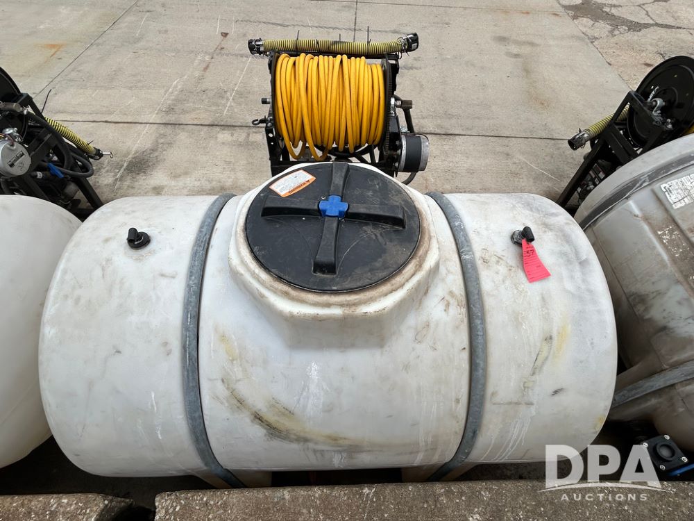 325 Gallon Sprayer System with Electric Hose Reel (LLD1698, Unit 37), 325 gallon poly tank, dual agitation, Summit MFG 300 foot hose reel, quick connect fitting, spray hose (in good condition), spray to tank connection hose, 20 foot whip hose, power and ground cables, 800 PSI quick connect Hudson spray gun, 6.5 HP Predator gasoline engine, Ace centrifugal pump GE-660-LE, 110 GPM max. flow, 120 PSI max pressure, plumbed for adjustable PSI, sediment filter.