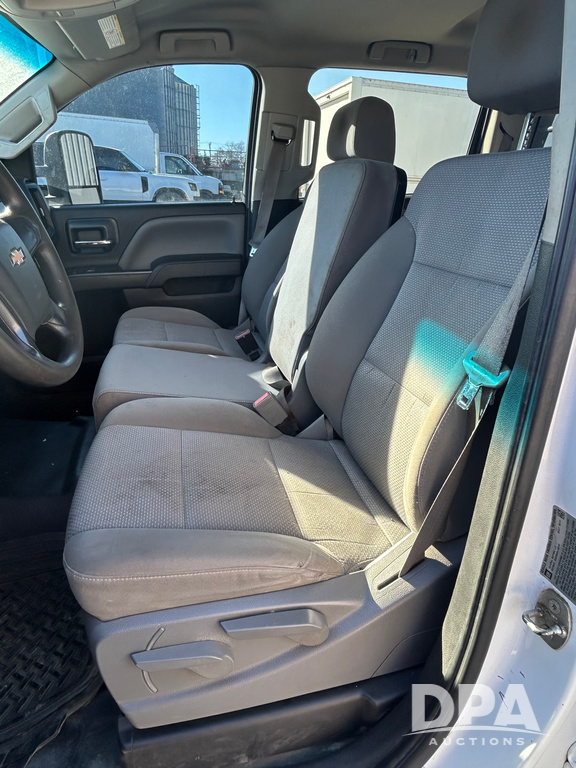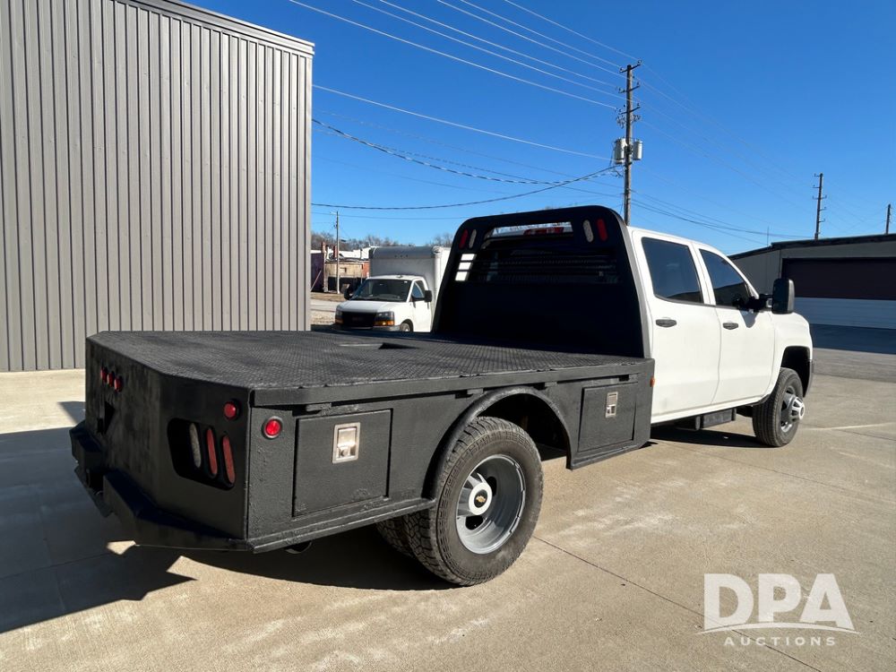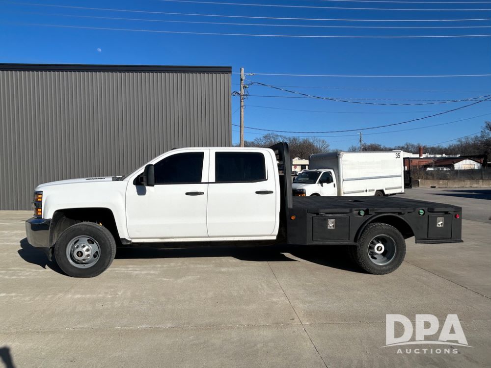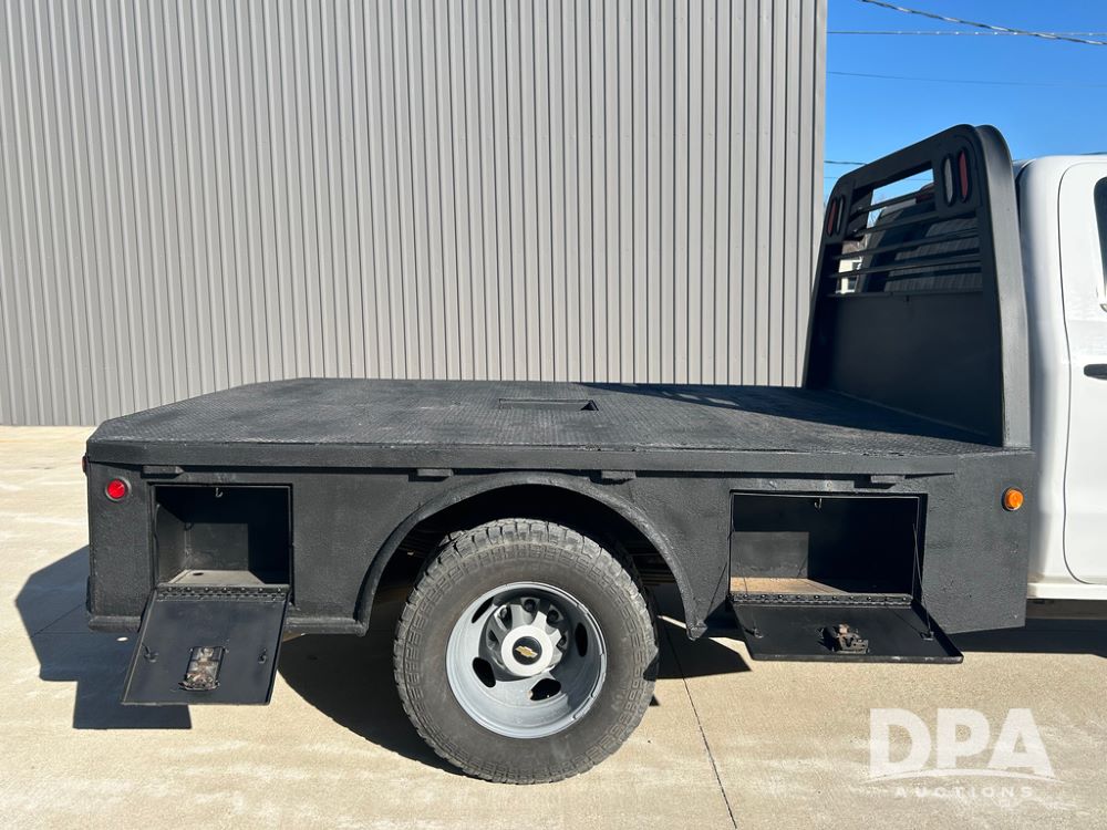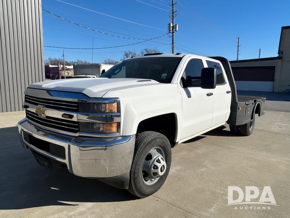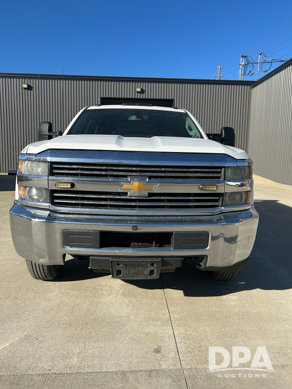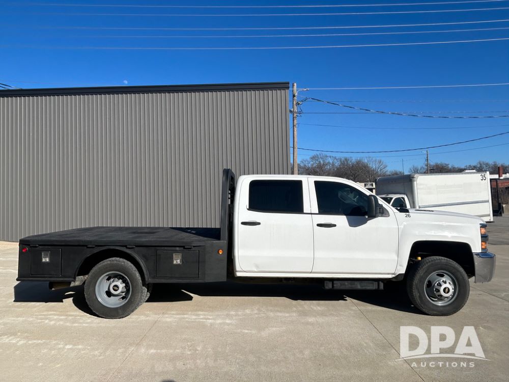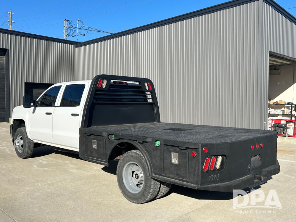 2015 Chevy Silverado 3500 Flatbed Truck (LLD1691, Unit 26), 6.6 Duramax diesel engine, *DELETED*, 4WD, Bluetooth, heat, air conditioning, skirted flatbed with tool boxes, shows 206,698 miles.