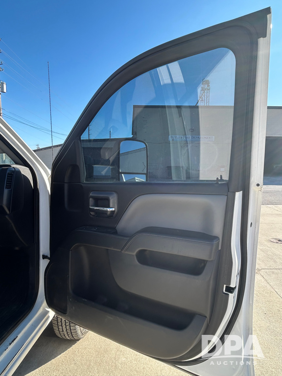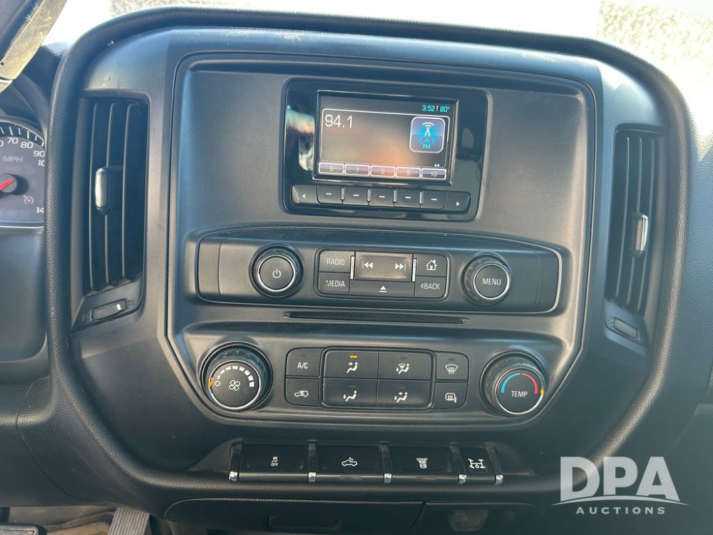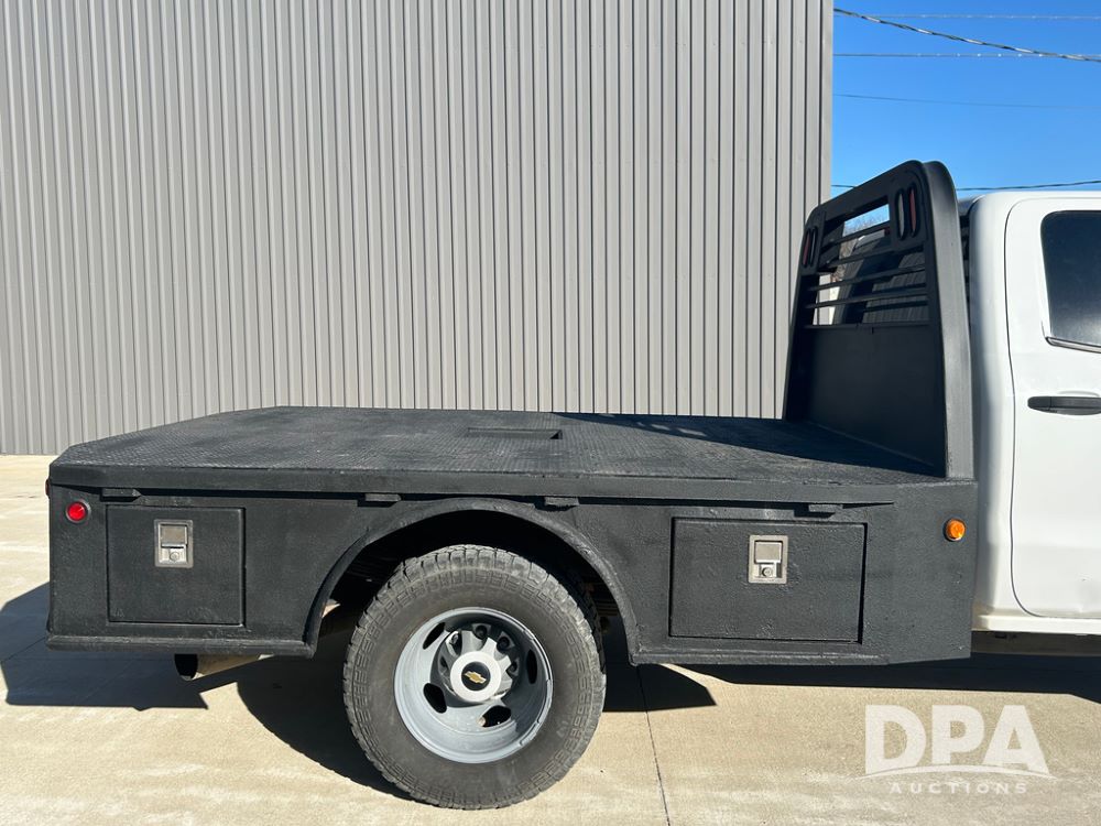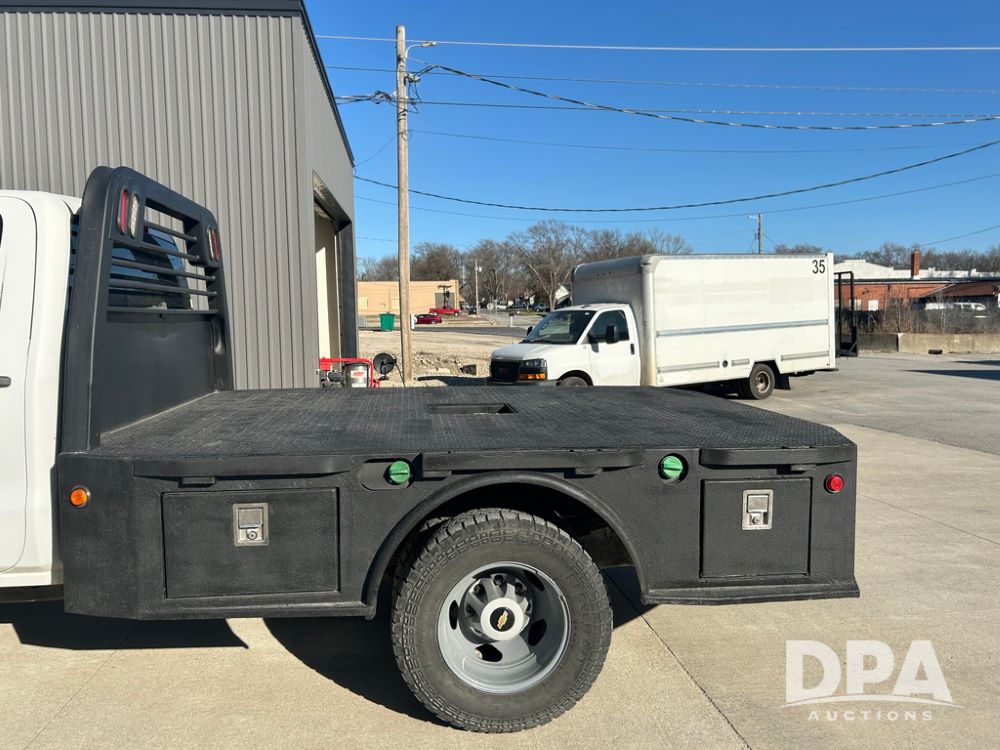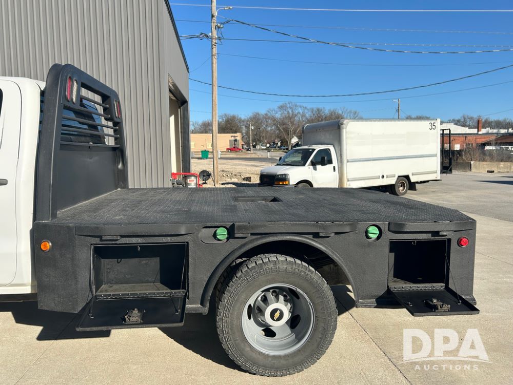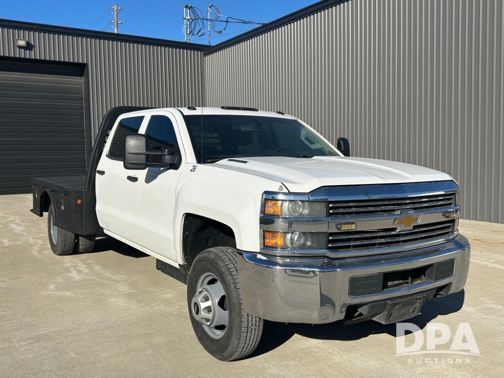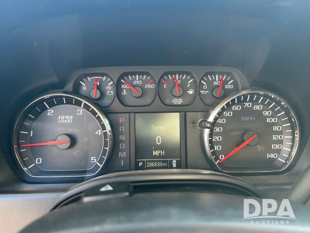 2015 Chevy Silverado 3500 Flatbed Truck (LLD1691, Unit 26), 6.6 Duramax diesel engine, *DELETED*, 4WD, Bluetooth, heat, air conditioning, skirted flatbed with tool boxes, shows 206,698 miles.