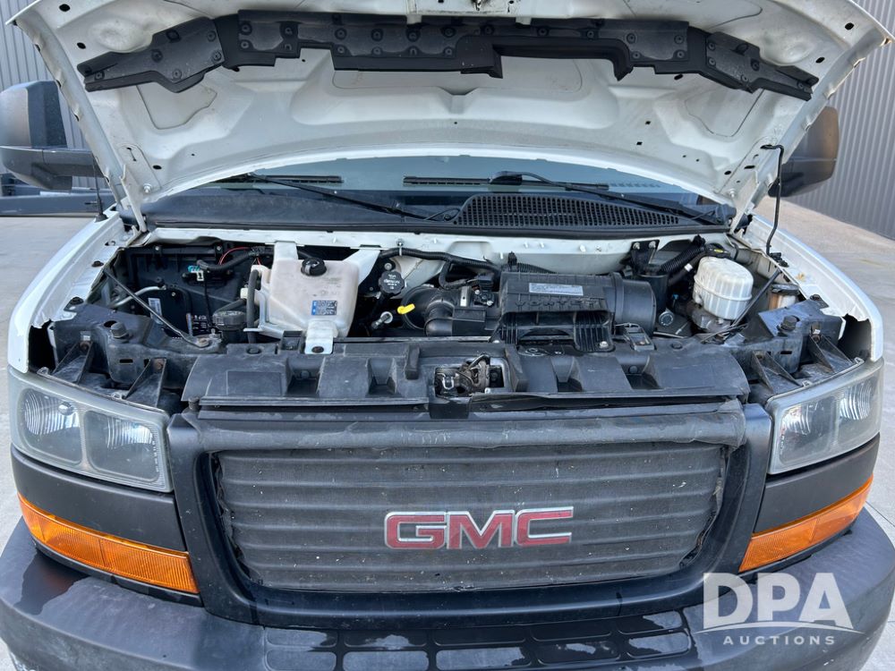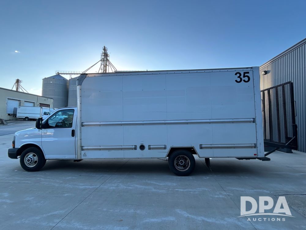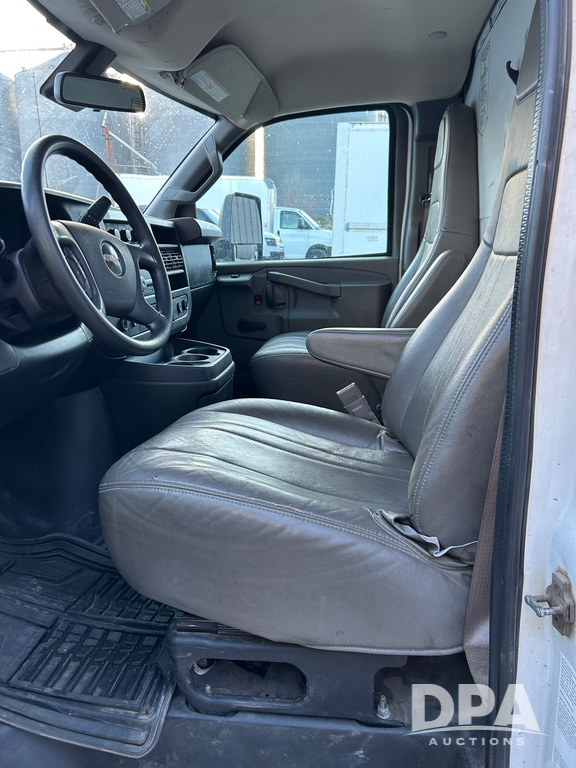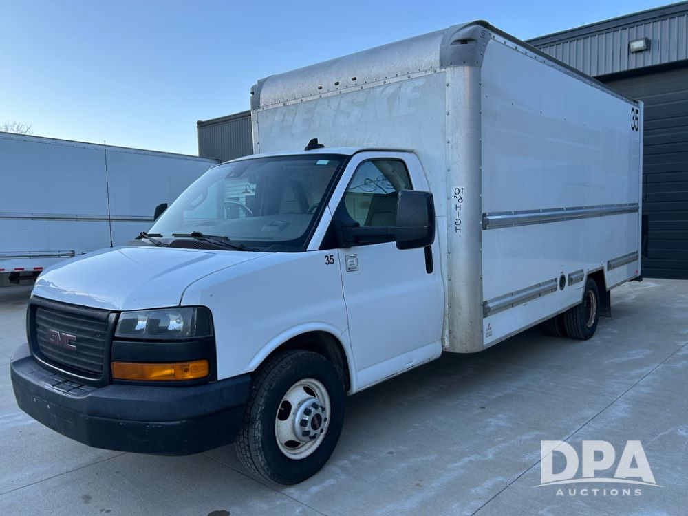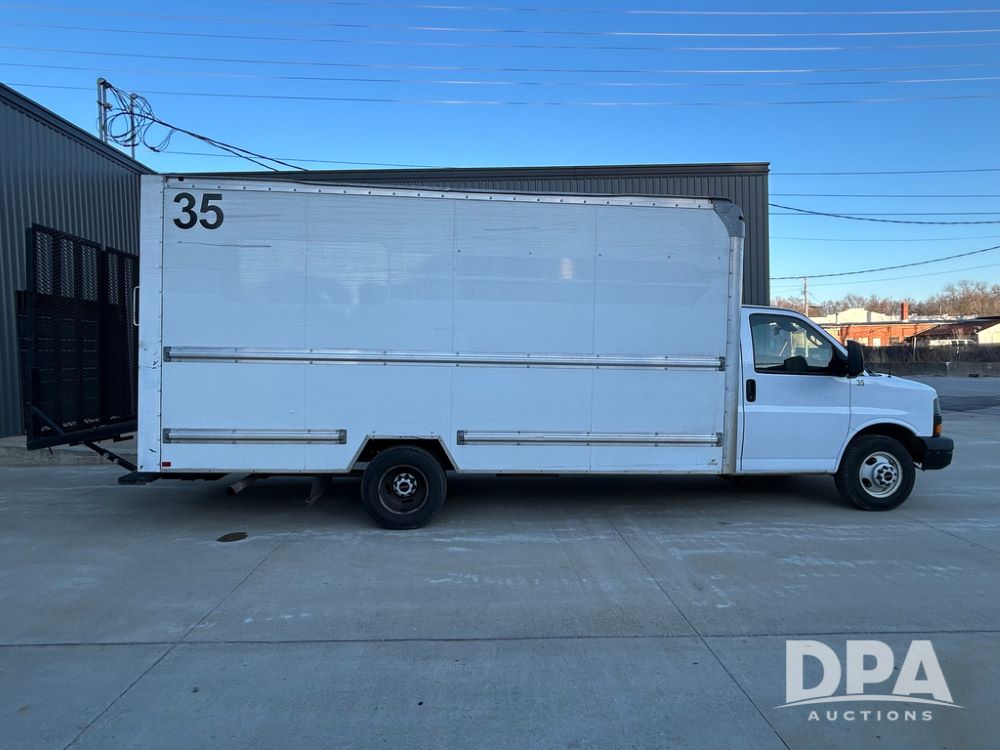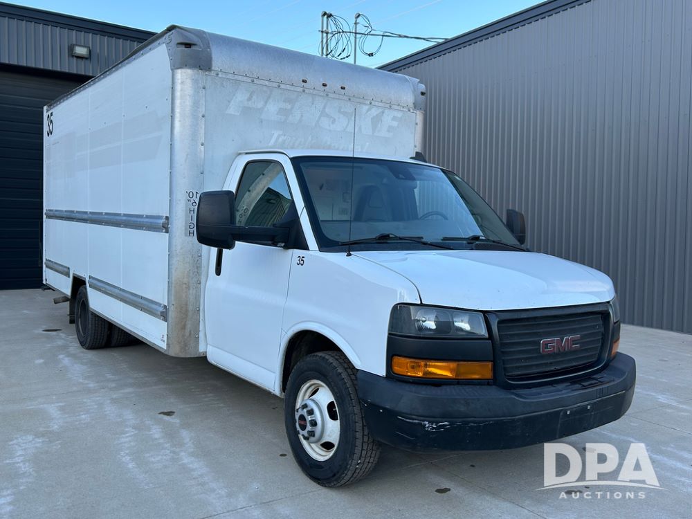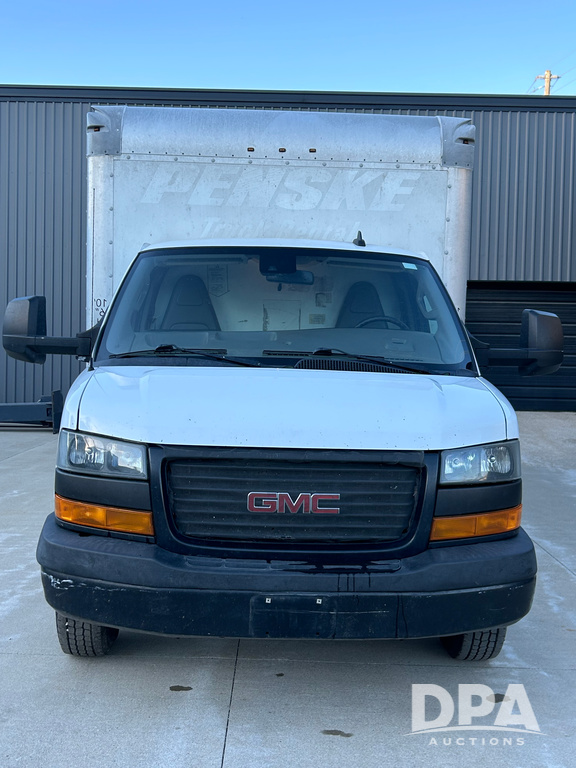 2019 GMC Savana 3500 Box Truck (LLD1693, Unit 35), gas engine, rear wheel drive, 16 foot box, dove tail/ramp (can be removed with 2 bolts and 1 pin), underbody pullout aluminum ramp, backup camera, power locks, cruise control, heat, air conditioning, 1 spare tire included, shows 172,551 miles.