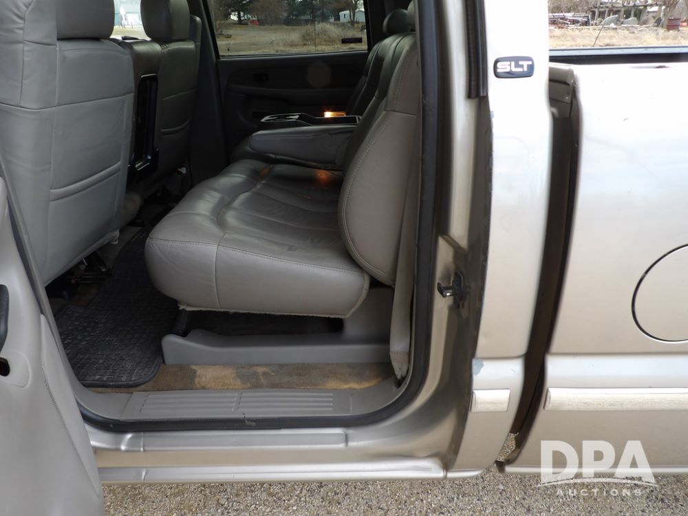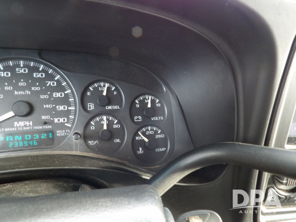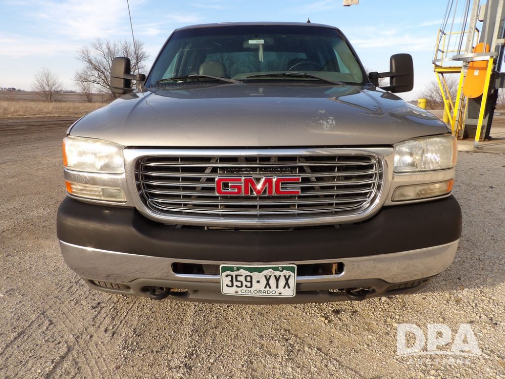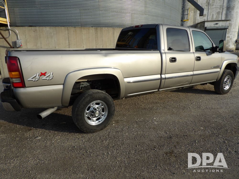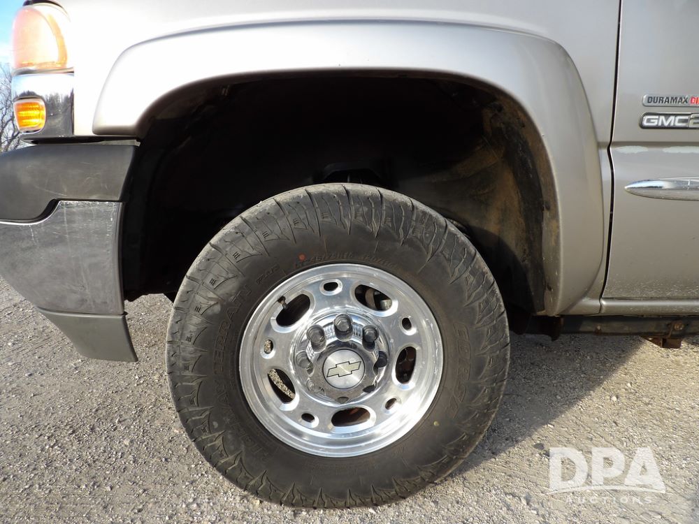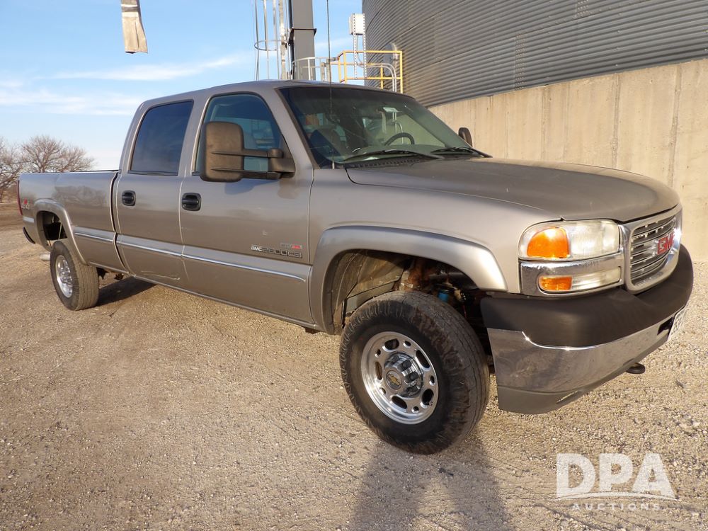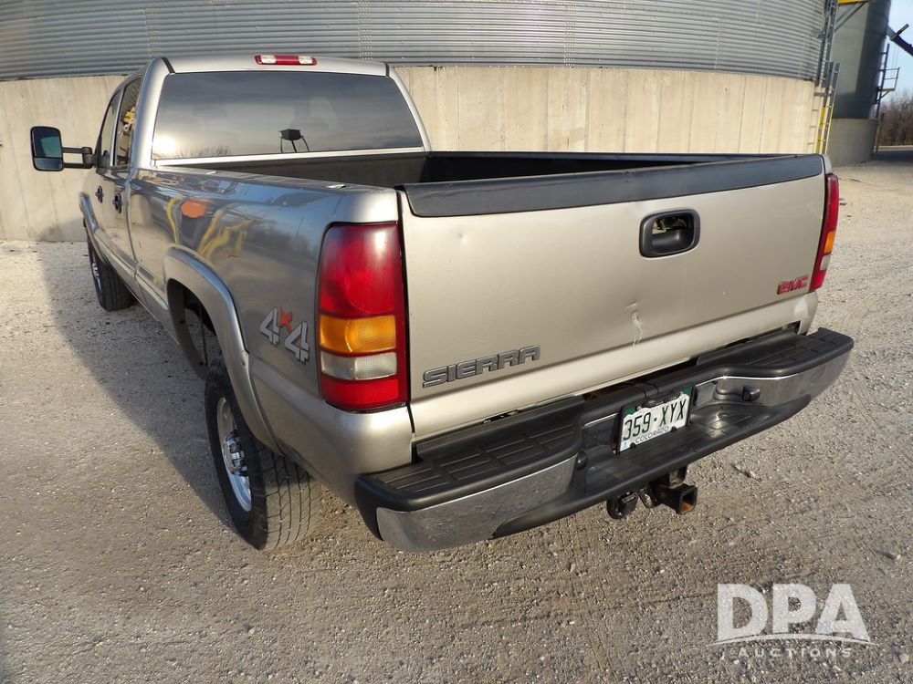 2002 GMC Sierra 2500 Duramax Pickup (ED5499), SLT, 4x4, 6.6L diesel, Allison automatic transmission, crew cab, air conditioning, heat, 6-way power seats, leather interior, AM/FM radio, back up camera, cruise control, power windows, power locks, rear defrost, power heated mirrors, locking differential 3.73 ratio, Die Hard batteries, B&W Turnover ball hitch, Silverado aluminum wheels, 245/75R16 tires, shows 238,938 miles.