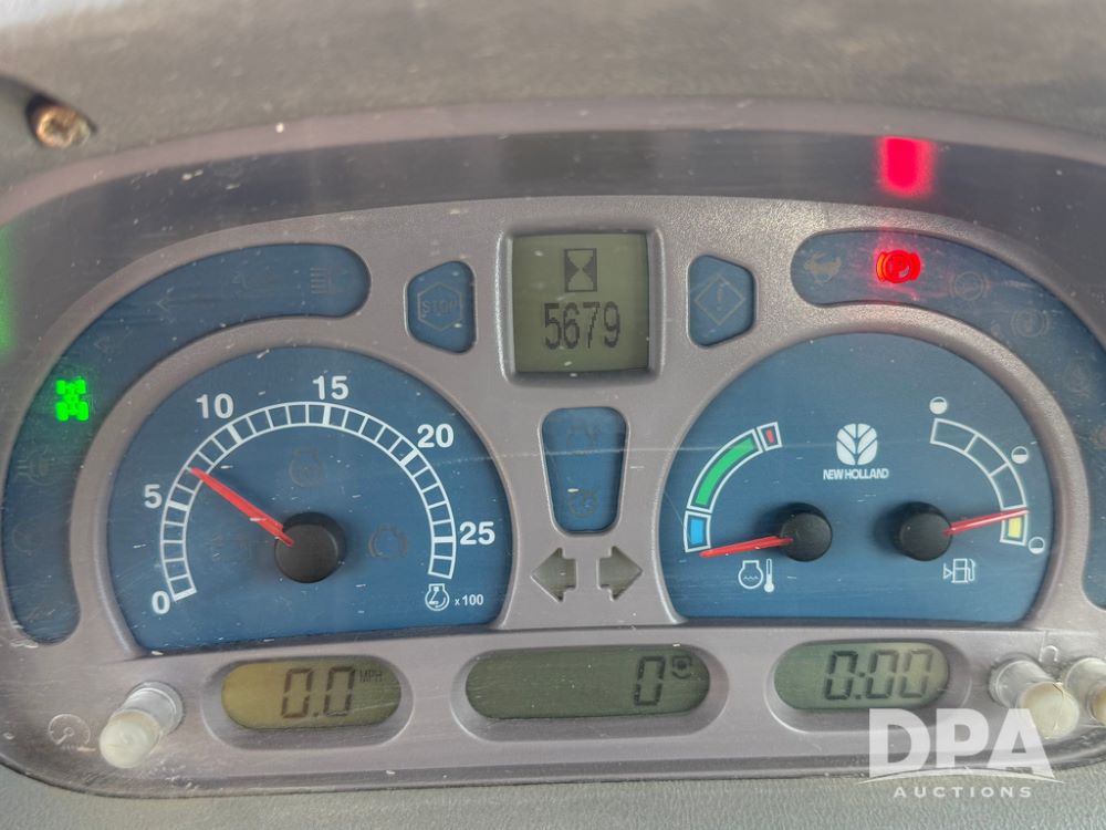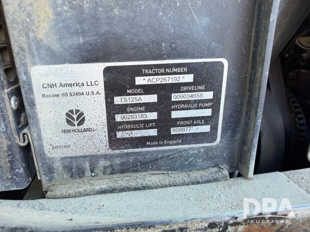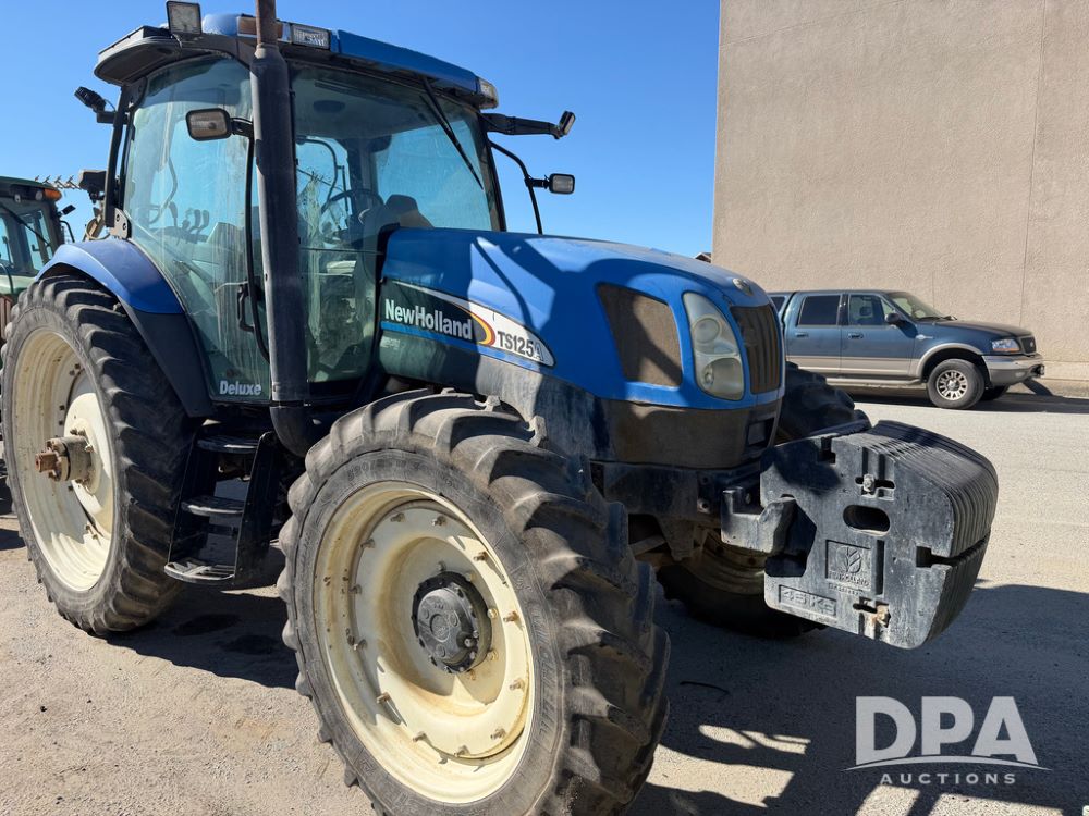 2008 New Holland TS125A Tractor (PZ14506, Unit 116349), diesel engine, Powershift transmission, cab, lights, air conditioning, heat, Am/Fm radio, 3-port hydraulics, PTO, 3-point, front weights, shows 5,679 hours.