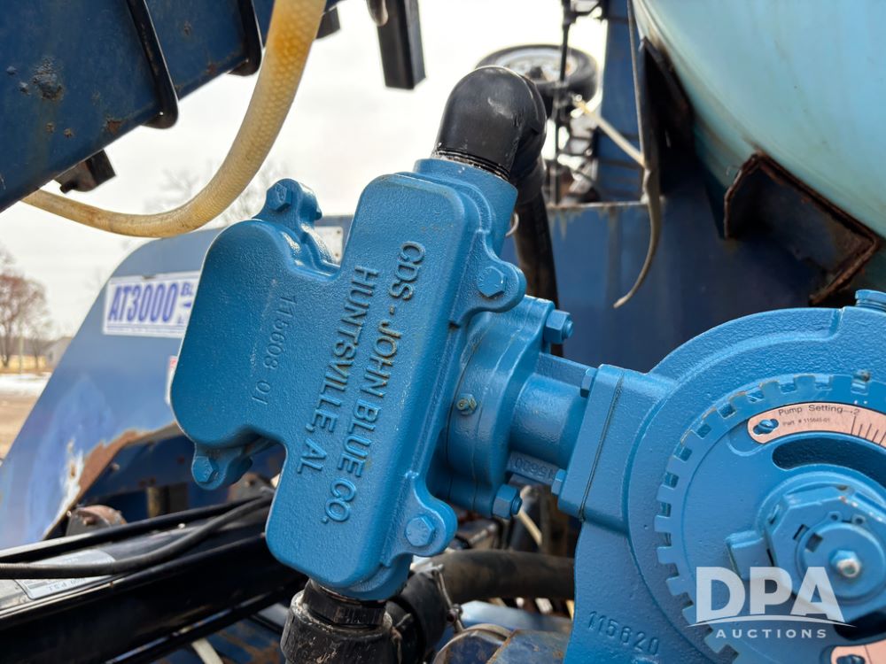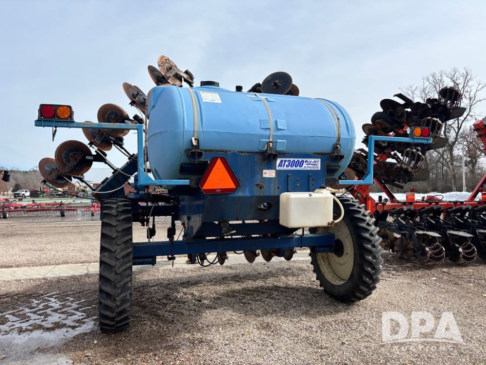 Blu-Jet AT3000 Applicator (DR13346 Unit 2178), 10 row double coulter side dress liquid applicator, John Blue ground drive pump, 1000 gallon poly liquid tank, hydraulic fold, manual gauge wheels, 12.4-38 row crop tires.
