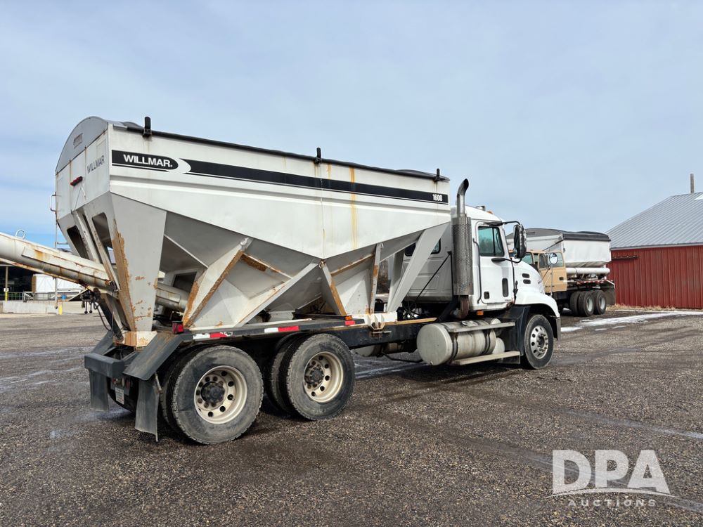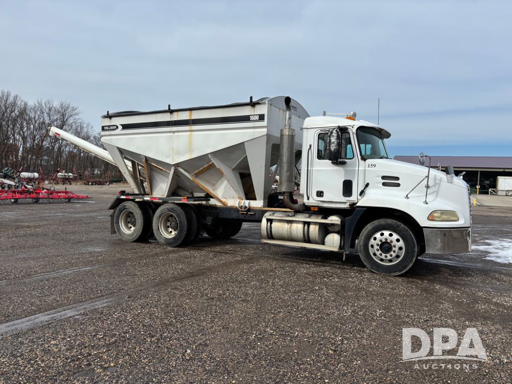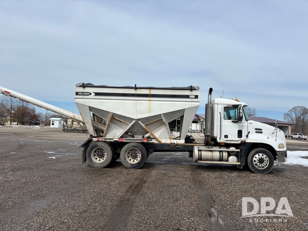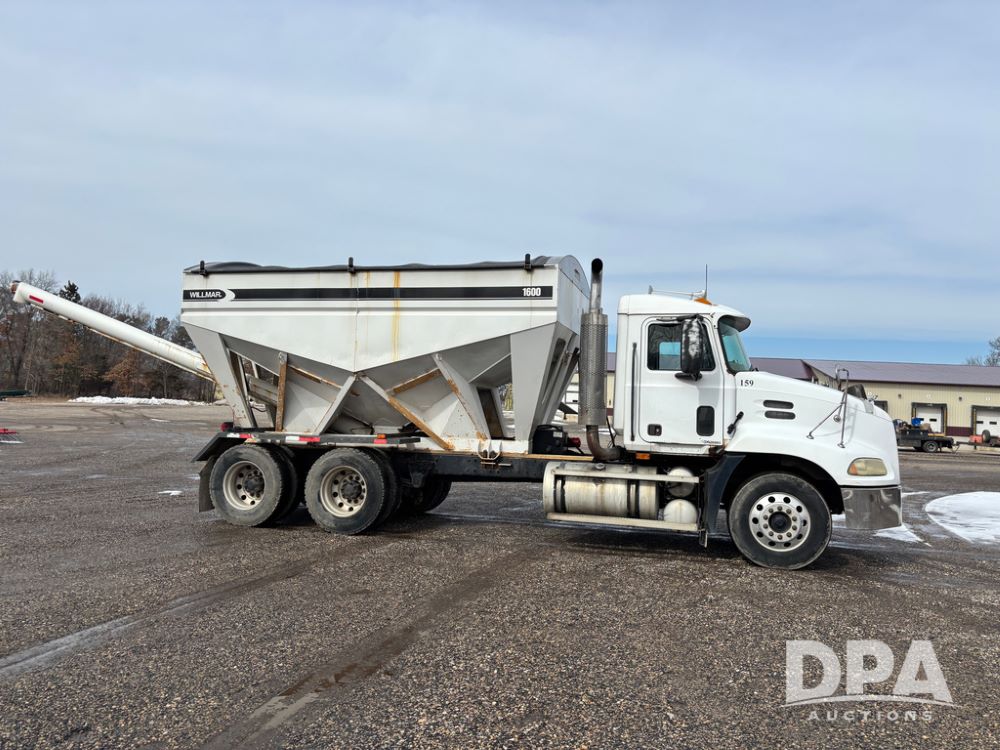 2001 Mack Vision Dry Truck (DR13363 Unit 159), Mack diesel engine, 10 speed transmission, tandem axle full screw, air ride suspension, Willmar 1600 stainless steel hydraulic dry tender box, rear discharge auger, electric roll tarp, dual aluminum fuel tanks, engine brake, cruise control, cab heat/air conditioning, 22.5 tires, all aluminum wheels.