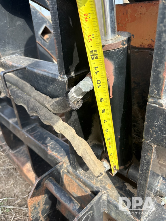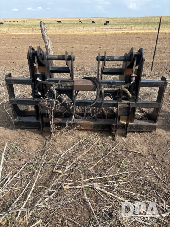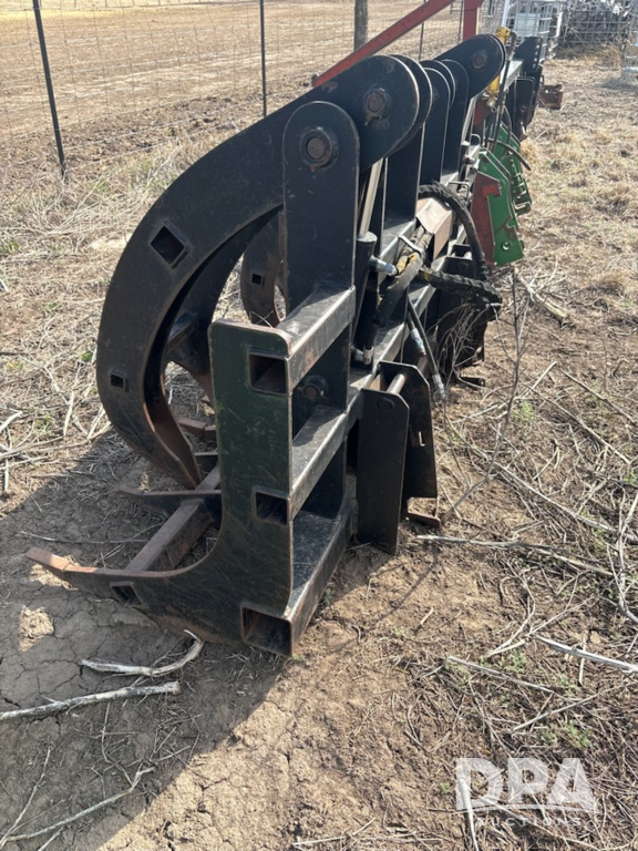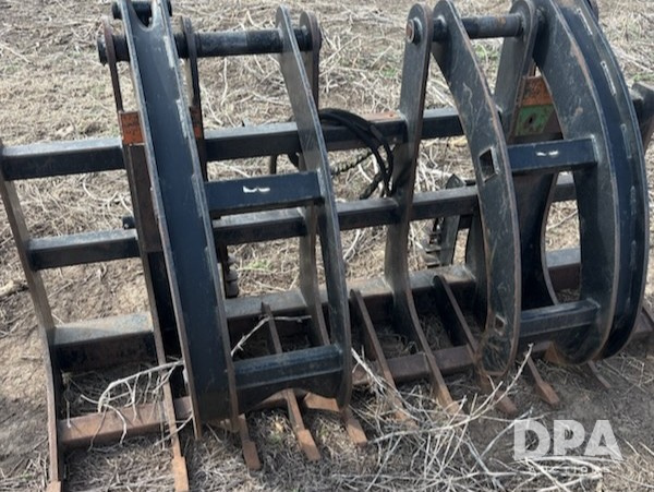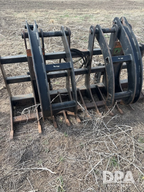 Hydraulic Grapple Bucket (JM773), dual grapple arms, strong, thick tines, hydraulic lines intact, universal skid steer quick-attach hookup.