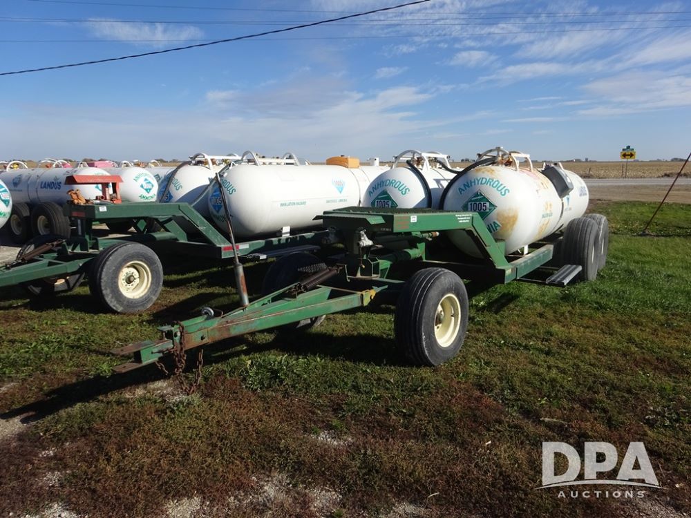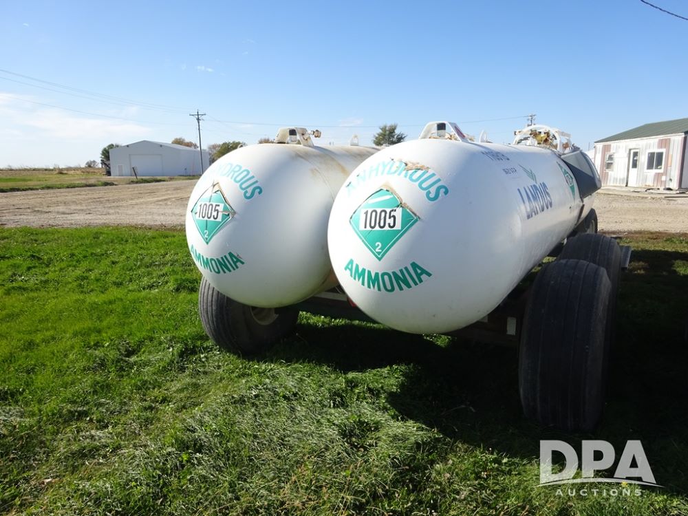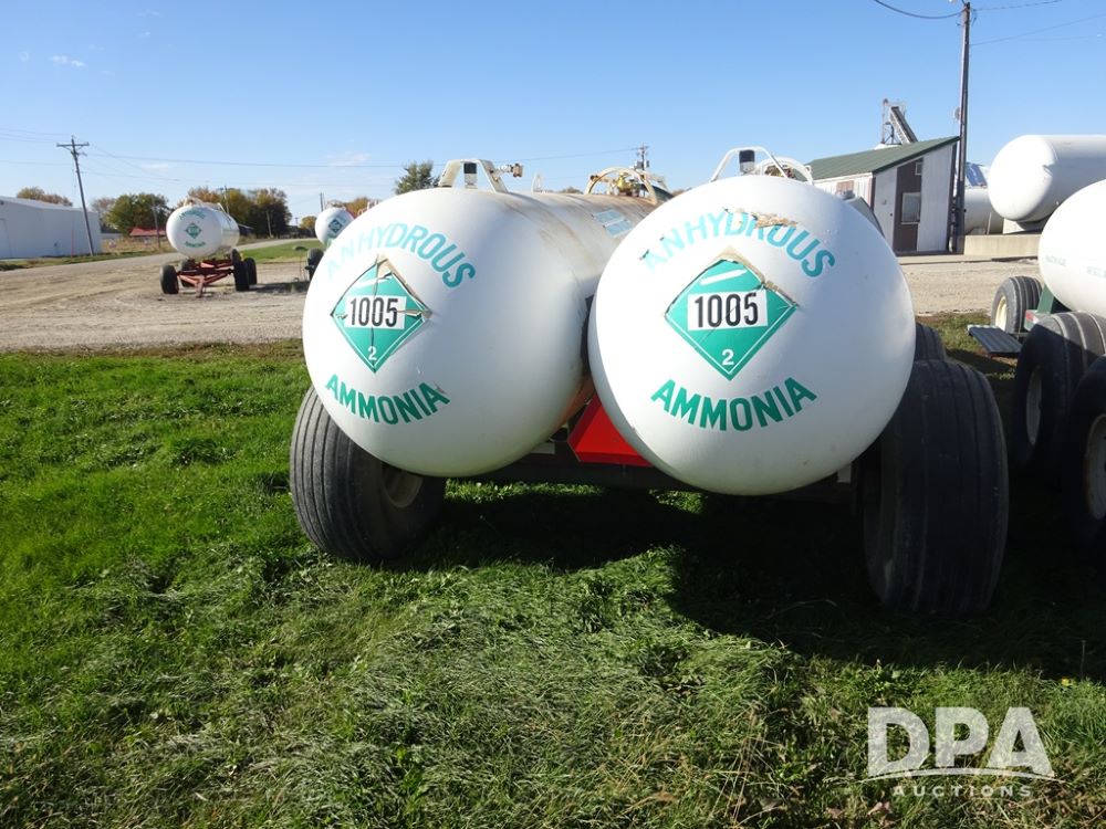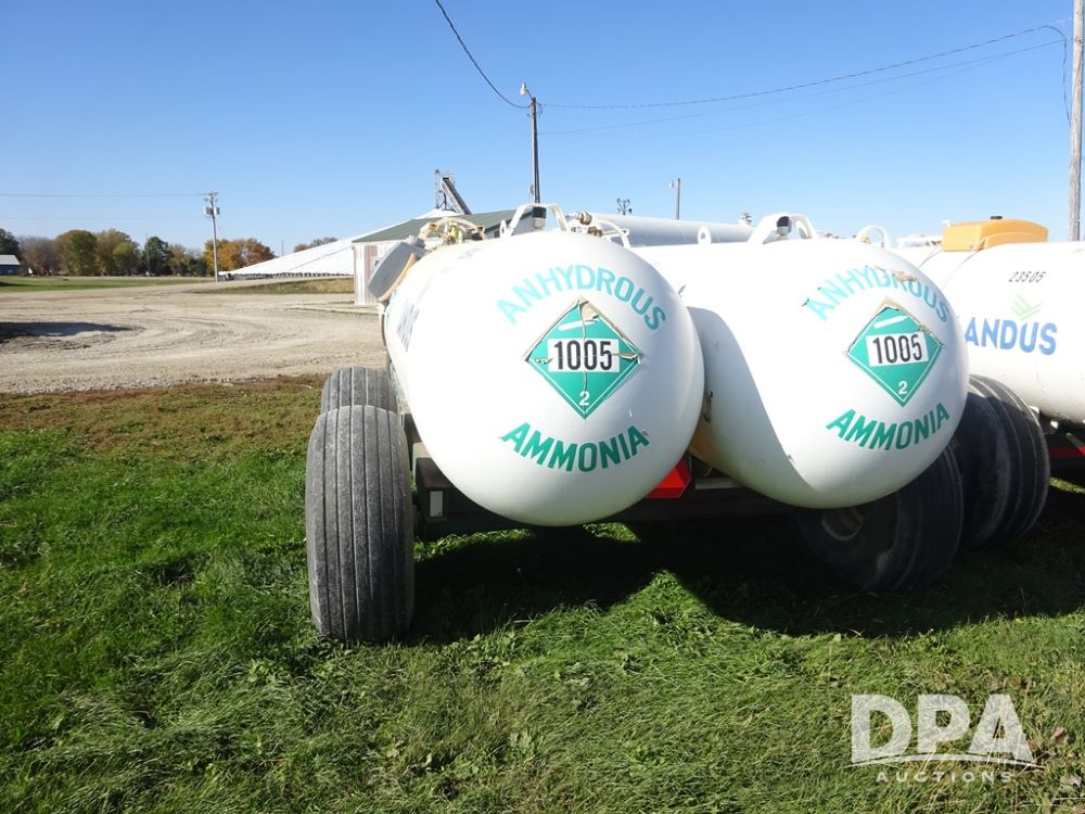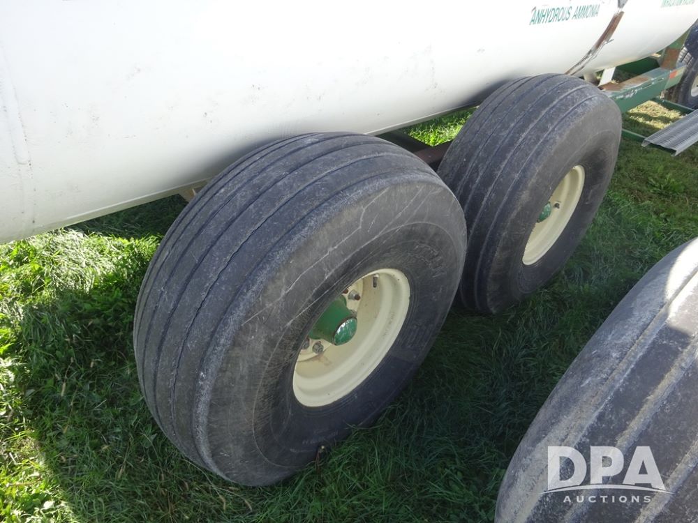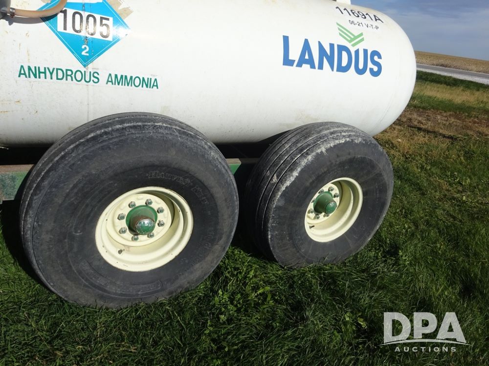 Double NH3 Nurse Tanks (PZ14162, Unit 11691), Double Trinity 1000 gallon NH3 nurse tanks, top front fills, poly water tank, data plates, 6-21 VPT, Vosberg 6WLGP 5th wheel tandem axle running gear, spring tongue, side steps, 12.5L-15SL front flotation tires, 16.5L-16.1SL rear flotation tires.