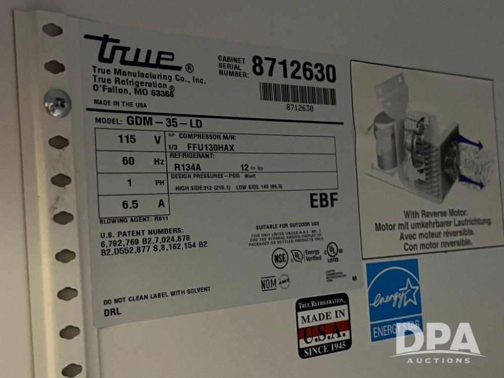 TRUE Manufacturing Standup Refrigerator (JN4142), TRUE Manufacturing stand up refrigerator, Model GDM-35-LD, 115 volts, 60 Hz, single phase, 2 doors.