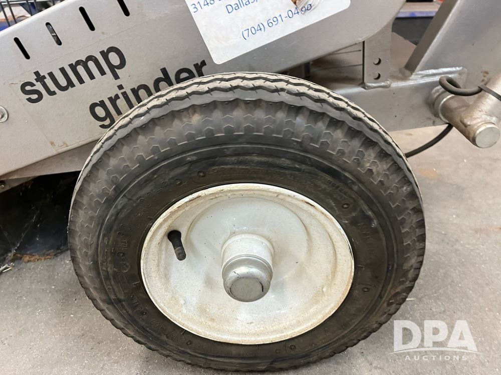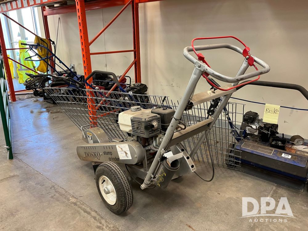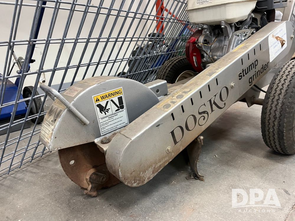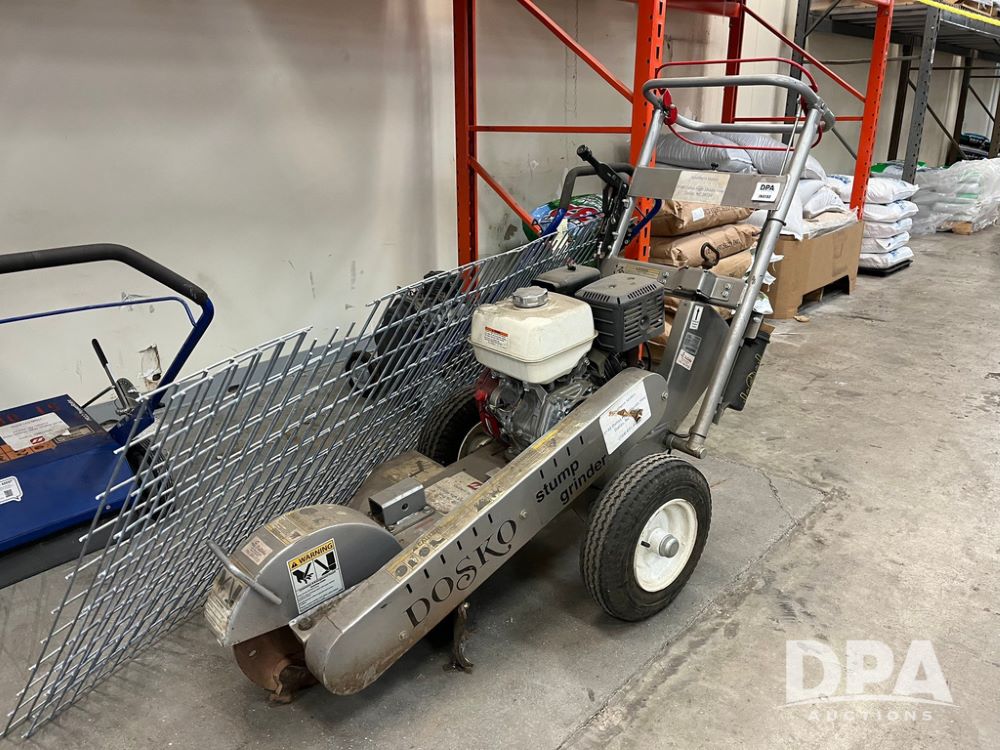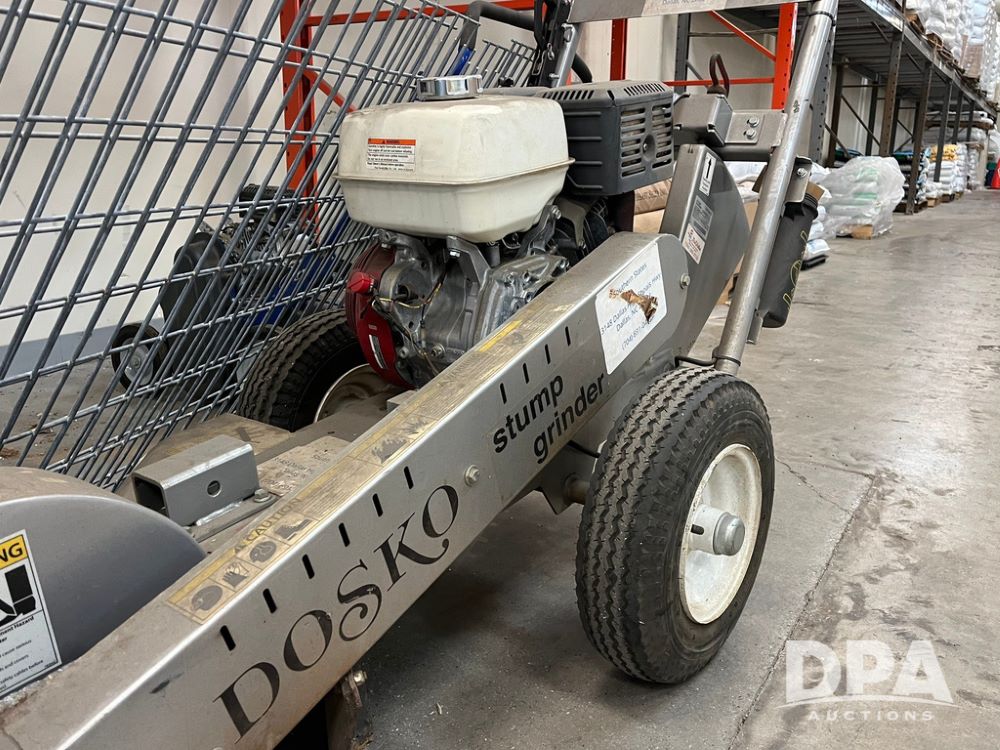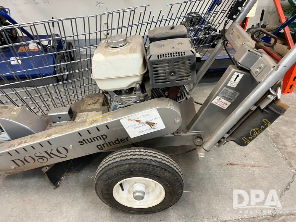 Dosko Stump Grinder (JN4144), Dosko Model 337-13HC stump grinder, 3600 operating RPM, stump grinder, walk behind, Honda GX390 gas motor, 4.80/4.00-8 front tires, dry machine mass 300 pounds.