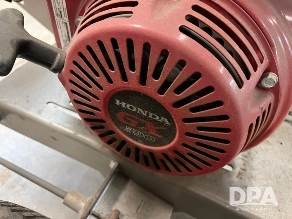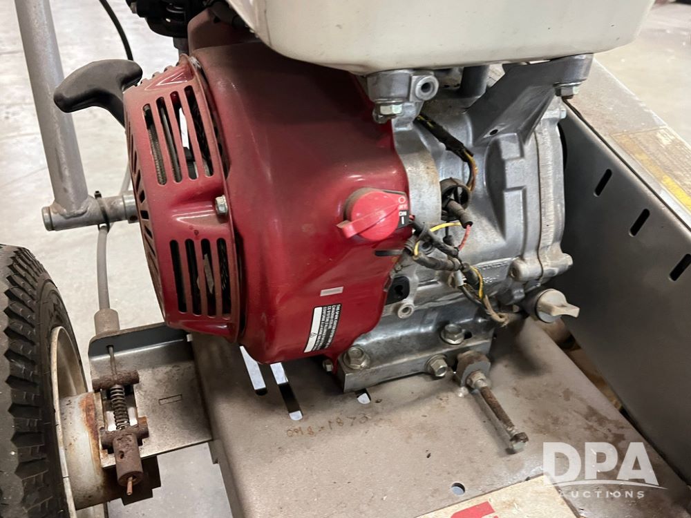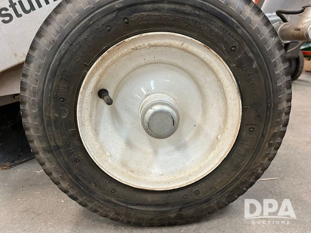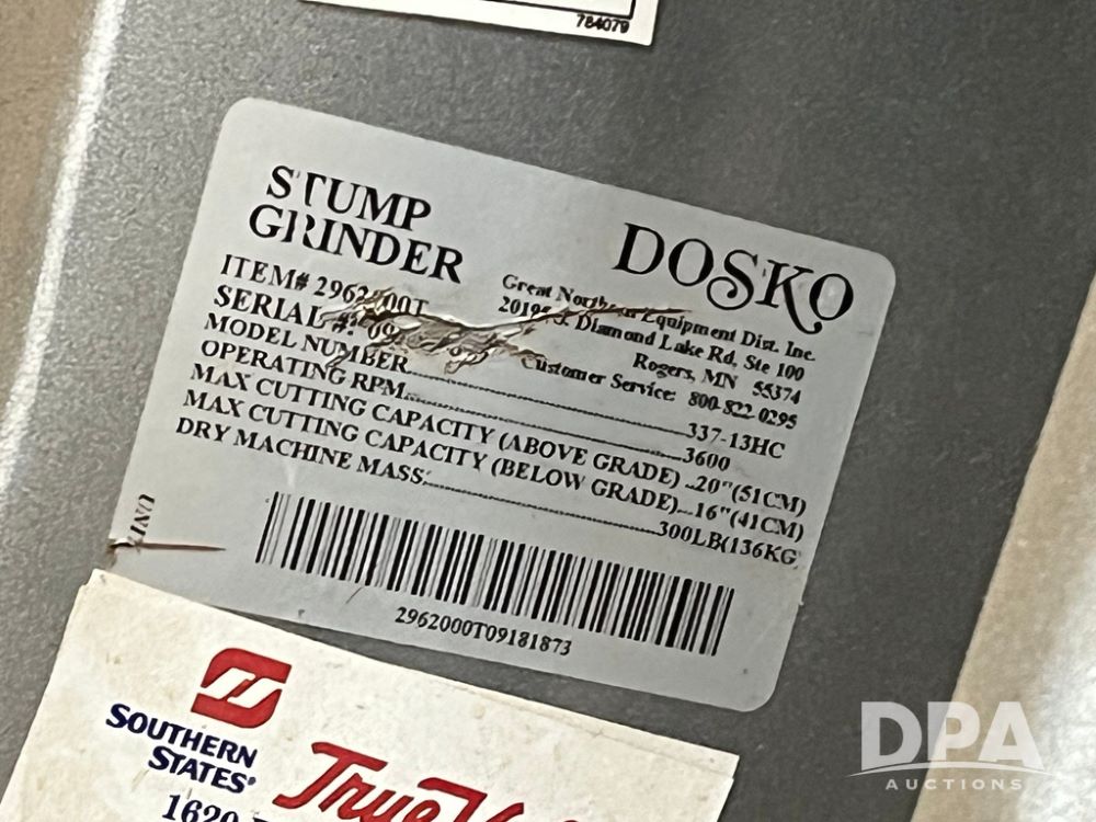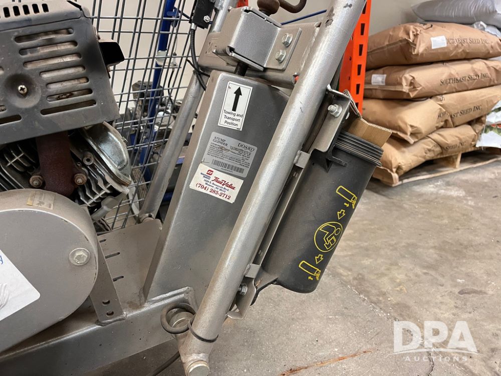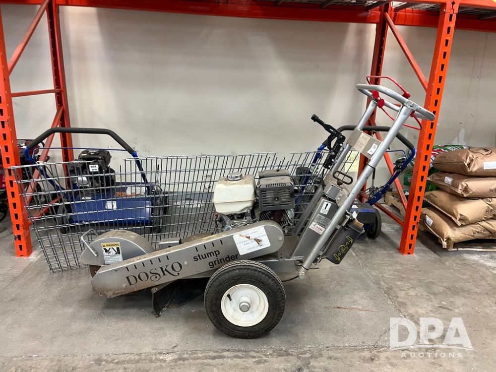 Dosko Stump Grinder (JN4144), Dosko Model 337-13HC stump grinder, 3600 operating RPM, stump grinder, walk behind, Honda GX390 gas motor, 4.80/4.00-8 front tires, dry machine mass 300 pounds.