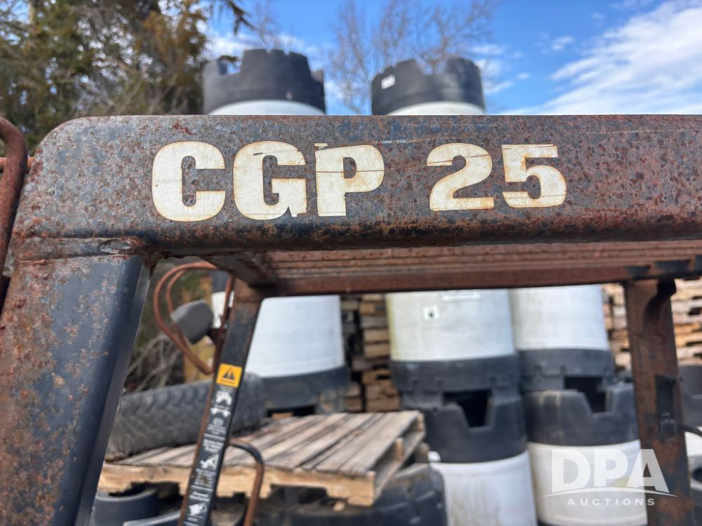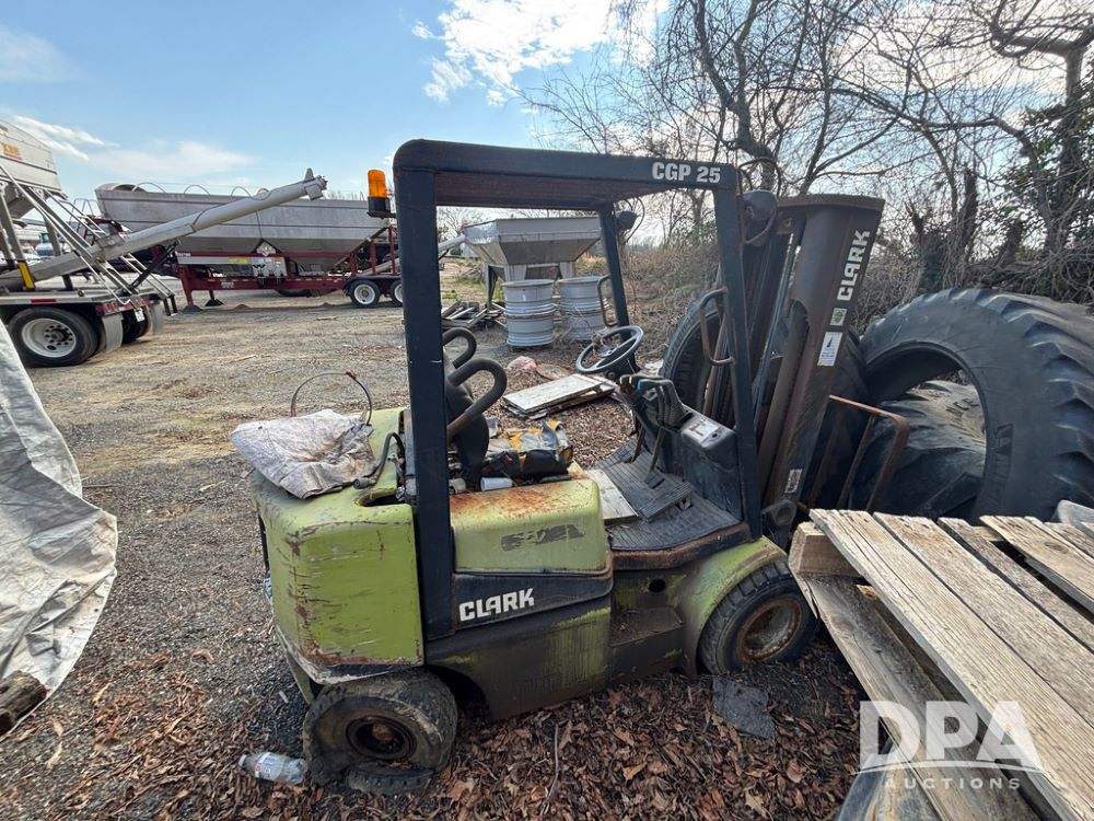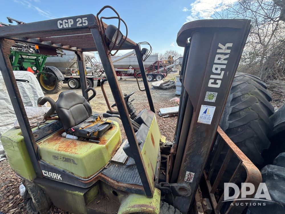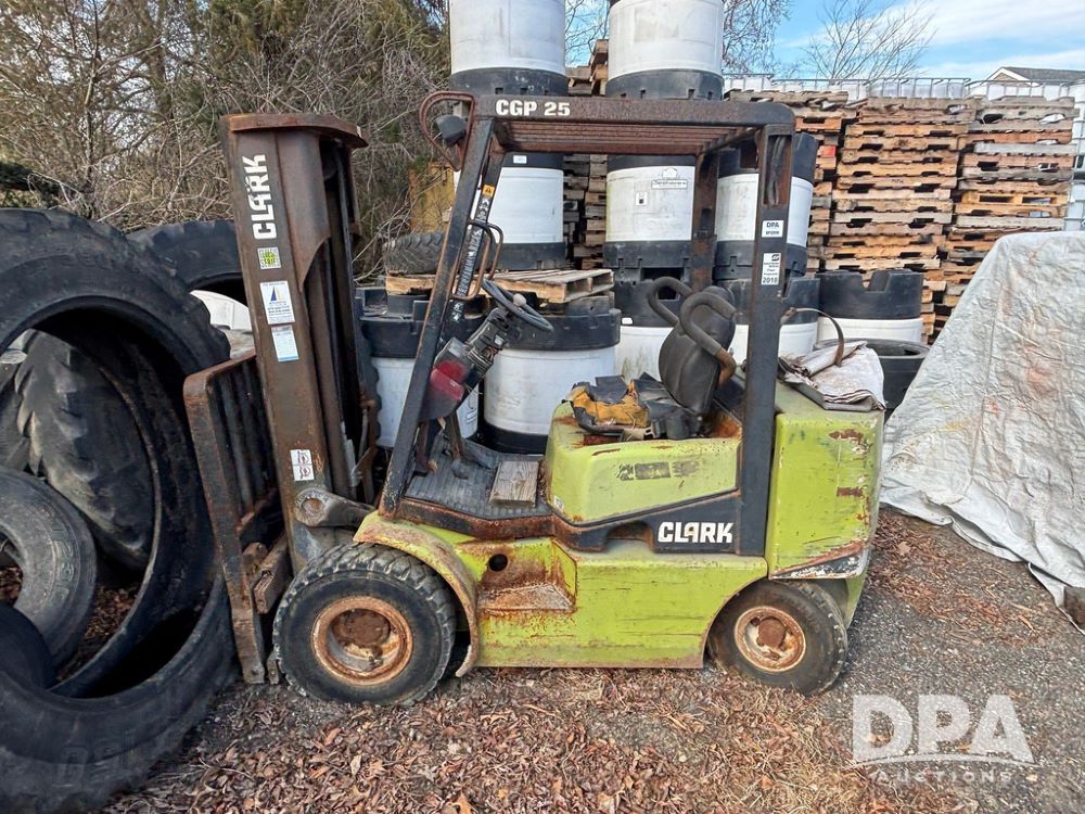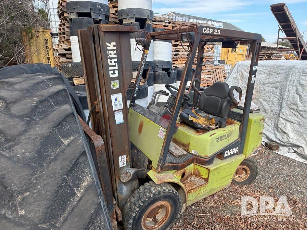 Clark CGP25 Forklift (GP12916), LP gas, shuttle shift, forks, 7.00-12 front tires, 6.00-9 rear tires (1 BLOWN), truck weight 8,945 pounds.
