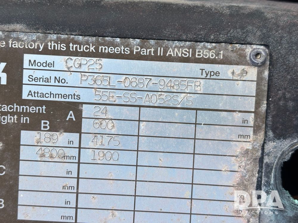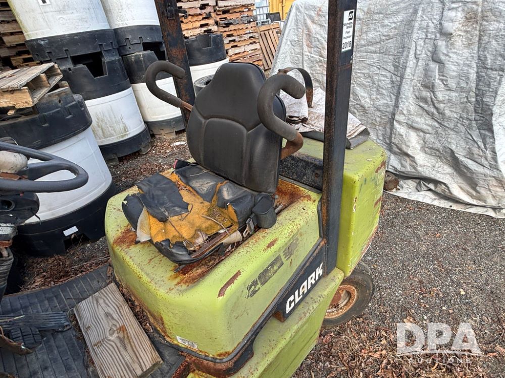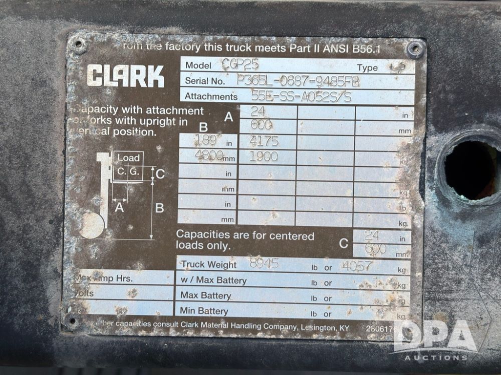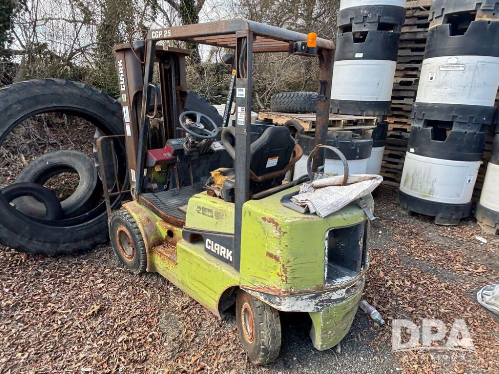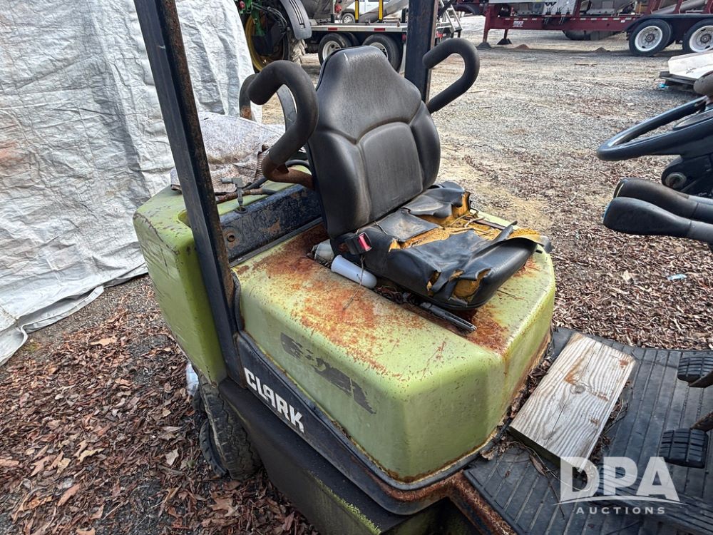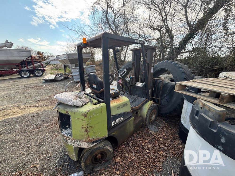 Clark CGP25 Forklift (GP12916), LP gas, shuttle shift, forks, 7.00-12 front tires, 6.00-9 rear tires (1 BLOWN), truck weight 8,945 pounds.
