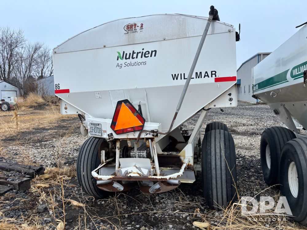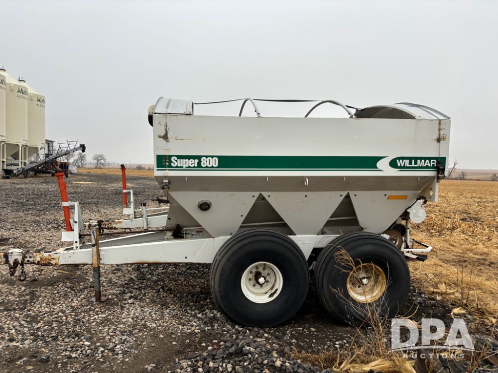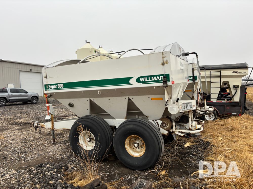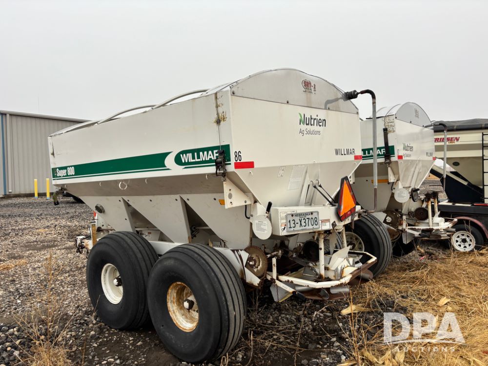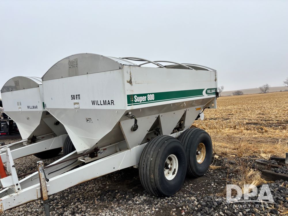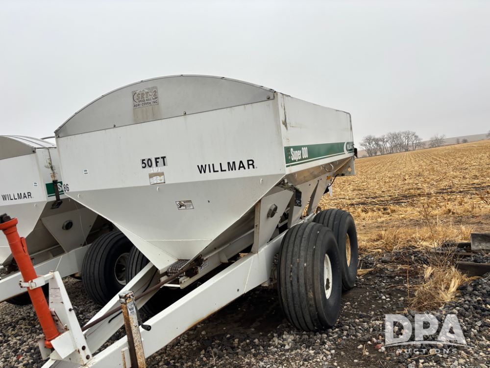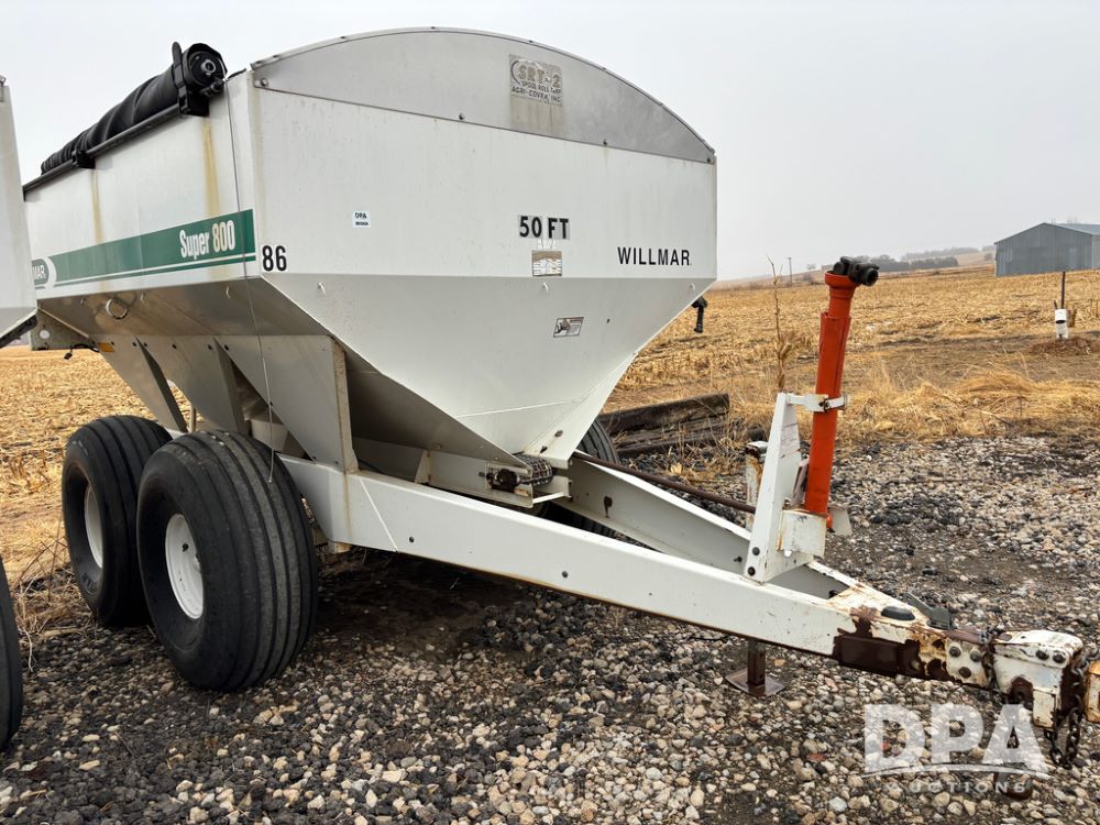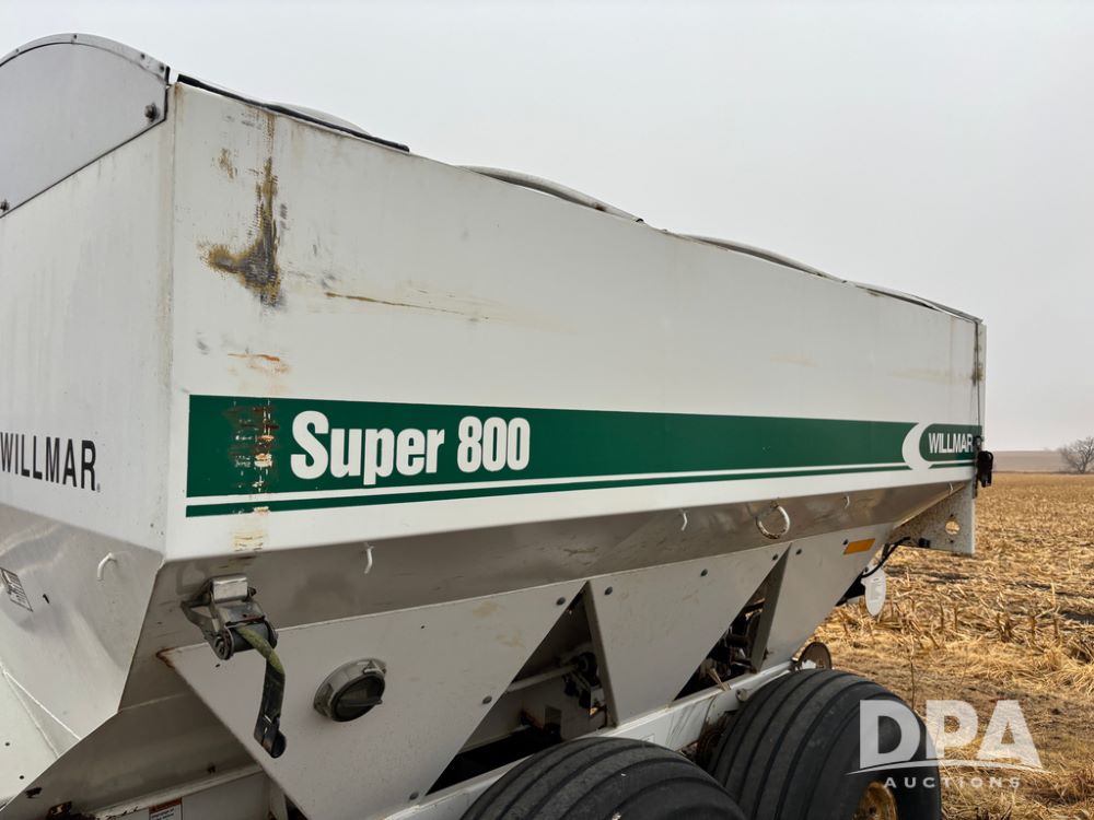 Willmar Spreader Buggy (DR13434 Unit 79754), Super 800 model, stainless steel dry spreader, dual PTO drive rear spinner pans, 50' pattern, 2 speed ground drive web chain, roll tarp needs work, tandem axle, 19L-16.1 tires.