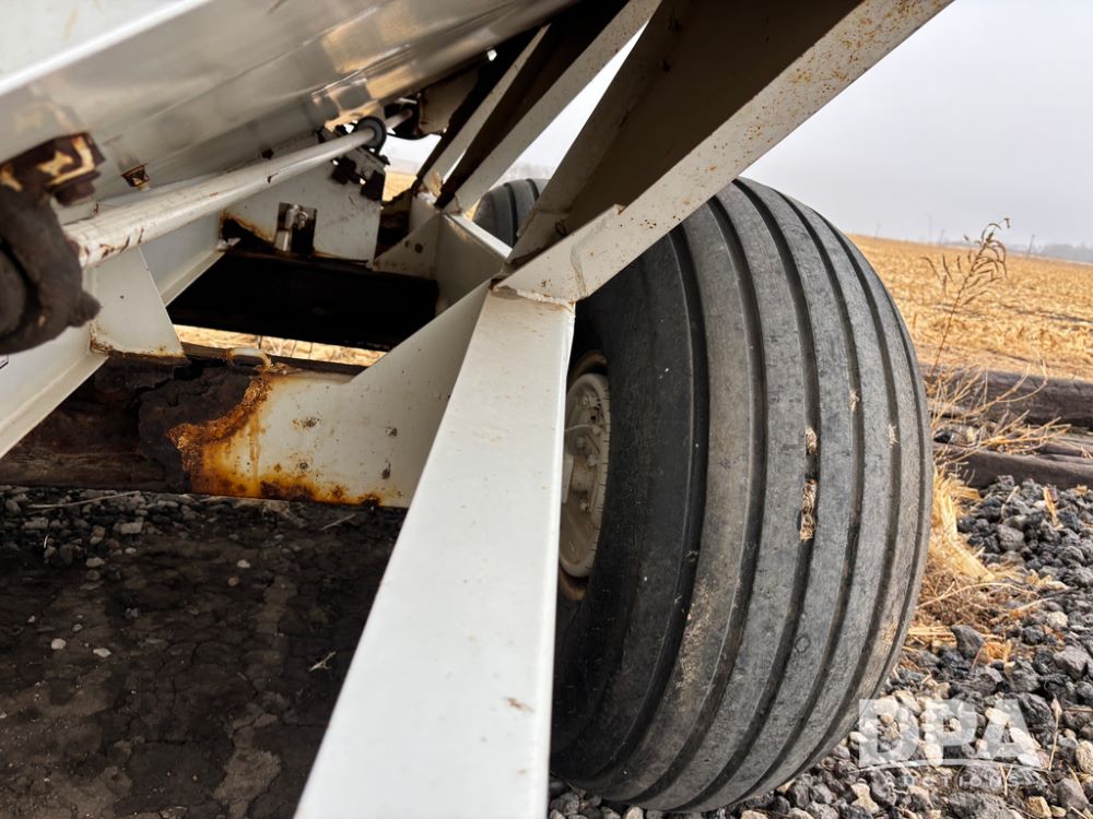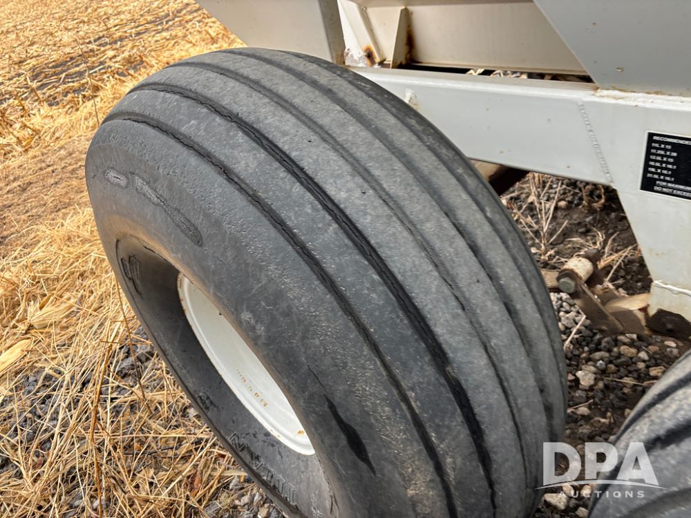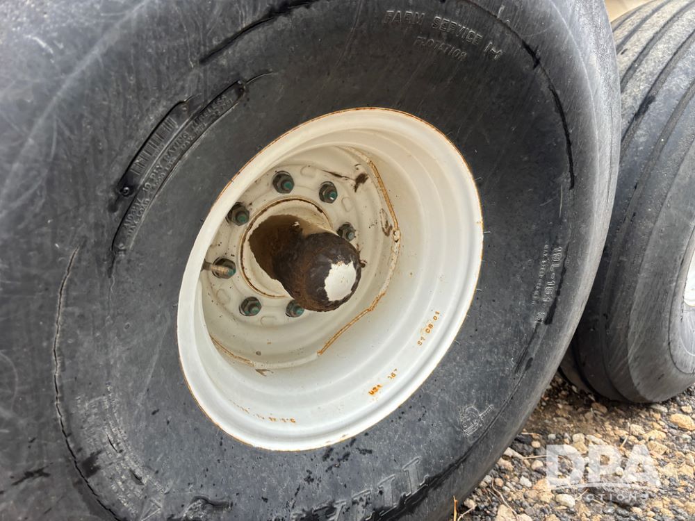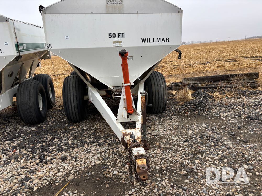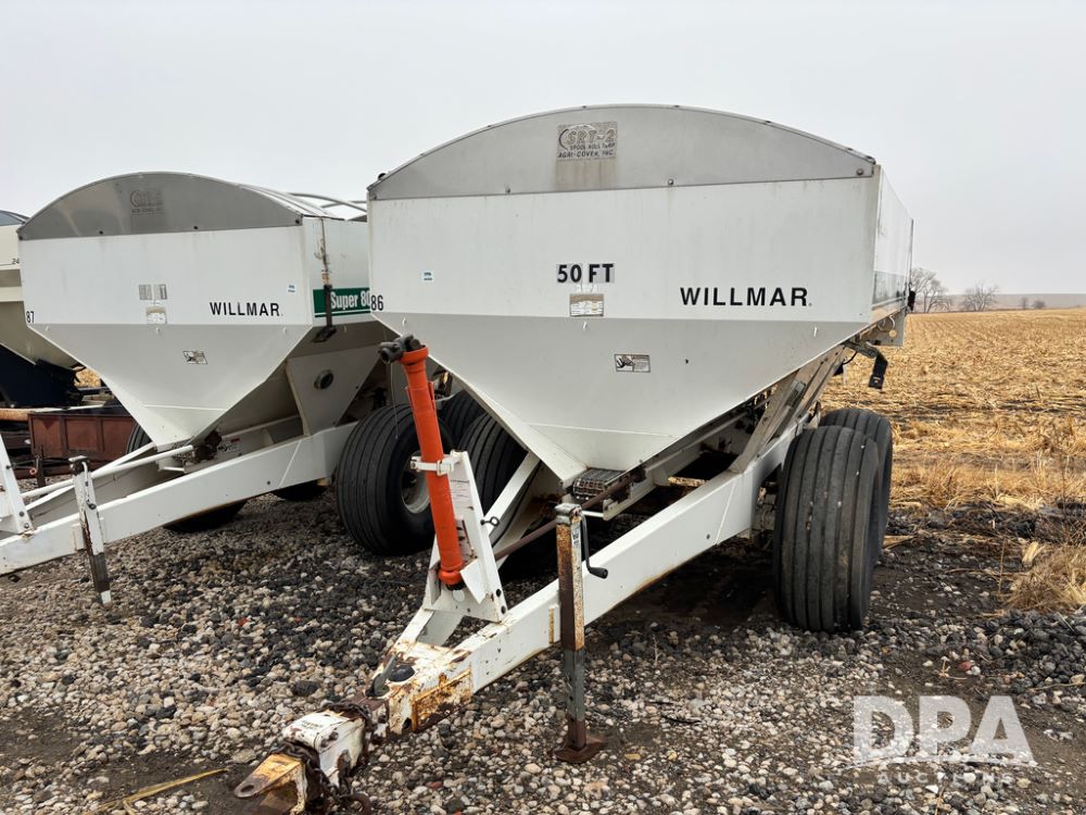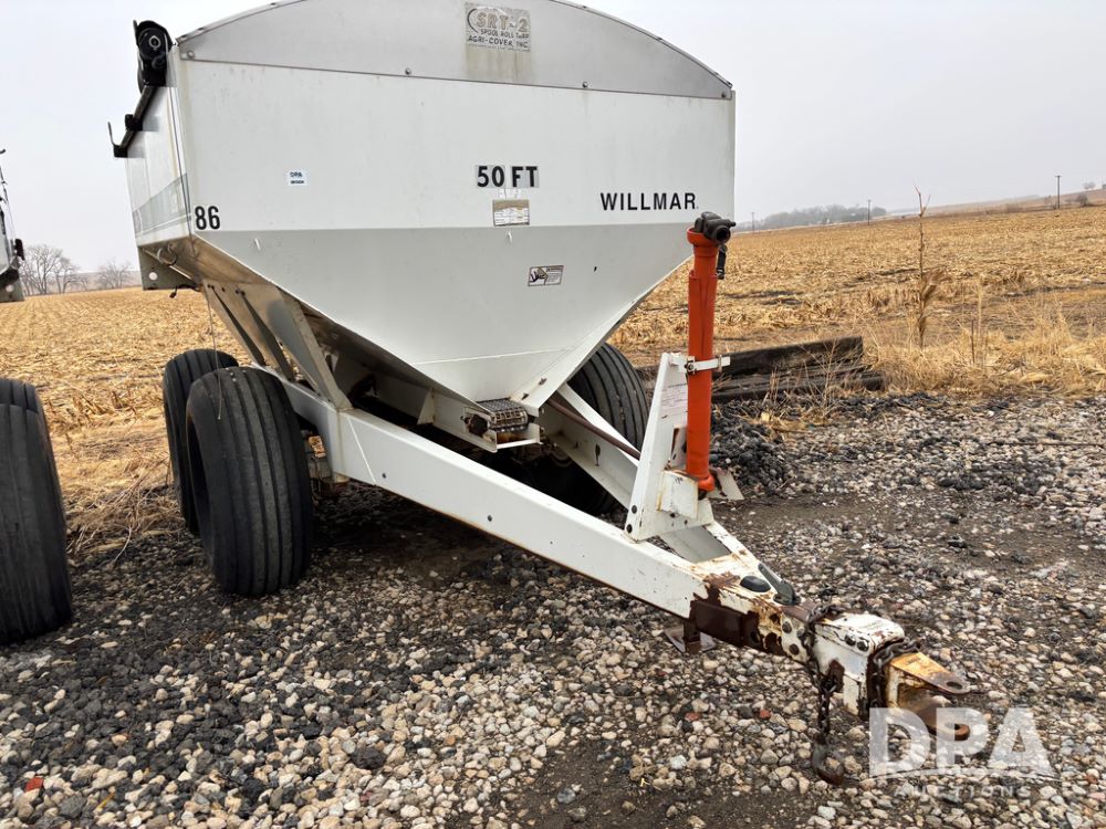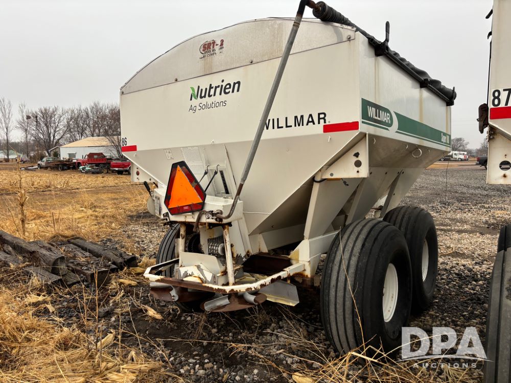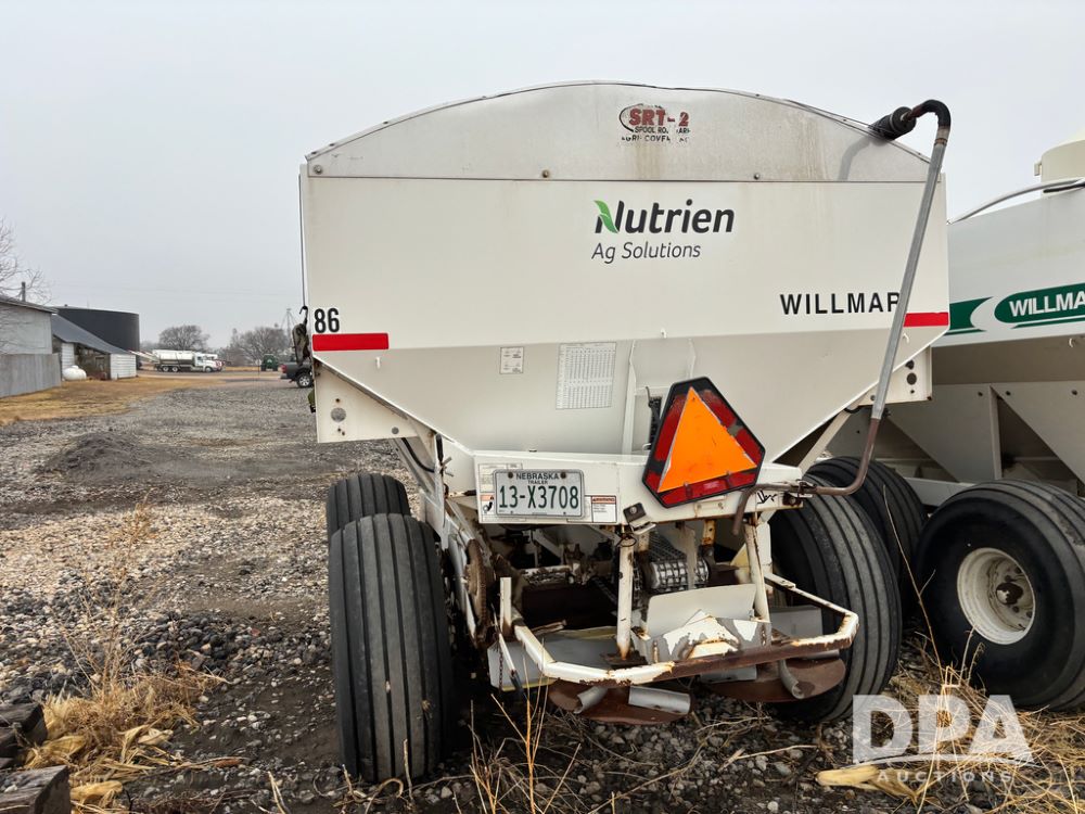 Willmar Spreader Buggy (DR13434 Unit 79754), Super 800 model, stainless steel dry spreader, dual PTO drive rear spinner pans, 50' pattern, 2 speed ground drive web chain, roll tarp needs work, tandem axle, 19L-16.1 tires.