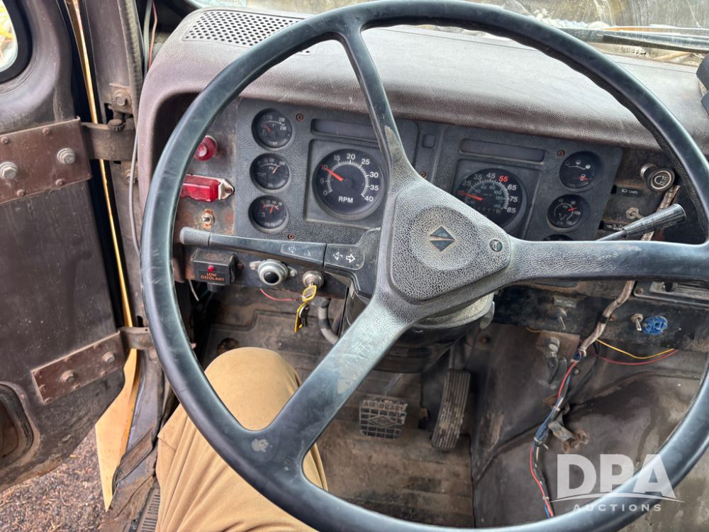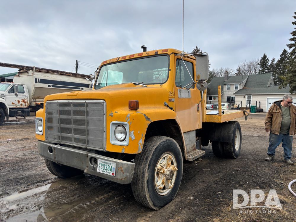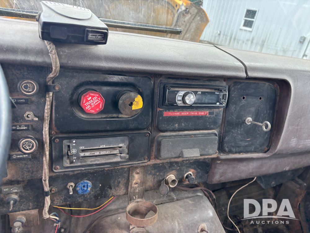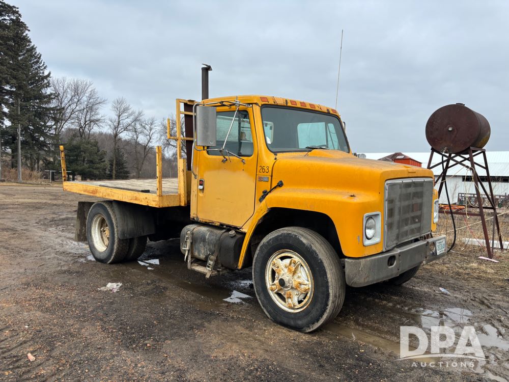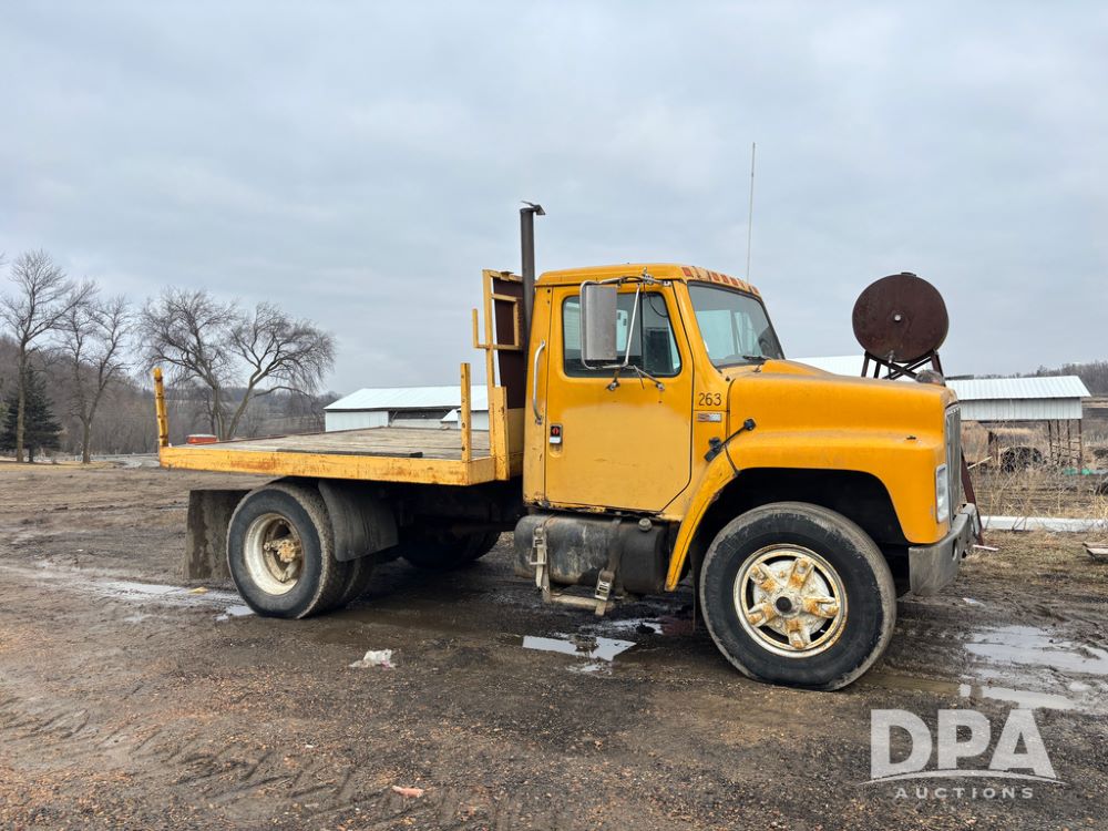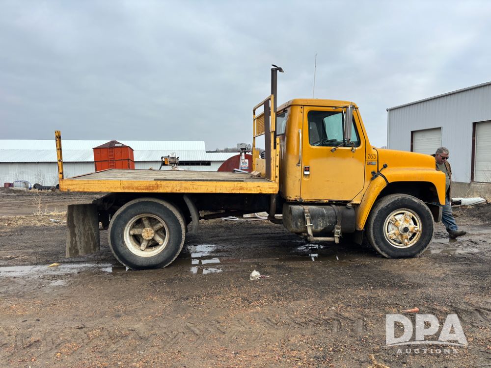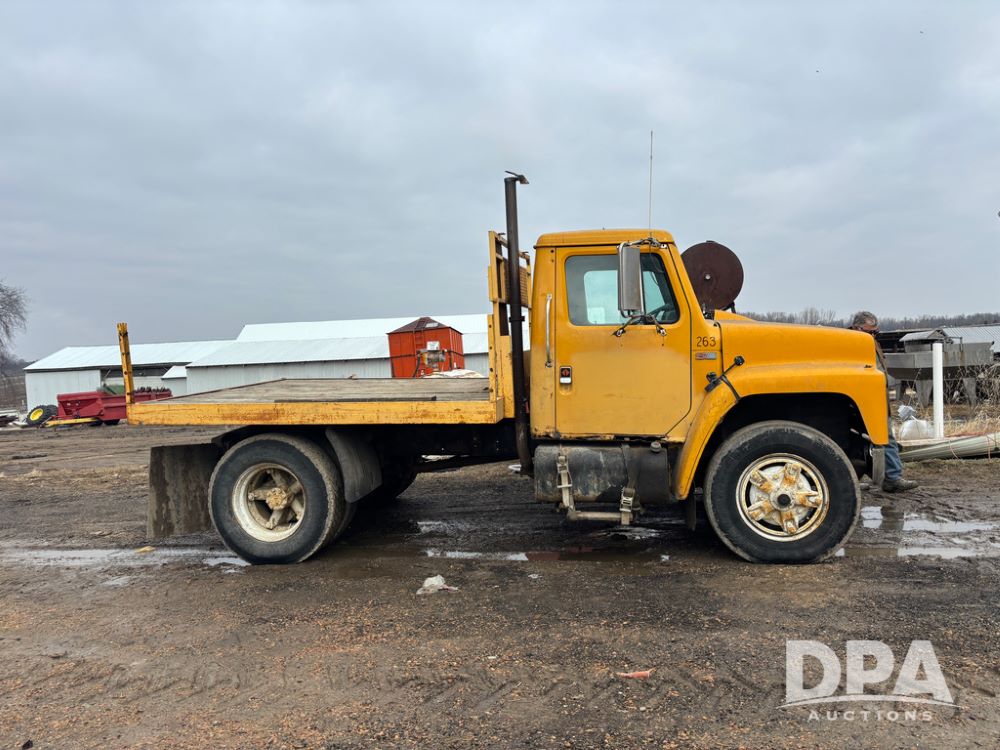 1989 International S Series (DR13412), DT diesel engine, 4 speed transmission, single axle, air brakes, 5th plate, 9' wood deck flatbed hooks on 5th wheel, glad hand air brakes, rear pintle hitch, odometer reads 456,077 miles.